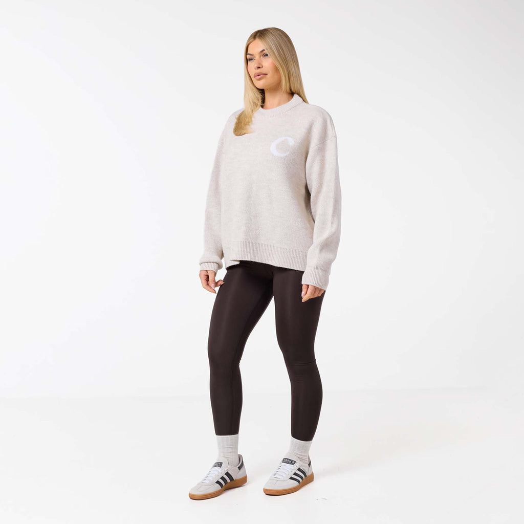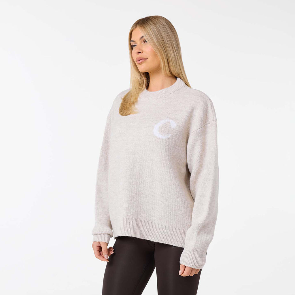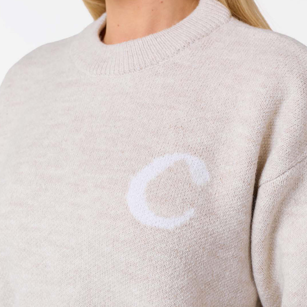 Elevate your casual collection with the Closure London Women's Initial Knit Crew Neck in a neutral oat shade. Discover the perfect mix of authentic vintage charm and contemporary comfort in this season's essential. It features a classic crew neck and a refined finish with coordinating rib neck trim, cuffs, and hem. The subtle 'C' initial chest logo instantly brings an iconic, effortlessly cool vibe to your look, making it ideal for both laid-back days and stylish errands.