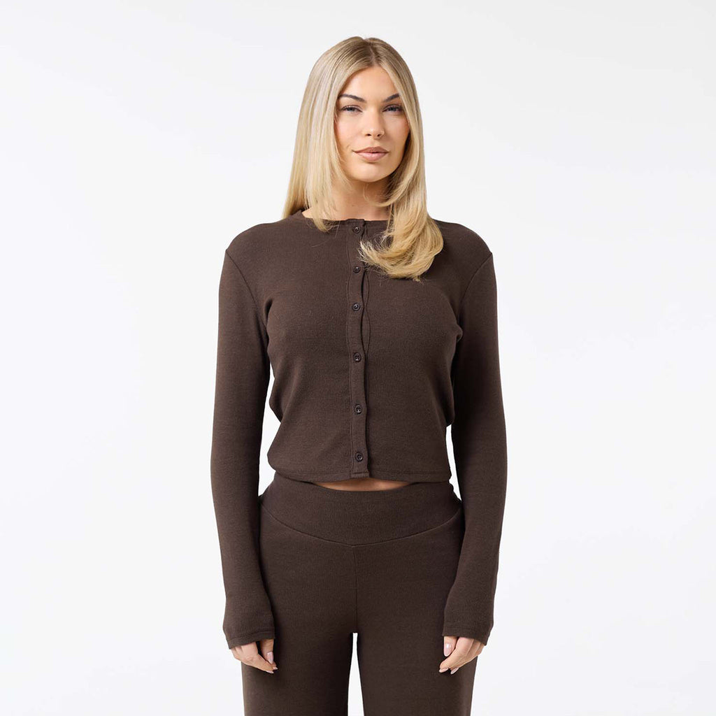 Meet your new go-to for effortless style: the Ribbed Twinset in a warm coffee shade. This coordinated set includes the Ribbed Button-Up Top and matching Ribbed Open Hem Pants. The top features a soft, stretchy ribbed fabric with long sleeves, a crew neck, and a button-down front, all finished with a durable twin needle stitch. The pants have a comfy waistband and a flattering open hem, complete with a twin needle hem stitch for a polished look. Perfect for a cosy chilled day or styled up for your social calendar, this twinset offers both comfort and chic design.