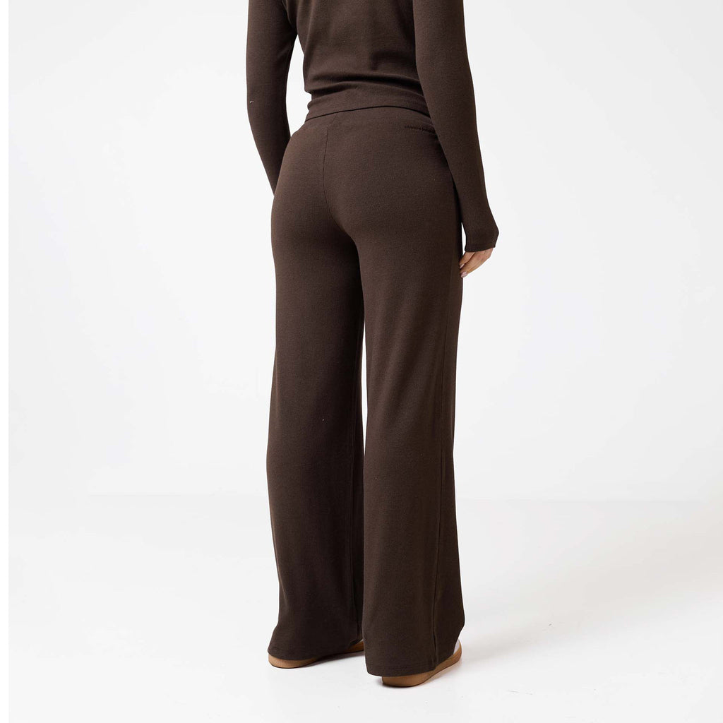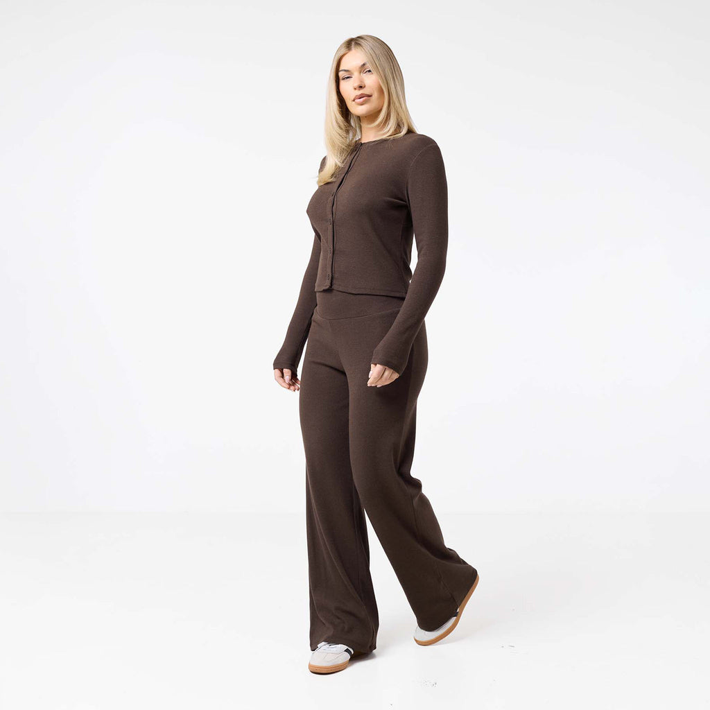 Elevate your wardrobe with the ideal blend of style and comfort. Our Ribbed Open Hem Pants in the signature Coffee shade  are designed to provide a flattering fit, with a comfortable waistband and a stylish open hem. The finely ribbed fabric adds a sophisticated texture, making them a versatile choice for both elevated loungewear and everyday errands. Finished with a durable twin-needle hem stitch, these pants are crafted for lasting wear.