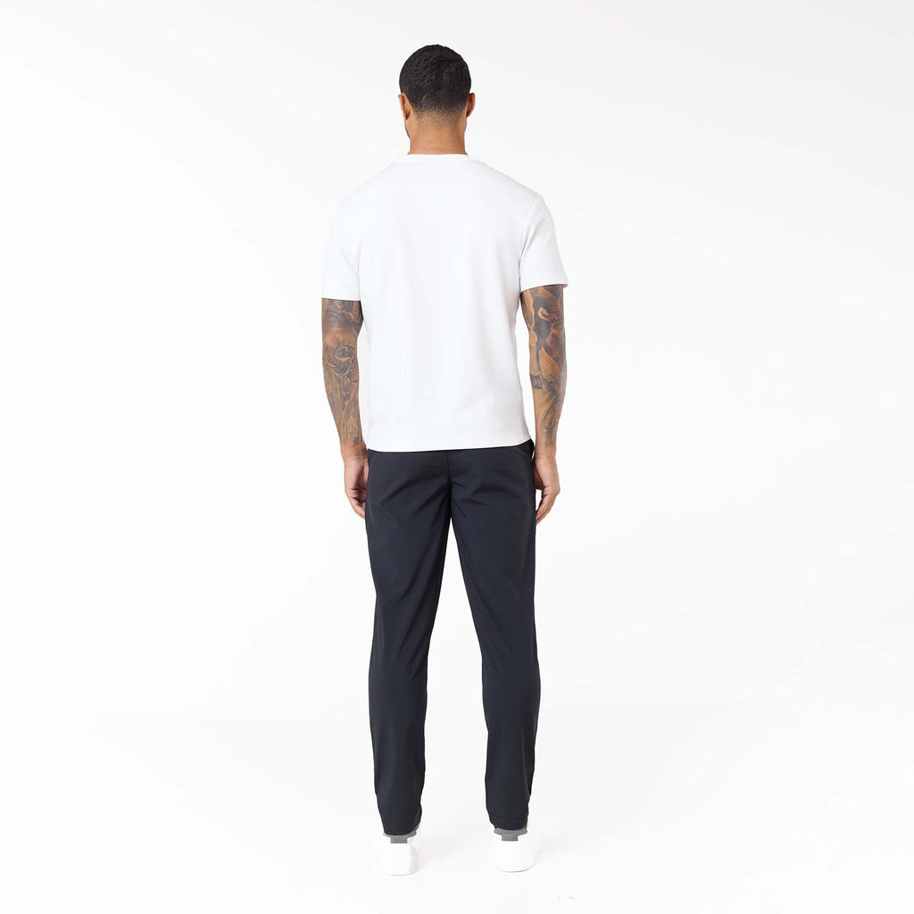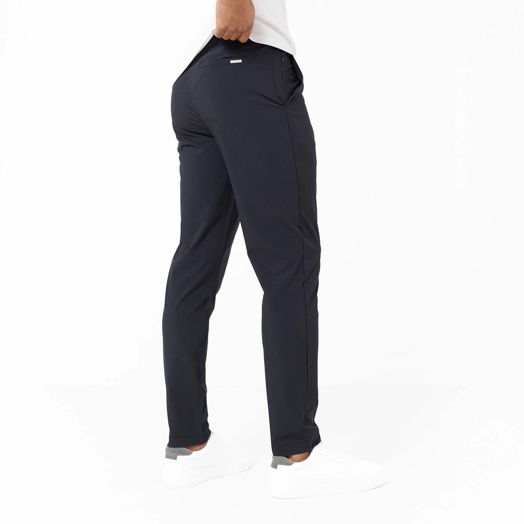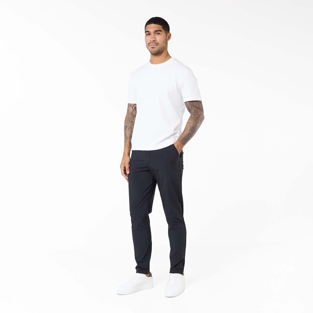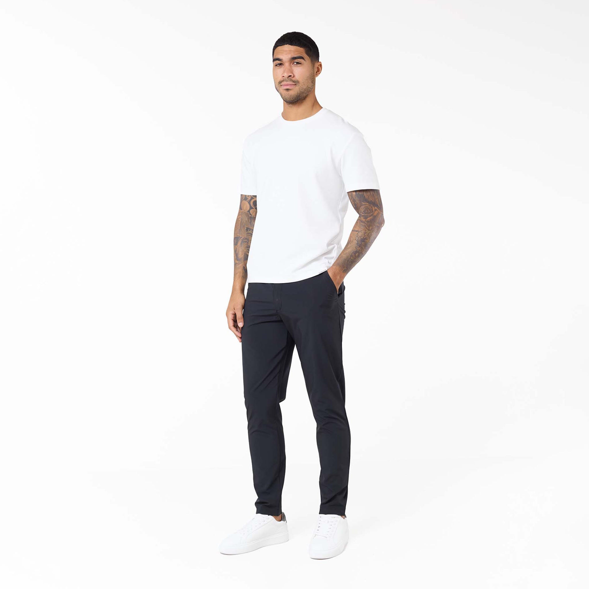 Discover the new staple Smart Tech Pant in classic black, these smart chino trousers seamlessly blend style and comfort. An open hem and self-turn hem allow you to create a perfectly tailored fit, while the front slanted pockets are enhanced with a clean, single stitch for a sharp look. For added security, a concealed pocket with an autolock keeps your essentials safe. The elasticated waistband panel ensures all-day comfort, and classic details like belt loops and a zip fly stitch provide a polished finish. With rear welt pockets and a branded metal badge, these trousers are the ideal choice for any occasion where you need to look and feel your best. Seamlessly transition between smart and casual looks, as their versatile design pairs effortlessly with everything from a structured overshirt or smart polo to a simple tee and trainers.