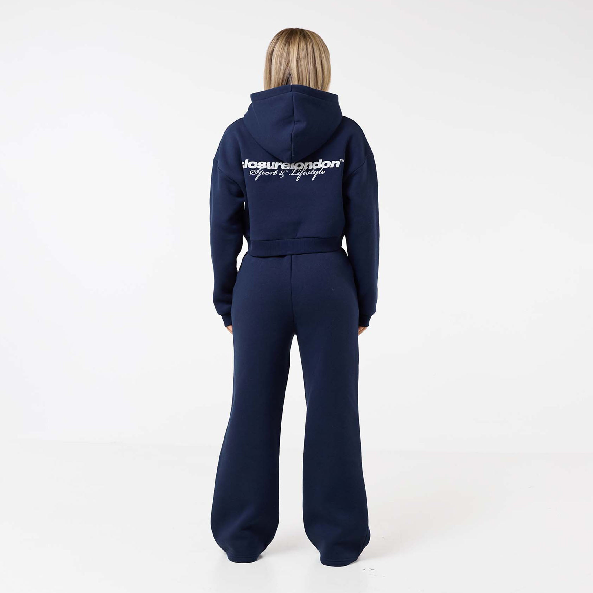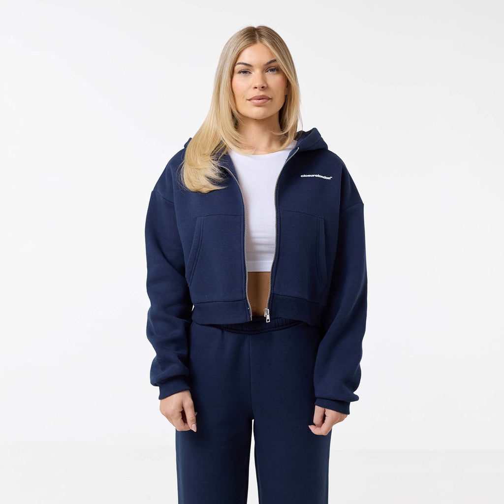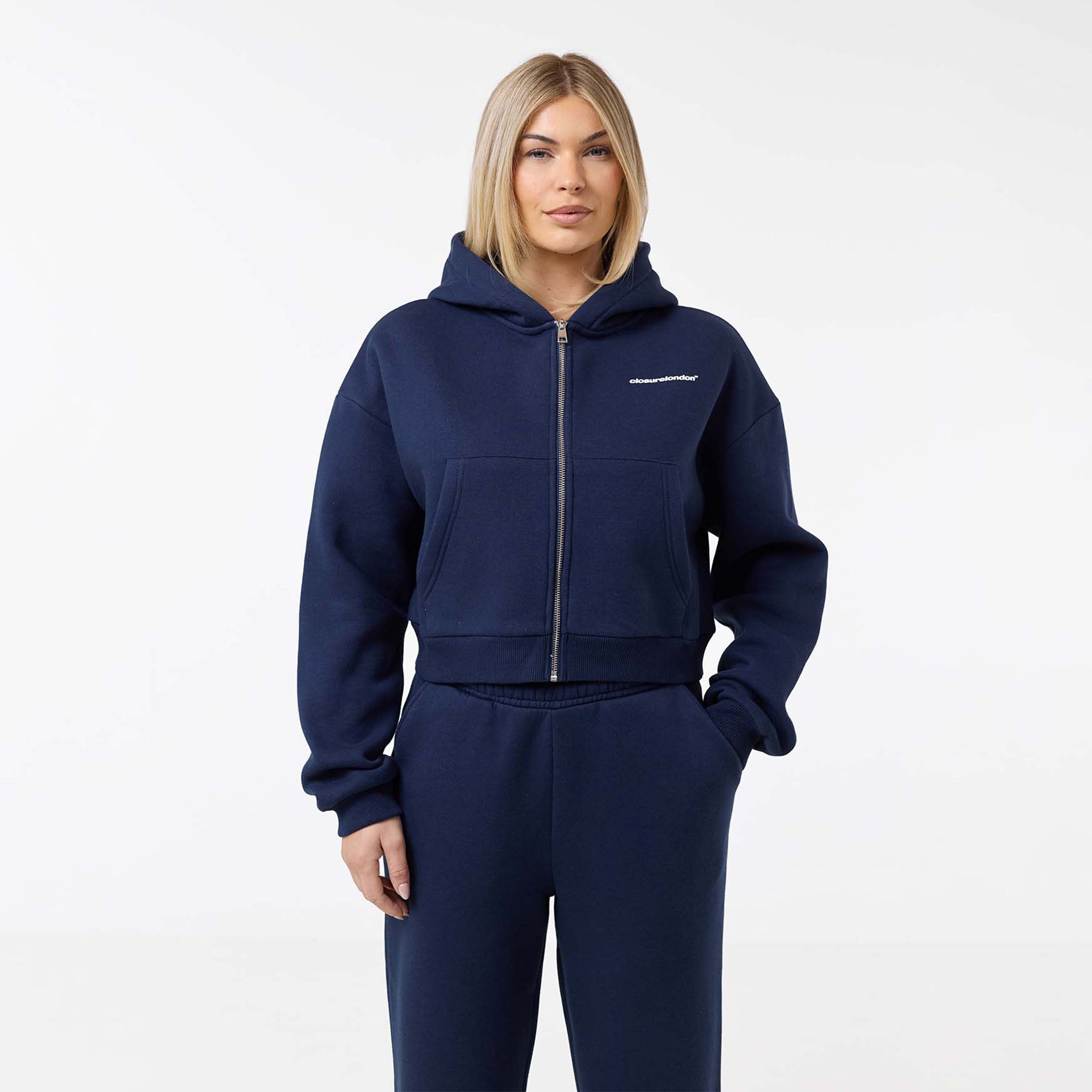 Introducing your new go to effortless style, the Stacked Crop Tracksuit in timeless navy. This modern tracksuit features a cropped zip-up hoodie with a bold rear Closure London graphic, perfectly paired with classic open-hem joggers. Designed with a relaxed fit and an adjustable drawstring hood, this ensemble offers a customisable and flattering look. Crafted from a soft, premium fabric, it ensures you stay comfortable whether you're lounging in style and about or running errands. The ultimate blend of fashion and function, this tracksuit is a key piece for your casual collection.