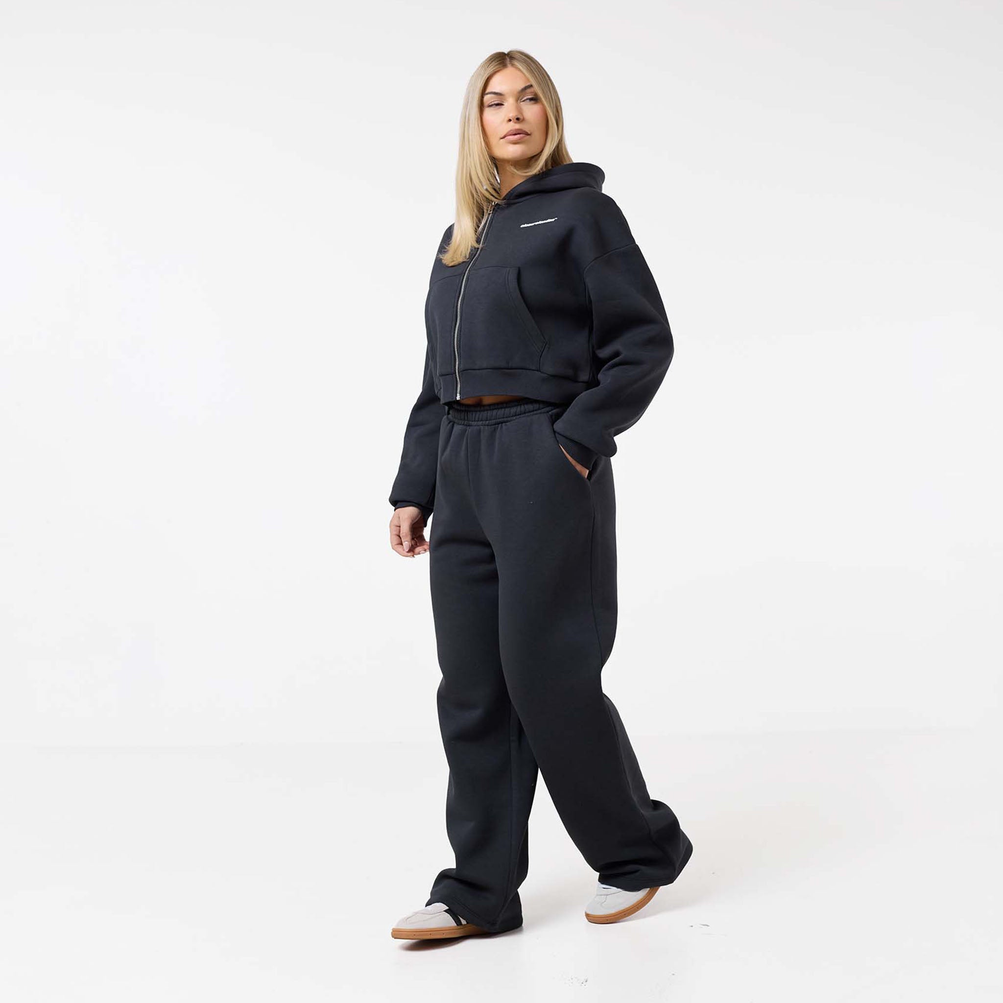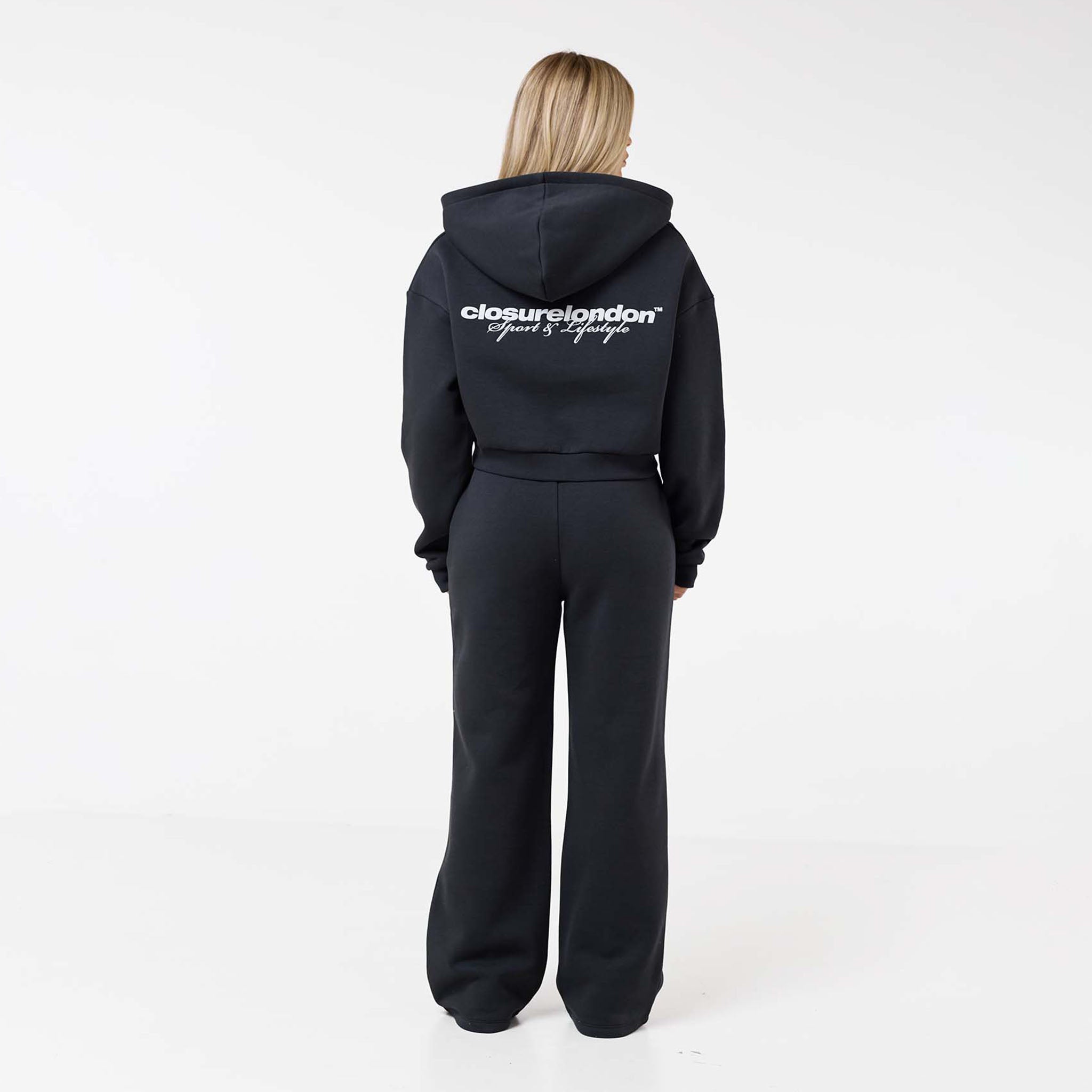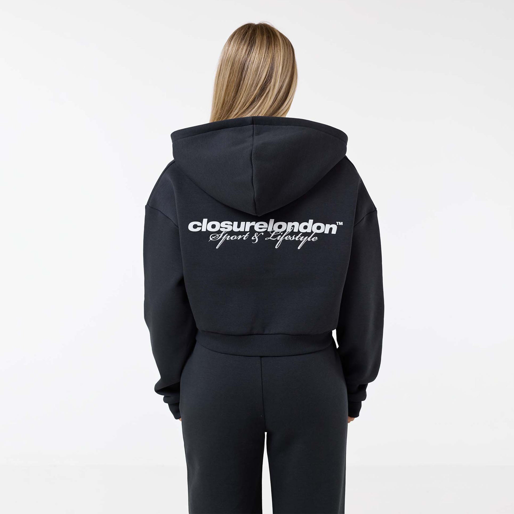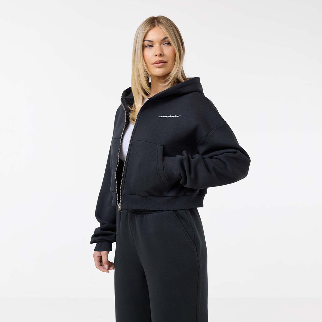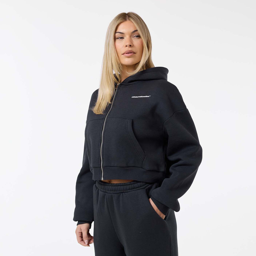 Elevate your casual collection with the Stacked Crop Tracksuit in a modern washed black. Designed for those who appreciate both comfort and style, this modern two-piece set is the ultimate blend of street-style cool and everyday cosiness.  The cropped zip-up hoodie features a bold, eye-catching graphic print Closure London at the rear, making a subtle yet distinct statement. An adjustable drawstring hood allows you to customise your fit, while the soft, premium fabric ensures you feel as good as you look. The matching joggers feature a relaxed, open-hem fit and a comfortable elasticated waistband, ensuring freedom of movement whether you're heading out or staying in. Perfect for city outings, coffee dates, or simply lounging at home, this tracksuit is a must-have for the on-trend individual.