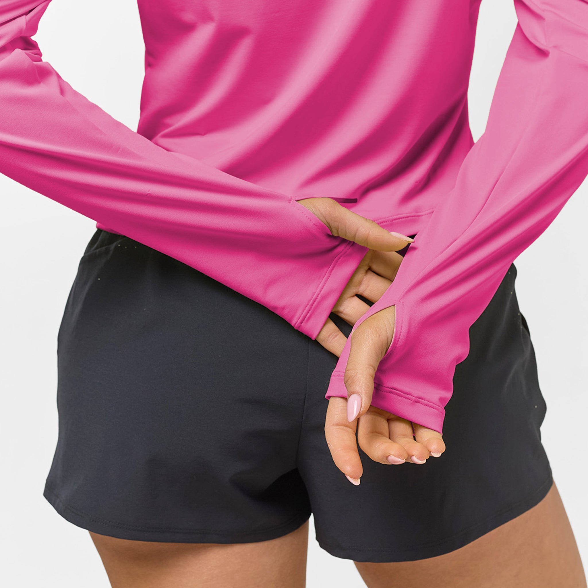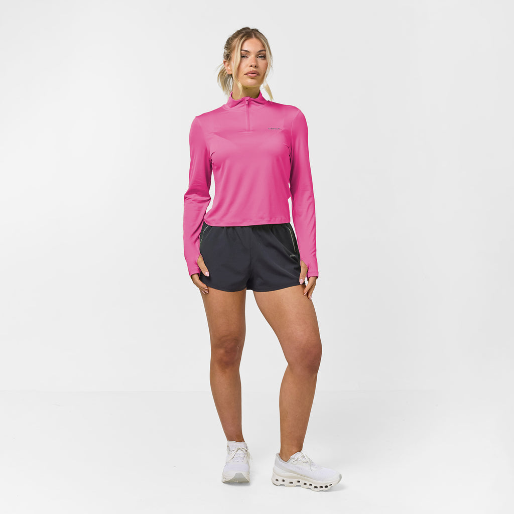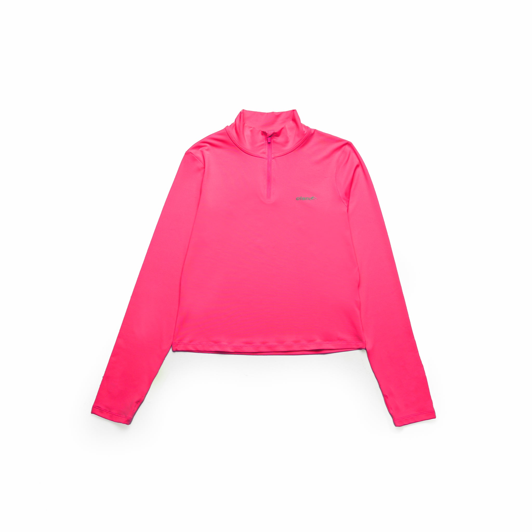 Introducing the 1/4 Zip Long Sleeve Top in vibrant bright pink, an essential for any active woman's wardrobe. Crafted for comfort and performance, it offers exceptional breathability and a flattering fit, making it ideal for warming up, cooling down, or layering during outdoor activities. The signature branding on the chest adds a touch of style to this effortlessly chic staple.