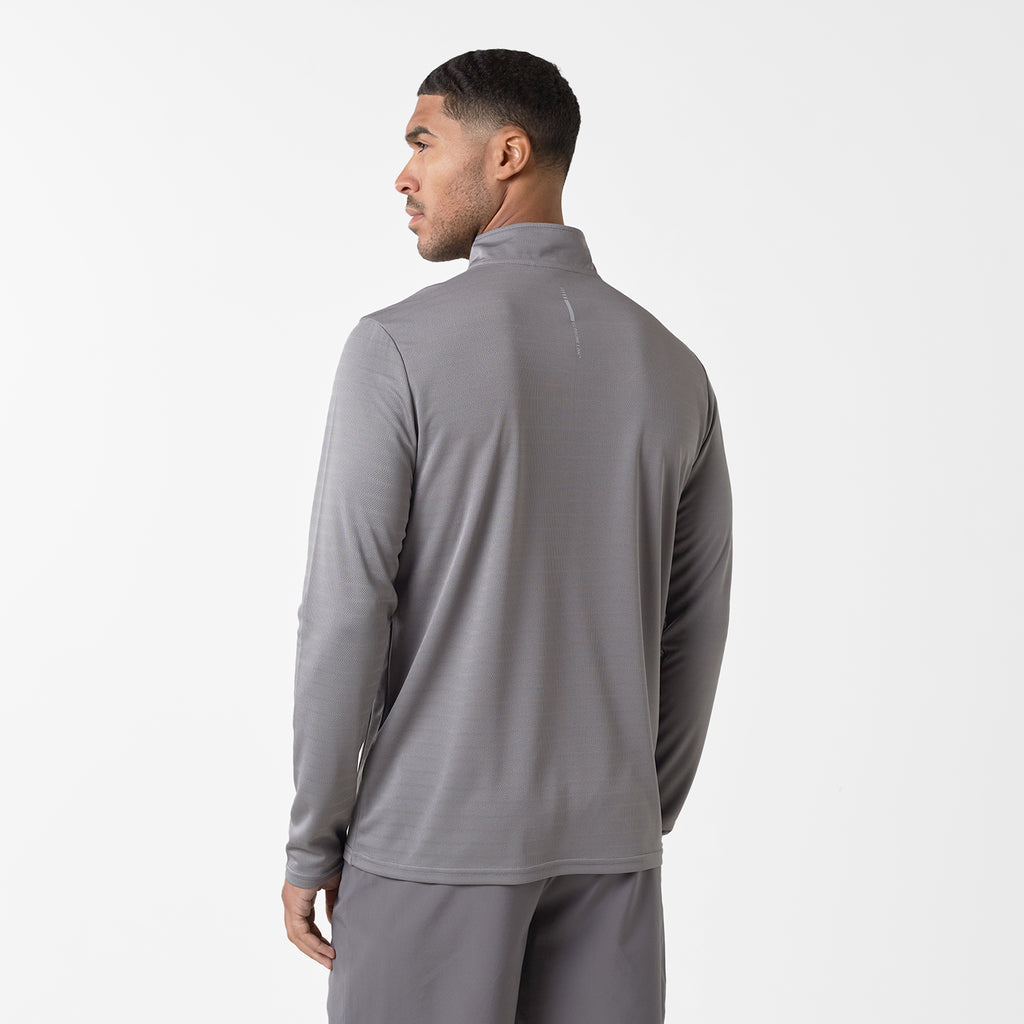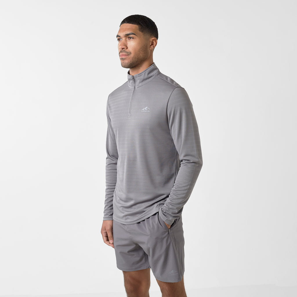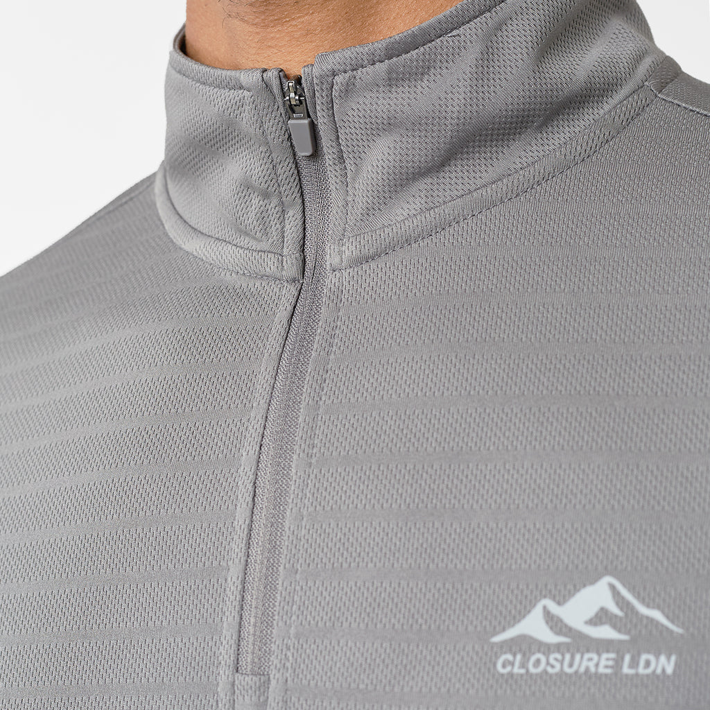 Discover the Core 1/4 Zip Performance Top in mid grey. An auto-lock zip puller ensures secure closure, complemented by the reinforced twin-stitched hem, which ensures lasting resilience and a sharp aesthetic. A subtle chest logo detail adds a touch of premium branding, making this piece ideal for workouts, casual outings, or layering, reflecting superior craftsmanship and performance-driven design. Crafted with meticulous precision and a focus on performance, this garment promises to enhance both your athletic pursuits and your everyday style, whether you're tackling a workout, exploring outdoor trails, or simply seeking a sophisticated, casual look.