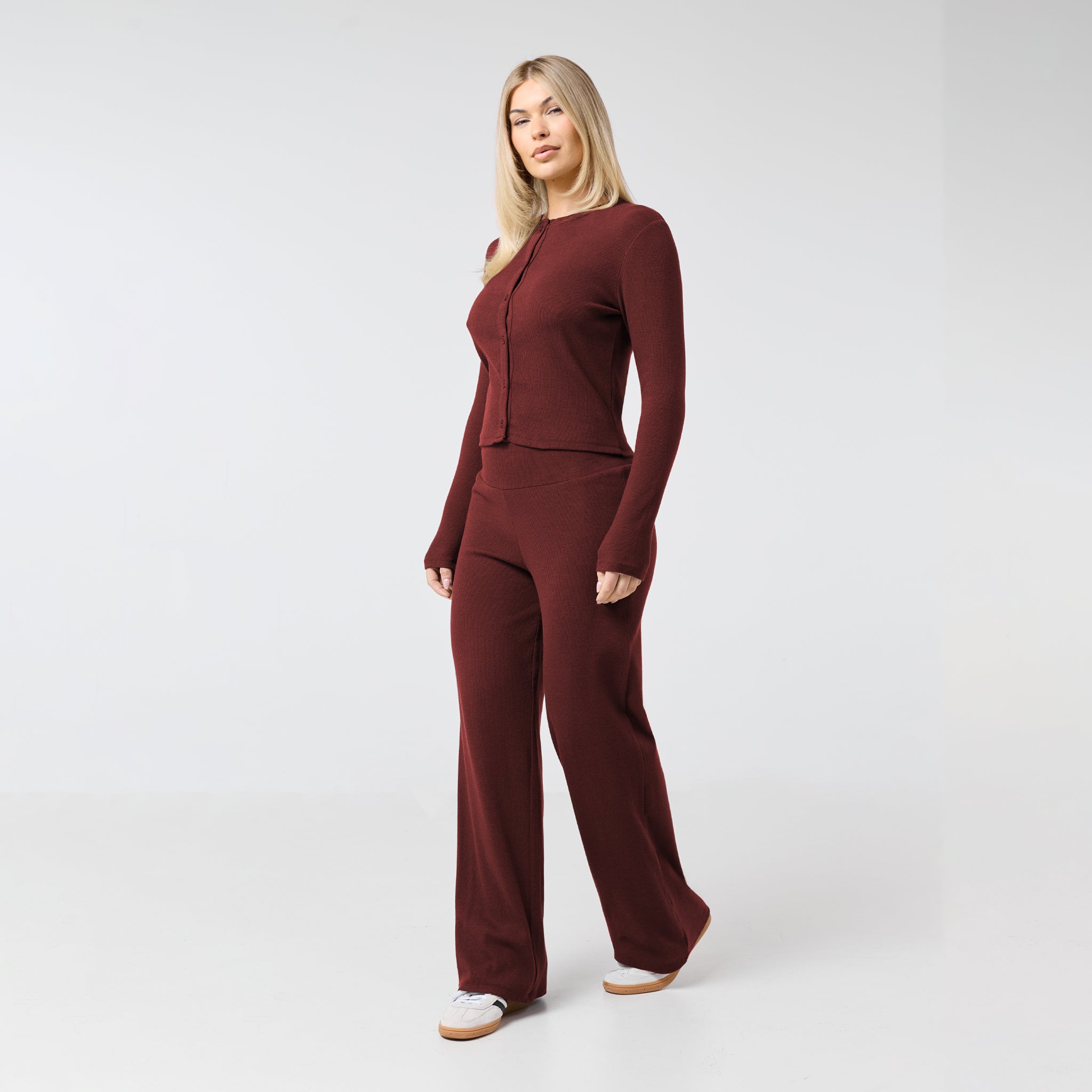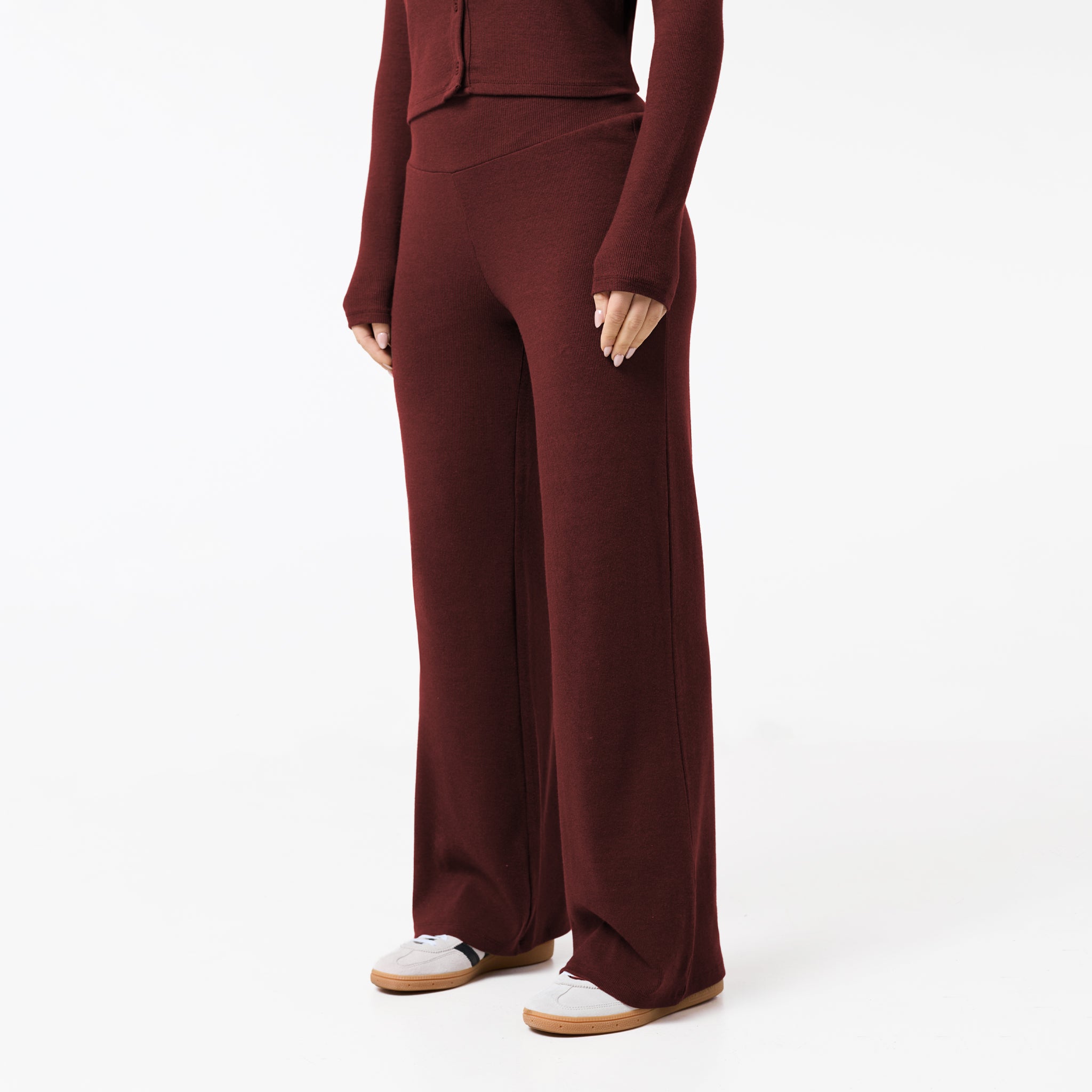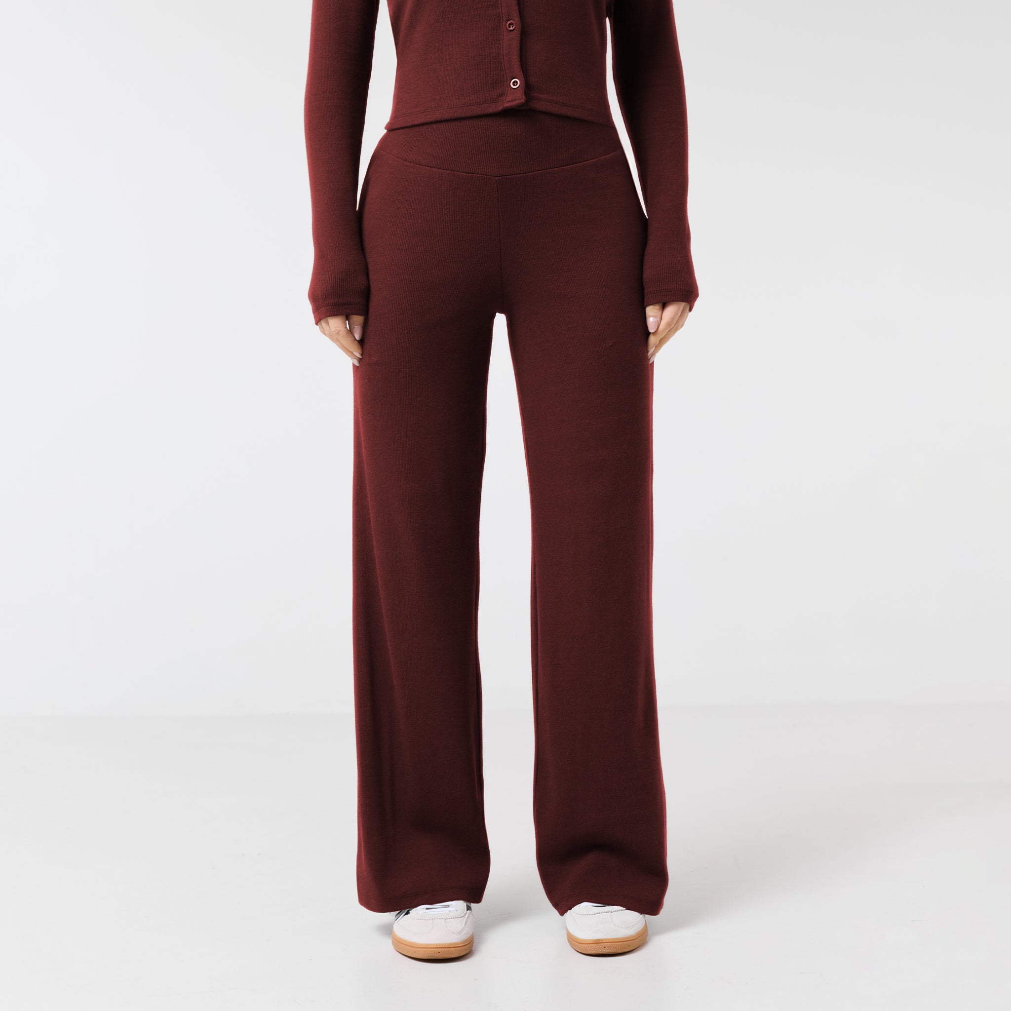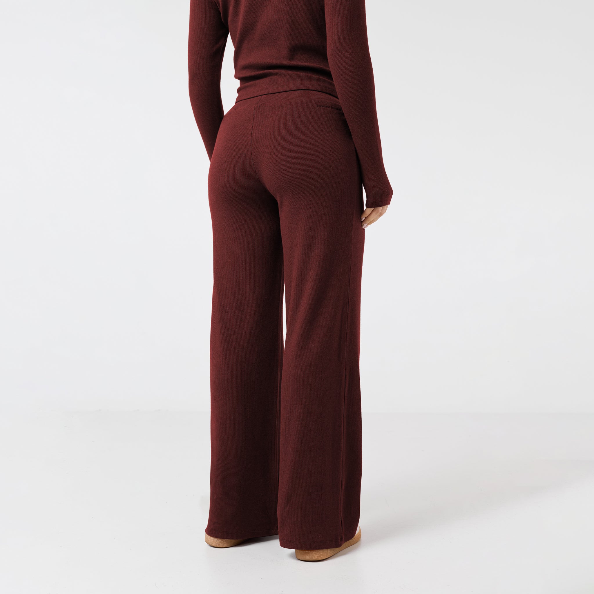 Introducing the Ribbed Open Hem Pants in an on trend burgundy shade, a versatile addition to any wardrobe. Designed with a comfortable waistband and a stylish open hem, these pants offer a flattering silhouette. The subtle ribbed fabric provides a sophisticated texture, making them suitable for elevated loungewear or running errands in style. A durable twin-needle hem stitch ensures they'll be a lasting favourite. Wear with the matching button up top to complete the look.