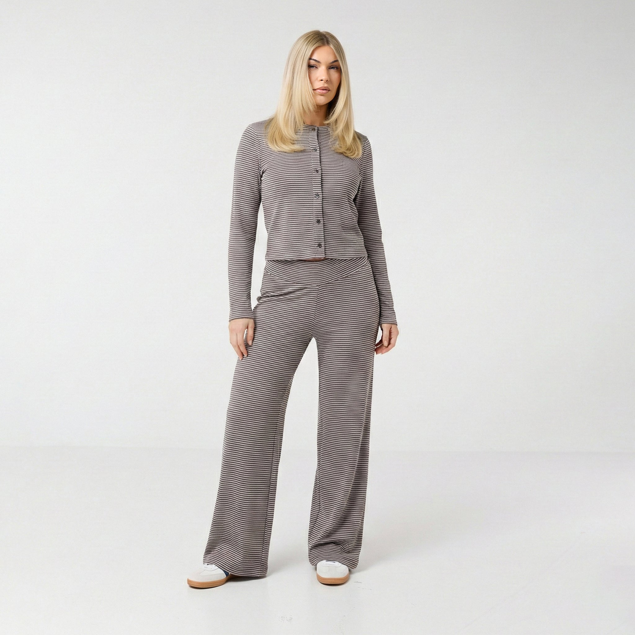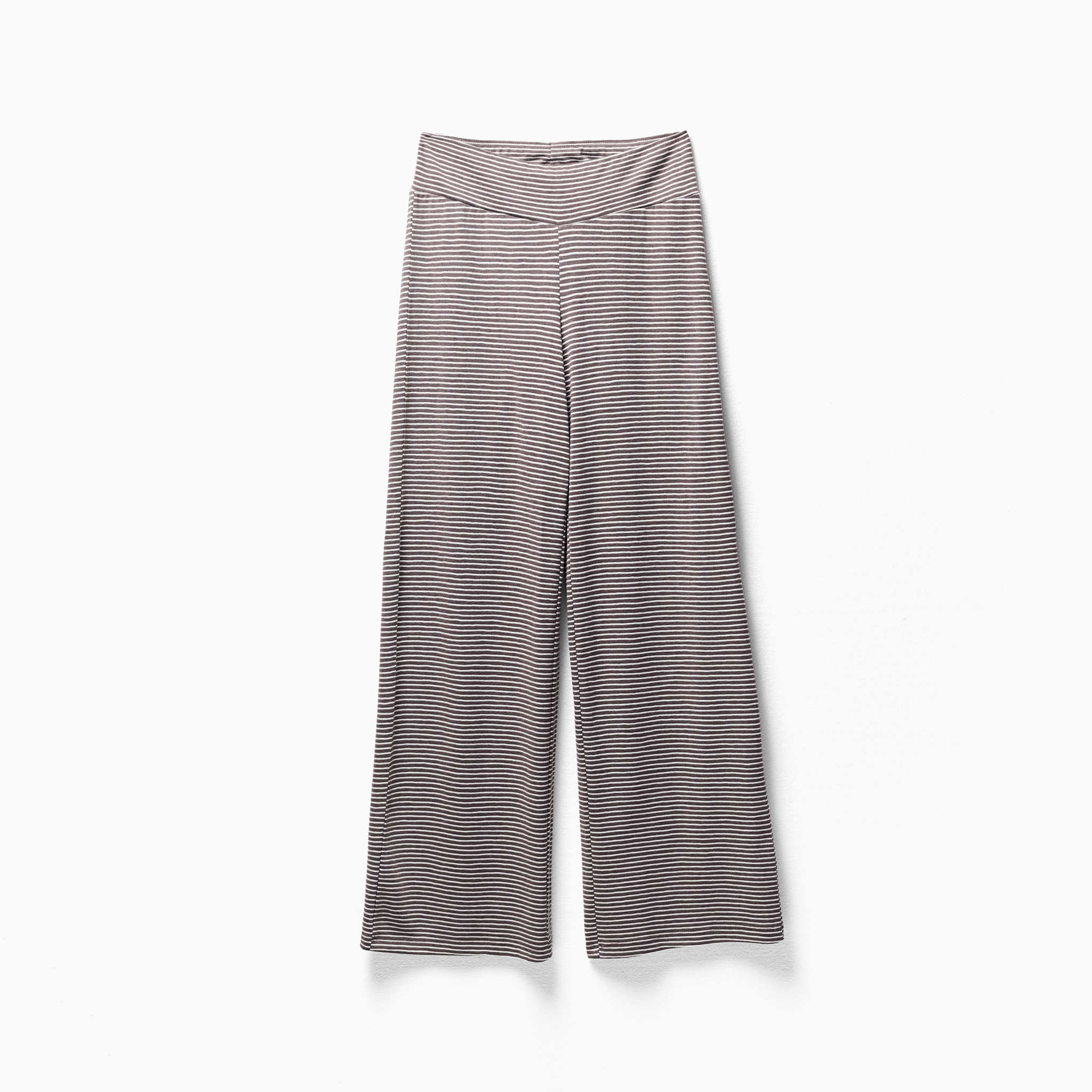 Introducing the new season Stripe Open Hem Pants in a white/brown print, a versatile addition to any wardrobe. Designed with a comfortable waistband and a stylish open hem, these pants offer a flattering silhouette. The subtle ribbed fabric provides a sophisticated texture, making them suitable for elevated loungewear or running errands in style. A durable twin-needle hem stitch ensures they'll be a lasting favourite. Team with the matching button up top to complete the look.