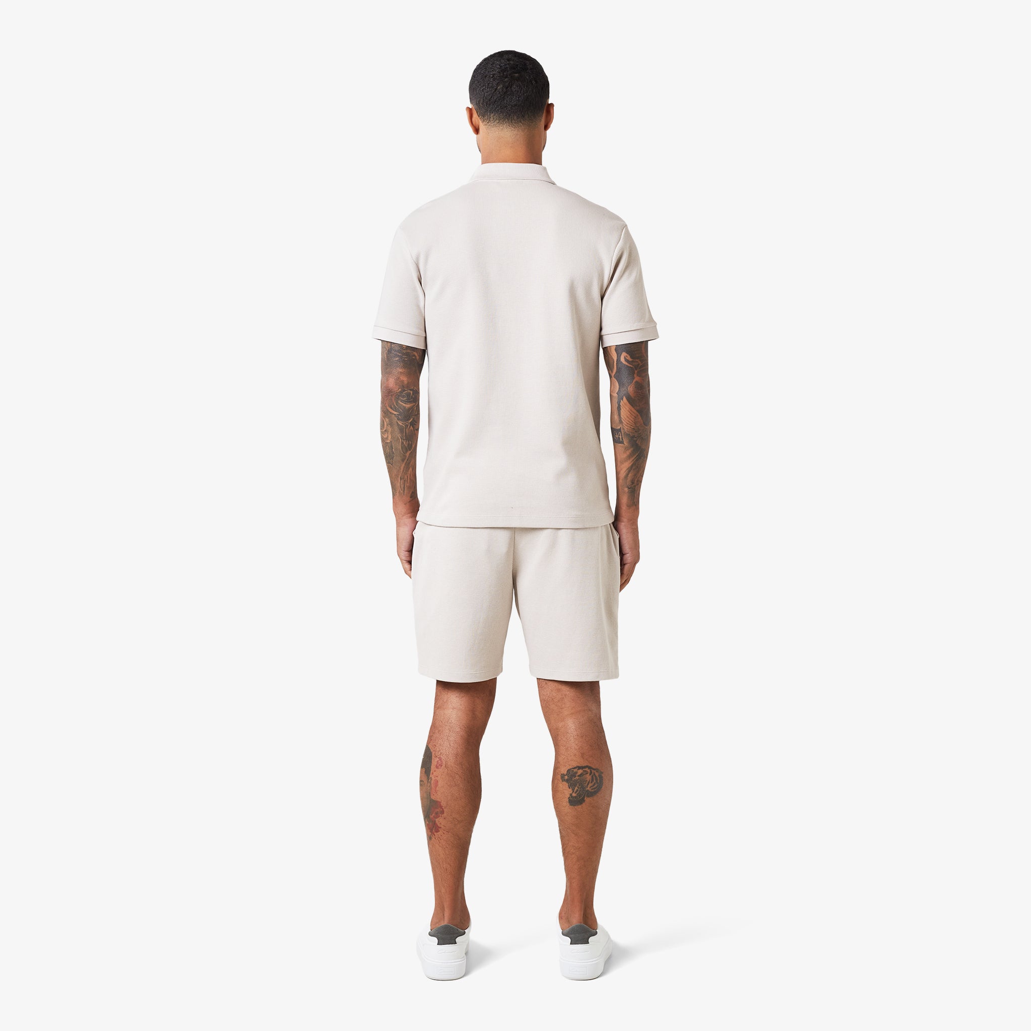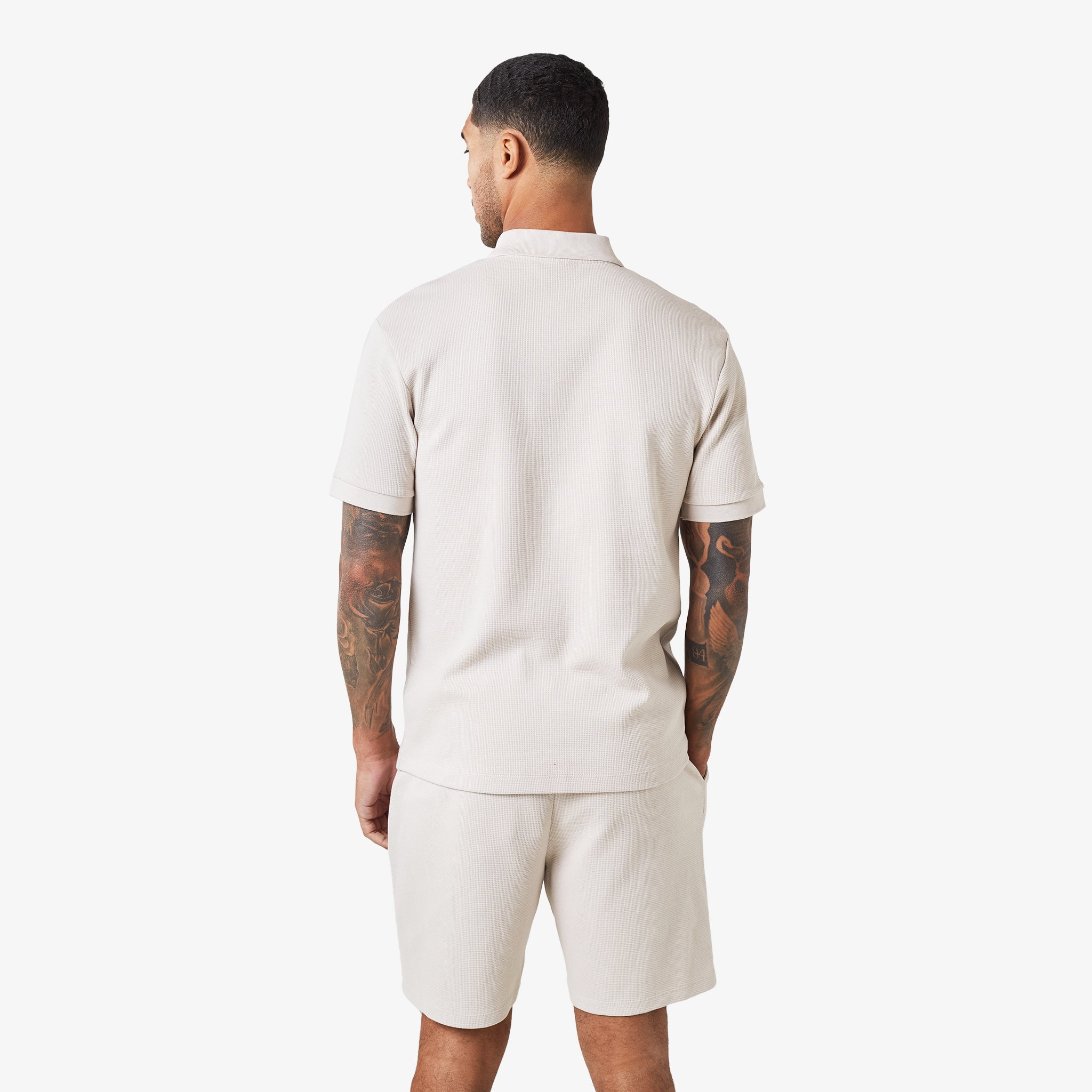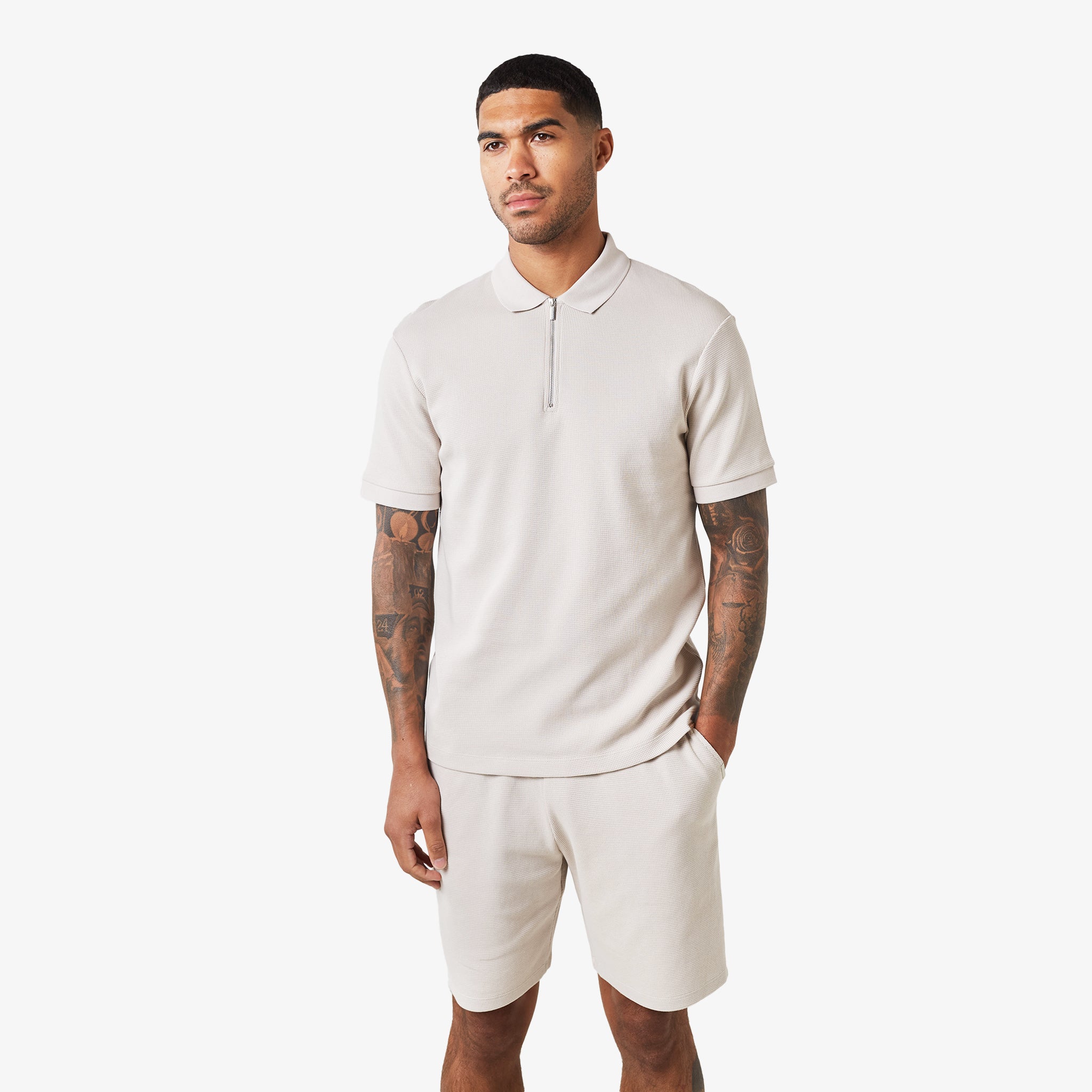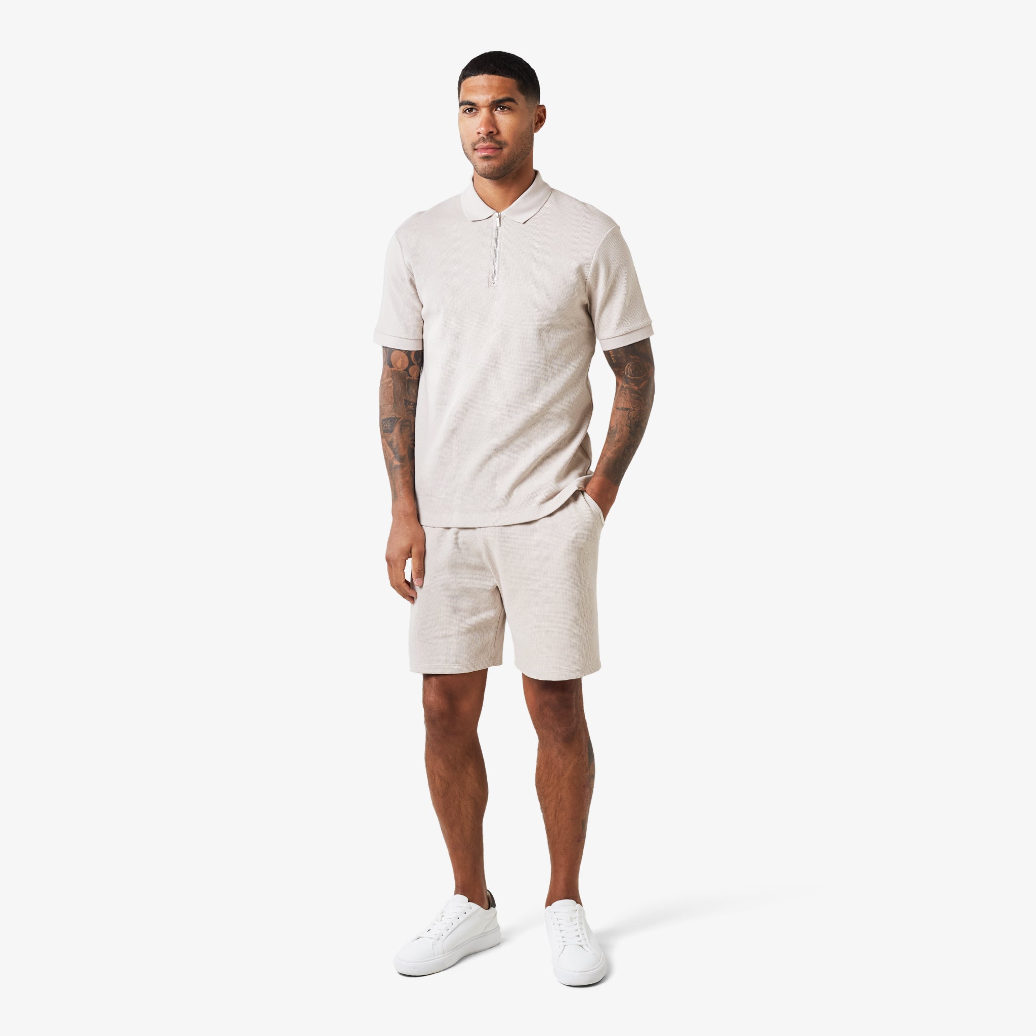 The Waffle Zipped Polo in stone is a modern take on a classic style, combining comfort and functionality. Crafted from a premium waffle knit fabric, this polo offers a relaxed fit and a soft hand feel.