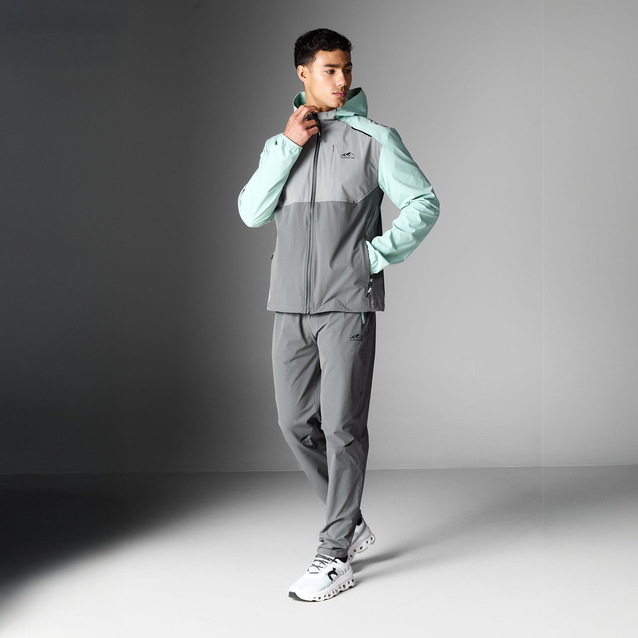 Discover the vibrant Pace Tracksuit in Charcoal/Mint, a dynamic duo crafted for peak performance and eye-catching style. The jacket boasts a distinctive cut and sew panel hood. Designed with reflective print details at the seams and a bold Closure London reflective print on the chest. Keep your essentials safe in the concealed zip pocket, while elastic binding at the cuffs and transfer printed tacks add durability. A rear storm flap provides extra protection, and bungee cord adjusters at the hem let you fine-tune the fit. The matching trousers are built for comfort and agility, featuring drawcords with rubber ends for an adjustable waist, a secure reverse nylon coil zip pocket, a subtle Closure London transfer print logo, and a modern cut and sew panel at the front calf for a streamlined look.