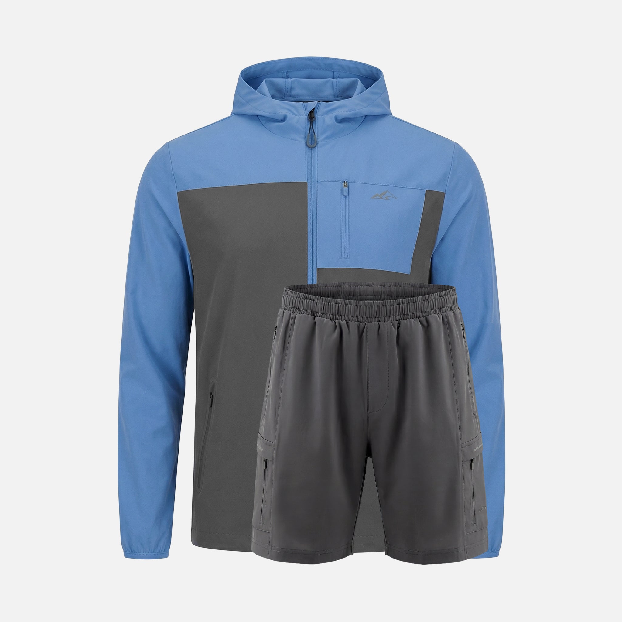 Discover the Contrast Tech Windbreaker in an Iron Grey and University Blue colourway, the all-new Elements Tech Twinset redefines the intersection of athletic utility and modern performance. The windbreaker is anchored by an ergonomic three-panel hood and precision-cut seam work, utilising a reverse nylon coil zip with signature flecked bungee pullers for a custom, weather-ready fit. Reflective silver accents, including the mountain logo at the chest and a horizontal rear stripe, provide high-visibility detailing against the tonal grey base. Complementing the jacket, the lightweight shorts feature a rear yoke for structural integrity and an internal drawcord waistband for a secure, distraction-free feel. With heat-sealed pocketing, durable twin-needle stitching, and integrated CLSR Tech branding, this coordinated set delivers a high-performance silhouette.