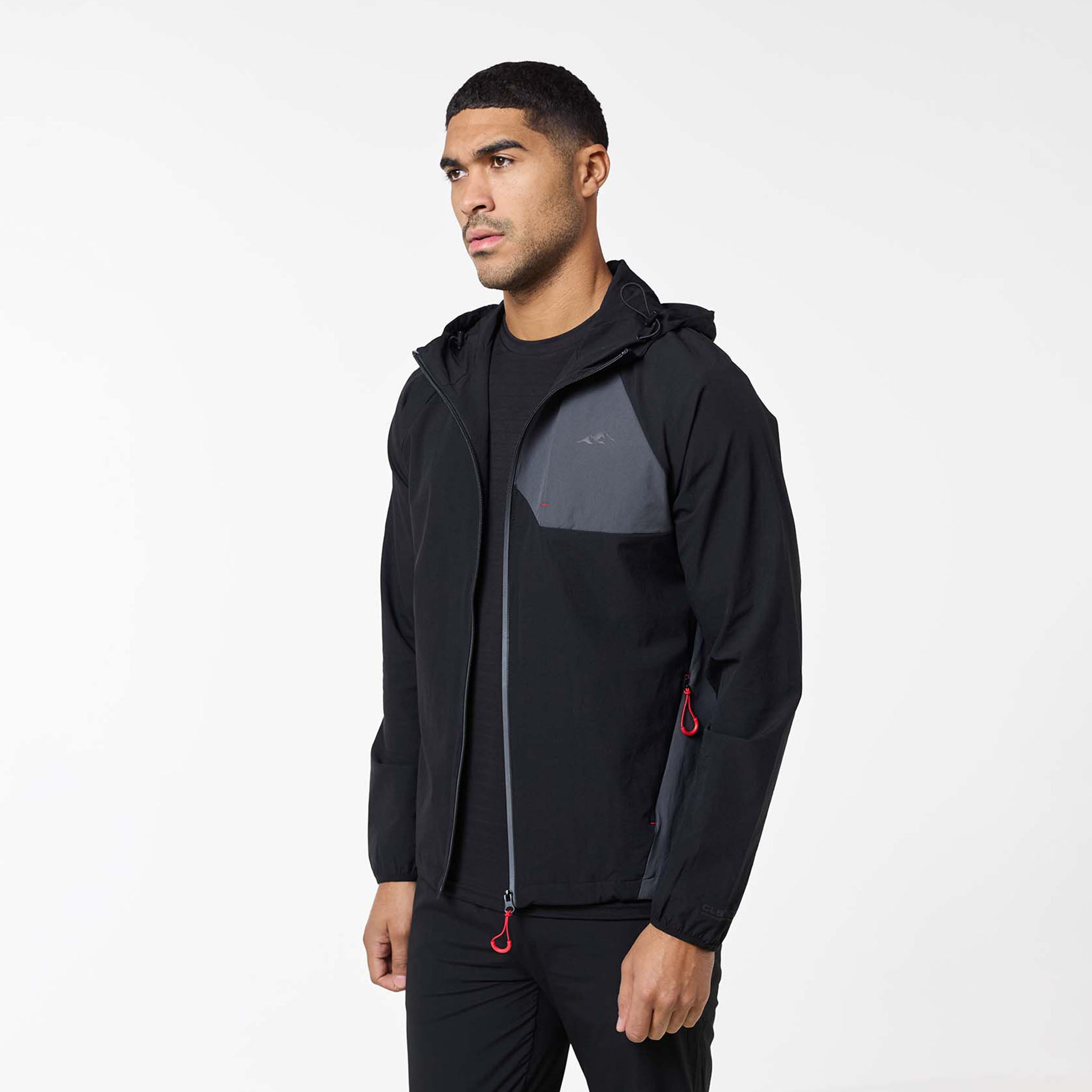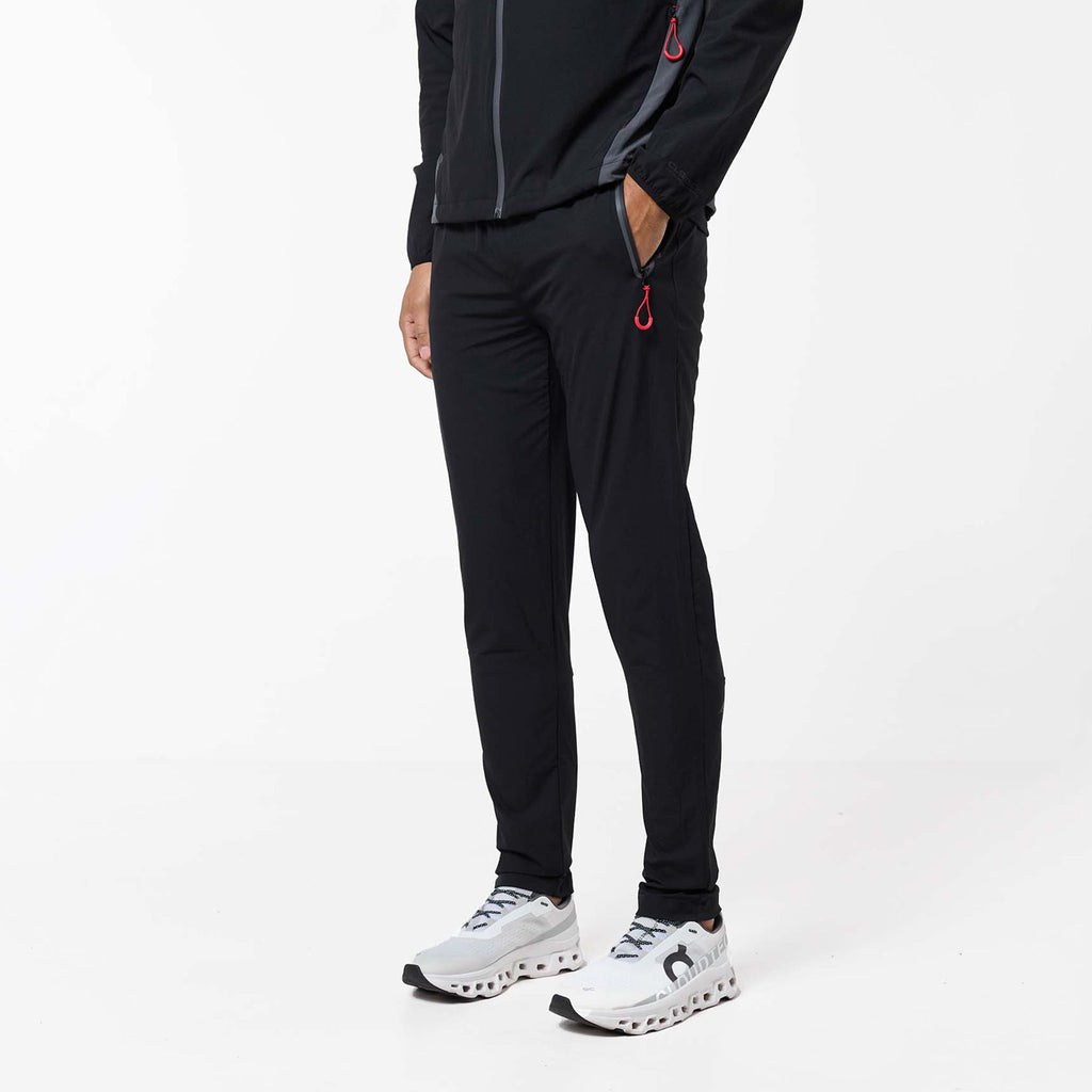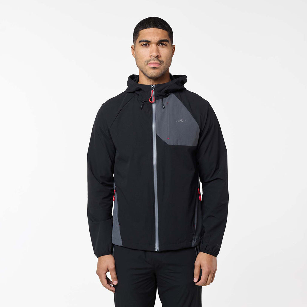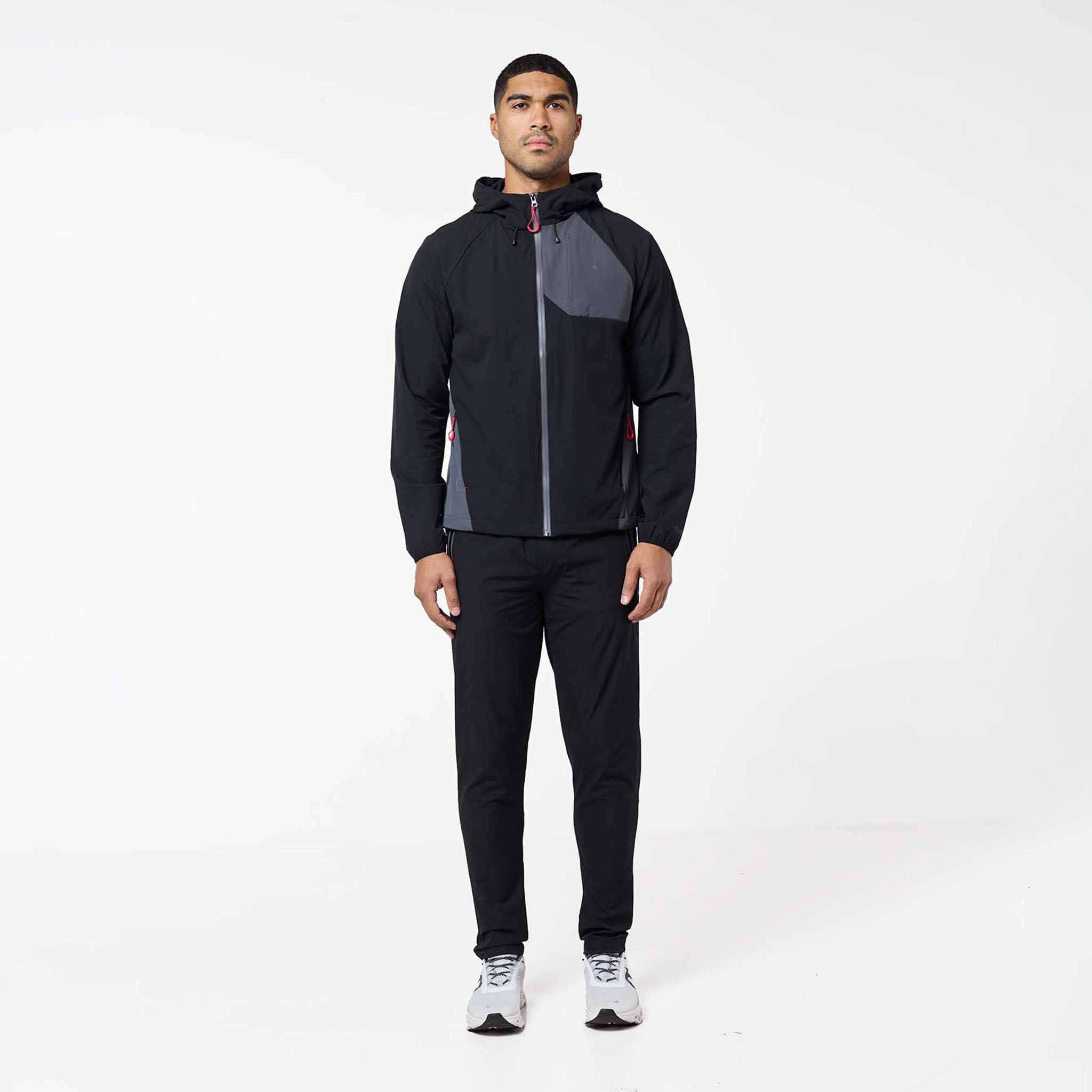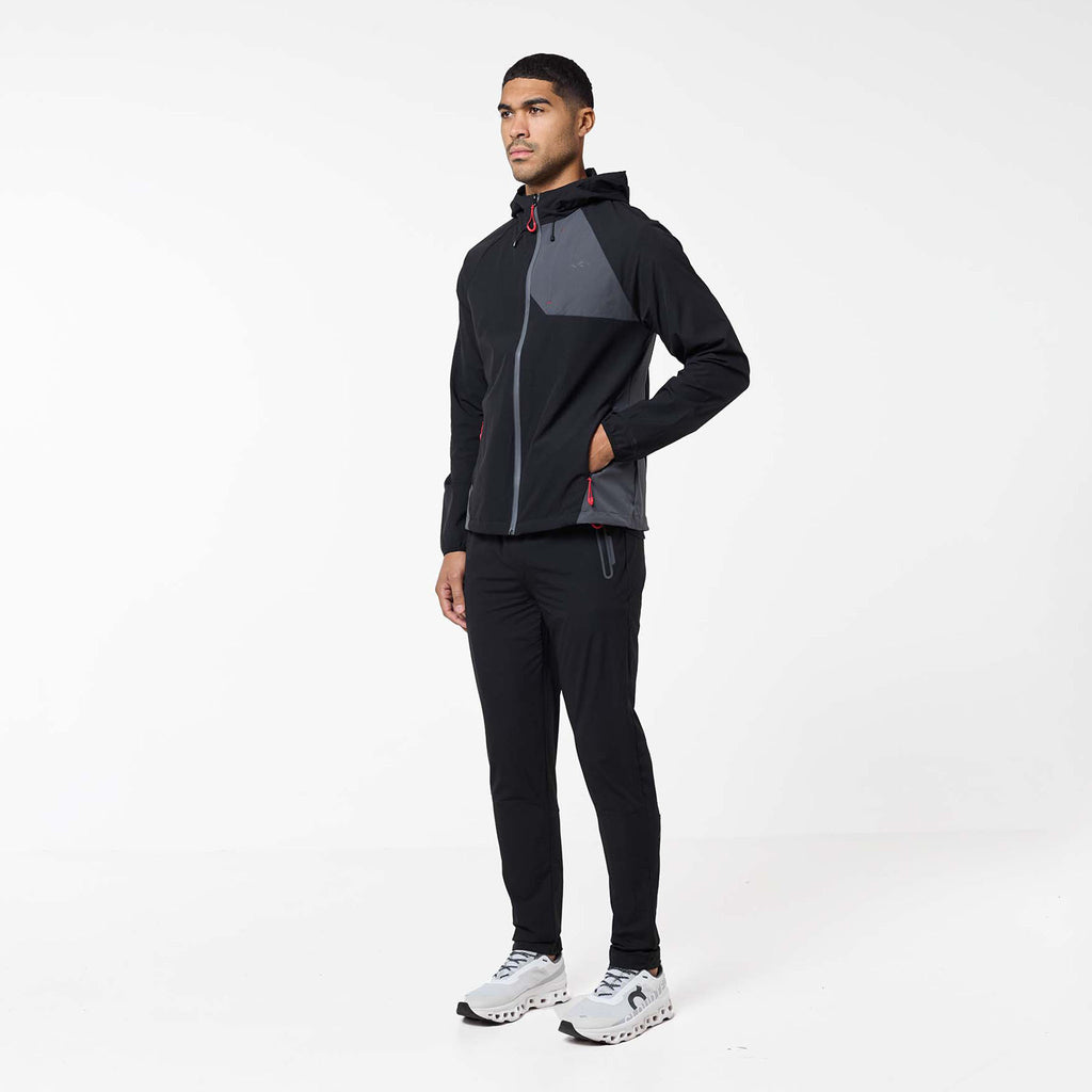 Introducing the iconic Cyclone Contrast Tracksuit in black/graphite/red colour, engineered for both style and performance. The jacket features a comfortable self-fabric 3-piece hood, dynamic cut and sew panels on the chest and body, and a raglan seam for unrestricted movement. It boasts a concealed zip pocket, a sleek coated reverse nylon coil zip, elastic binding at the cuff, a branded dual adjuster at the hem, a contrast fabric yoke at the rear, and a reflective rear logo. The matching pants offer ultimate comfort and performance with a faux fly stitch, self-fabric elasticated waistband with flat poly drawcords, heat seal pockets, zipped hems with autolock zip pullers, a cut and sew panel at the rear leg, and a reflective logo print at the rear seam.