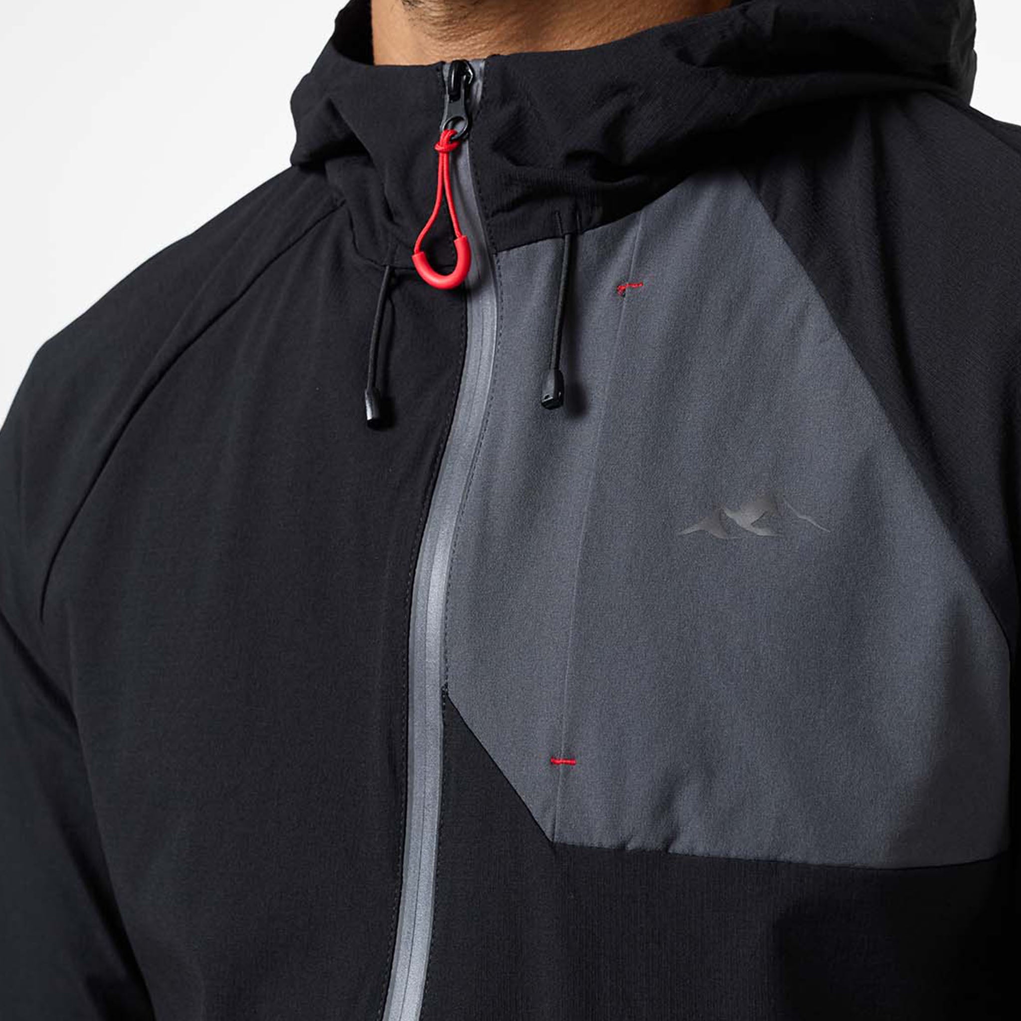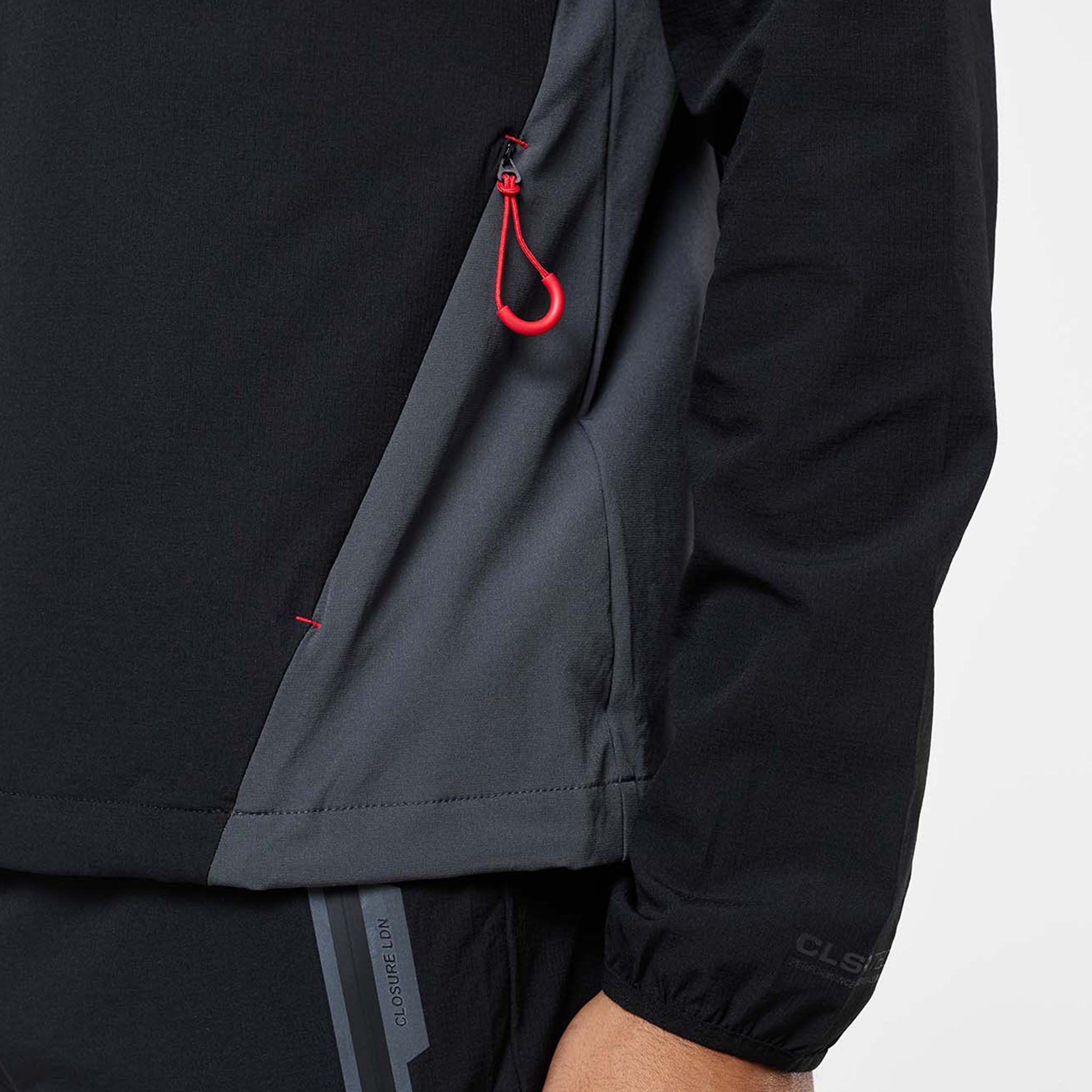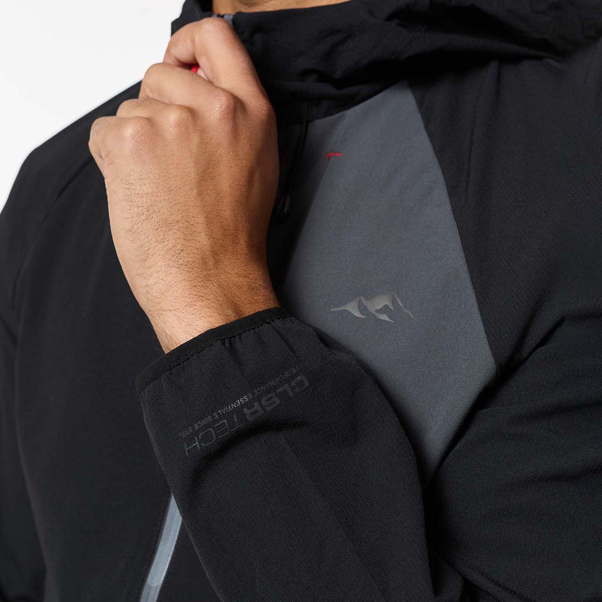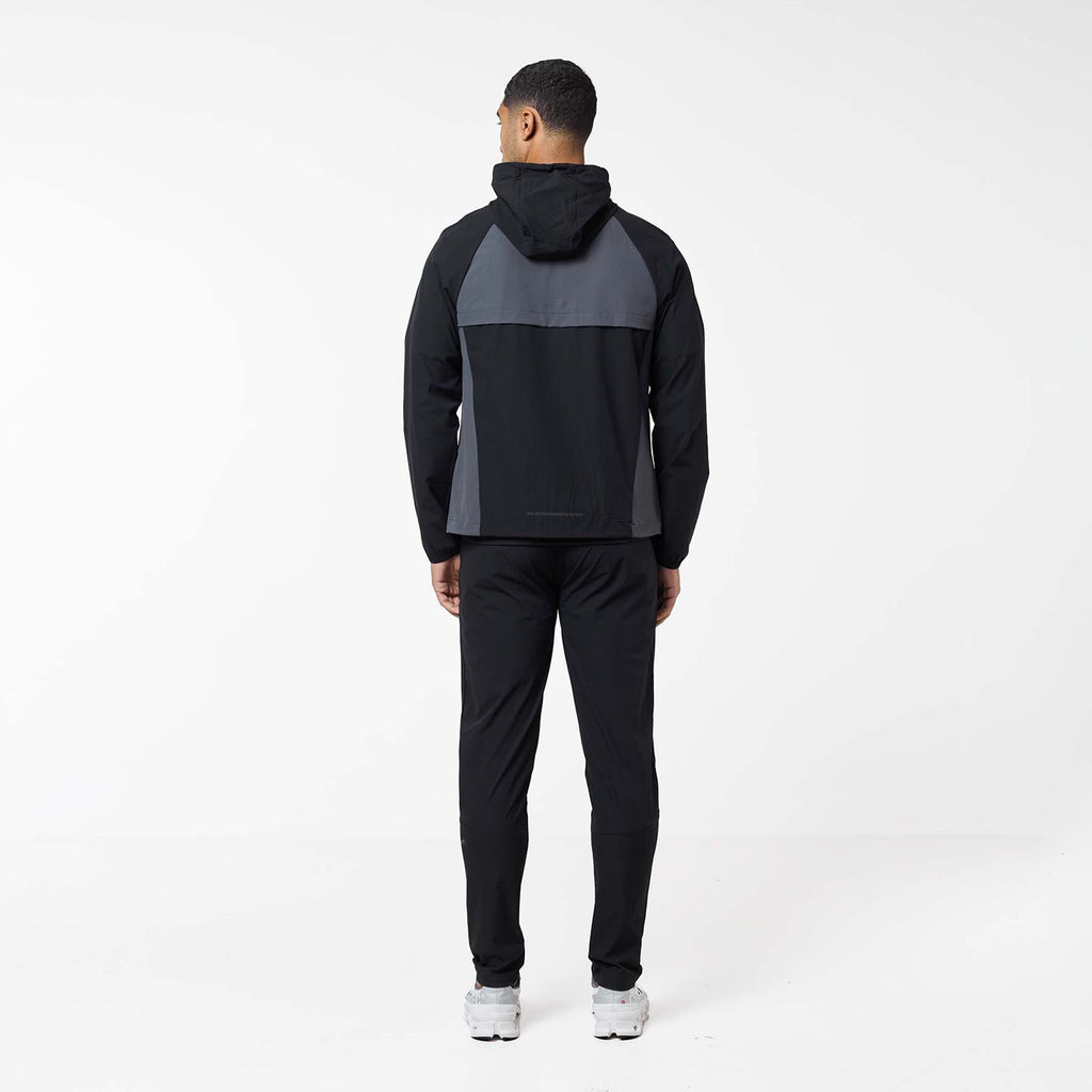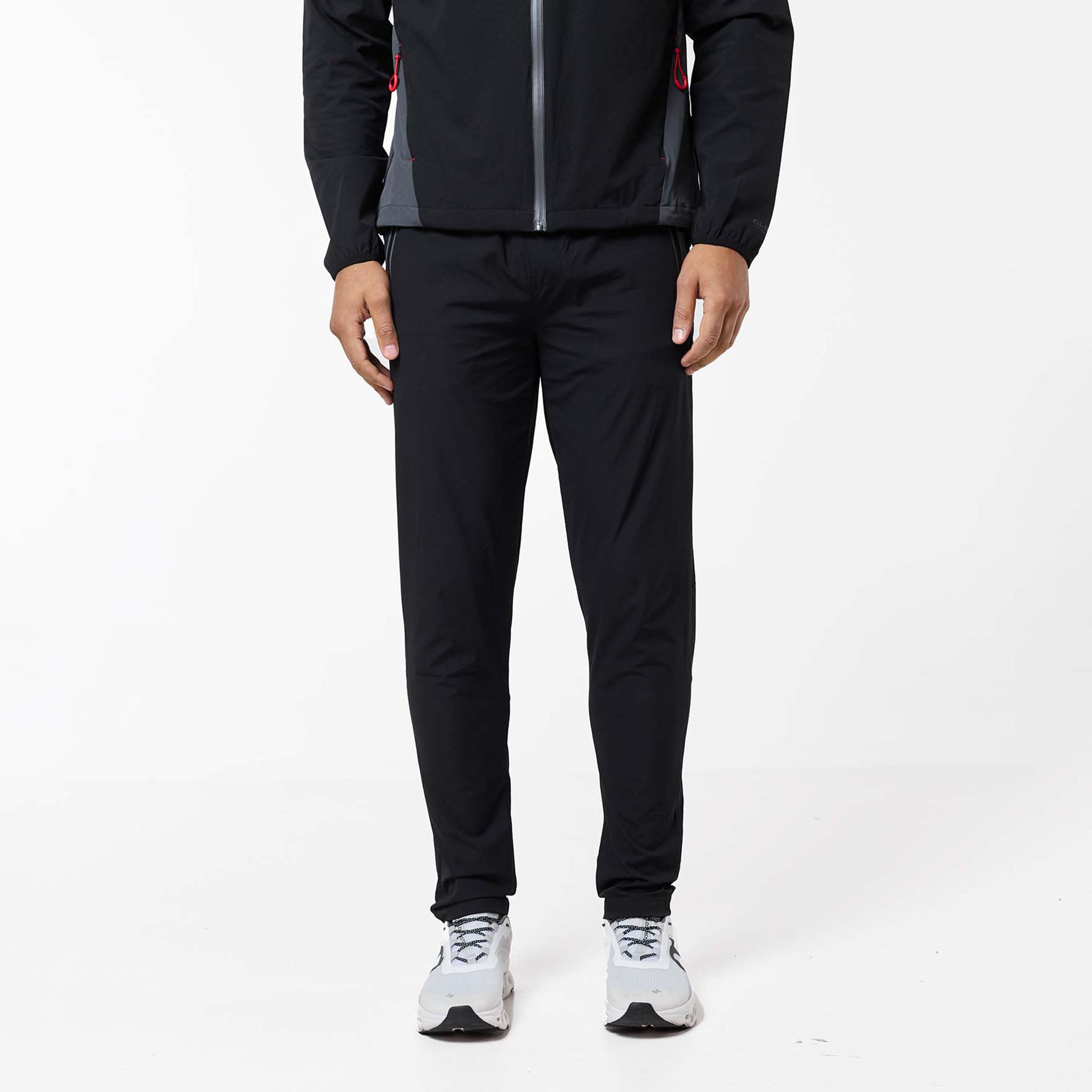 Introducing the iconic Cyclone Contrast Tracksuit in black/graphite/red colour, engineered for both style and performance. The jacket features a comfortable self-fabric 3-piece hood, dynamic cut and sew panels on the chest and body, and a raglan seam for unrestricted movement. It boasts a concealed zip pocket, a sleek coated reverse nylon coil zip, elastic binding at the cuff, a branded dual adjuster at the hem, a contrast fabric yoke at the rear, and a reflective rear logo. The matching pants offer ultimate comfort and performance with a faux fly stitch, self-fabric elasticated waistband with flat poly drawcords, heat seal pockets, zipped hems with autolock zip pullers, a cut and sew panel at the rear leg, and a reflective logo print at the rear seam.