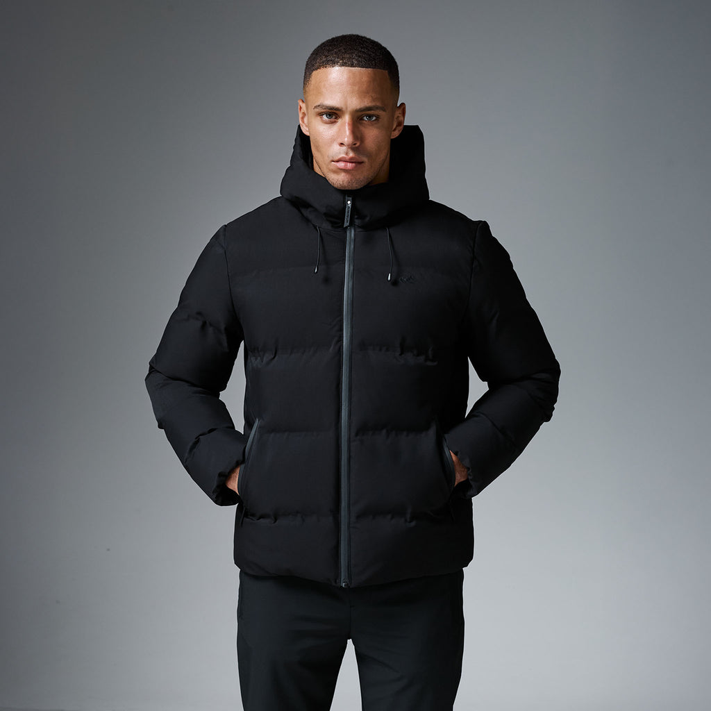 Conquer the cold with our men's heat seal puffer jacket in classic black. Crafted for superior warmth, featuring innovative heat seal quilting for maximum insulation. The 3-panel lined hood includes a bungee cord with a plastic adjuster and embossed logo, ensuring a snug and comfortable fit. Designed for both style and practicality, it boasts self-fabric elasticated cuffs to seal in warmth, and a striking 3D print branded mountain logo on the chest. Featuring a Closure branded rubber zip pull for easy fastening, along with reverse nylon zip pockets for secure storage, plus an internal welt pocket for your valuables.