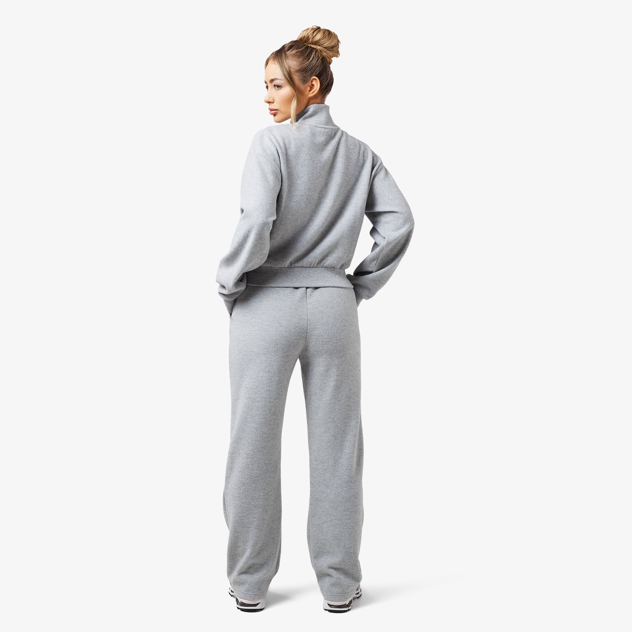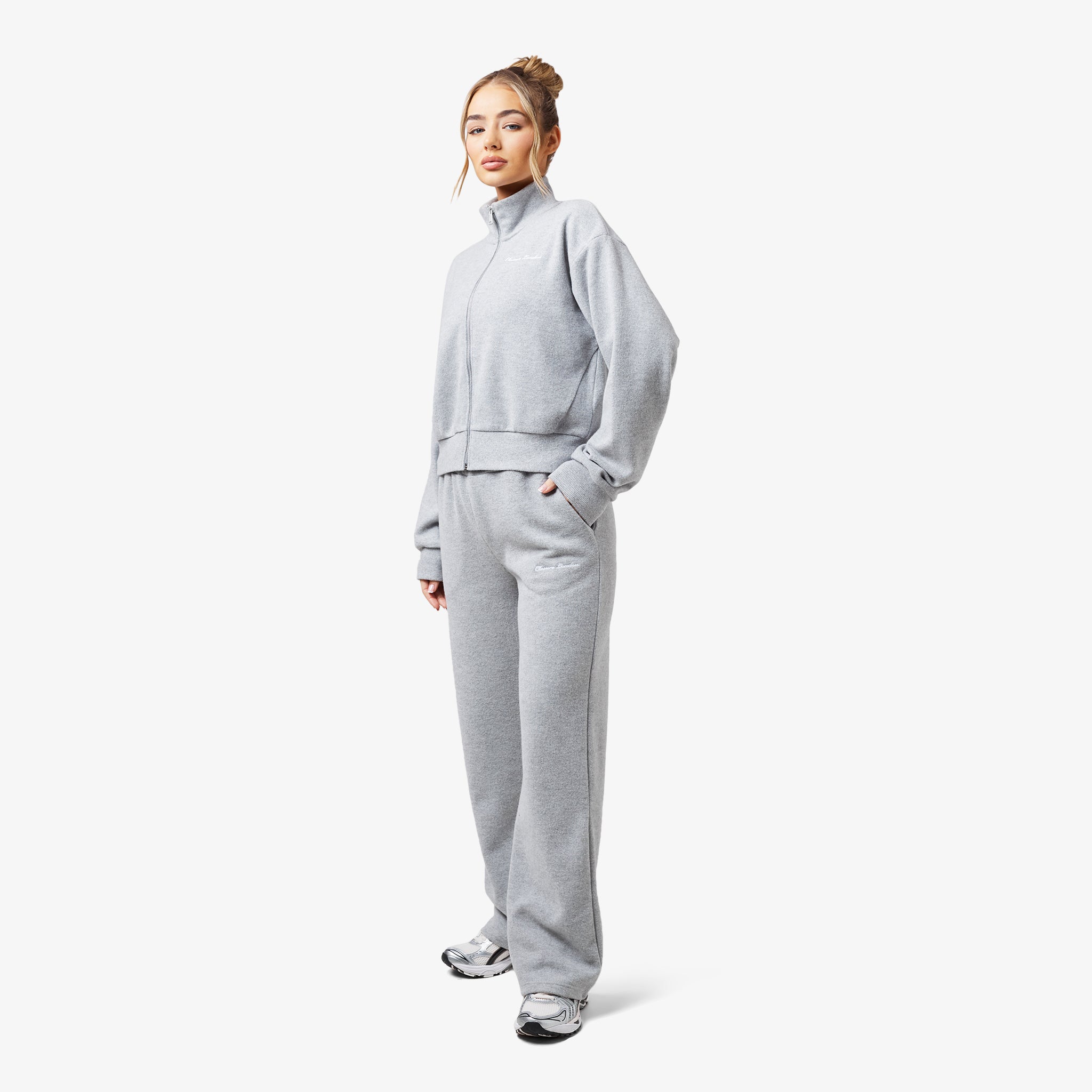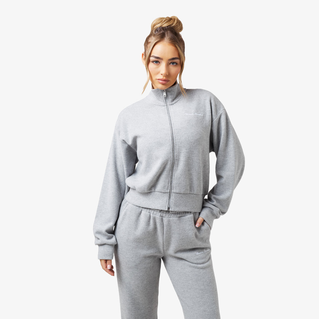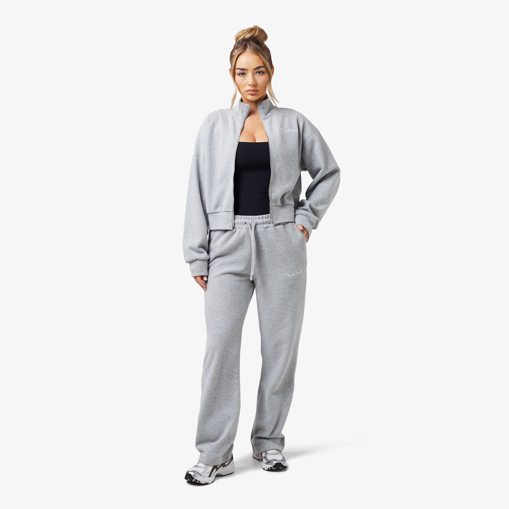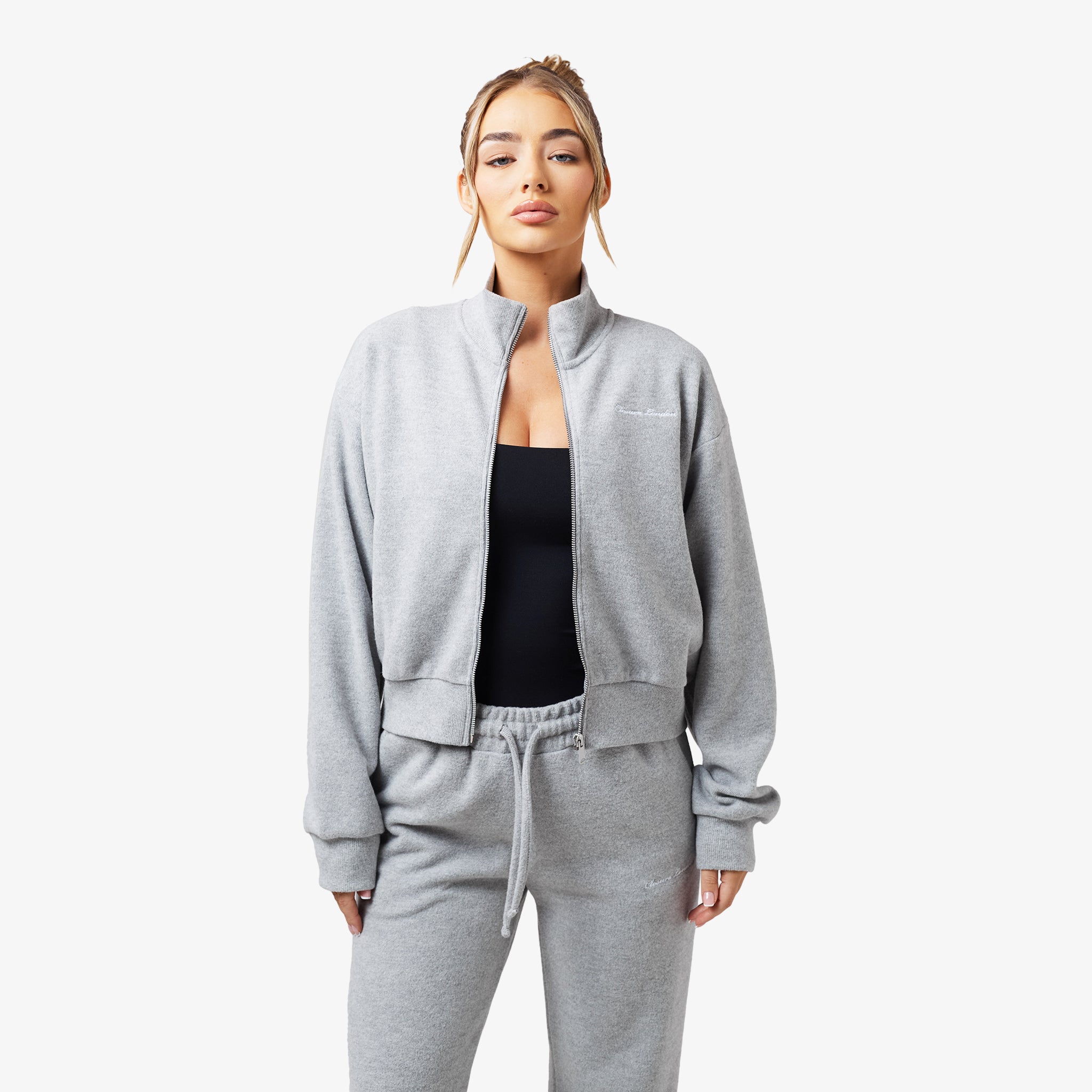 Introducing the womens Soft Knit Bomber Tracksuit. Relax in style with this tracksuit. The soft knit fabric and relaxed fit provide ultimate comfort, while the bomber jacket's boxy silhouette and dropped shoulders create a fashion-forward look. The silver metallic zipper and embroidered brand logos add a touch of luxury. The matching joggers offer a comfortable fit and practical features, making this tracksuit perfect for lounging or running errands.