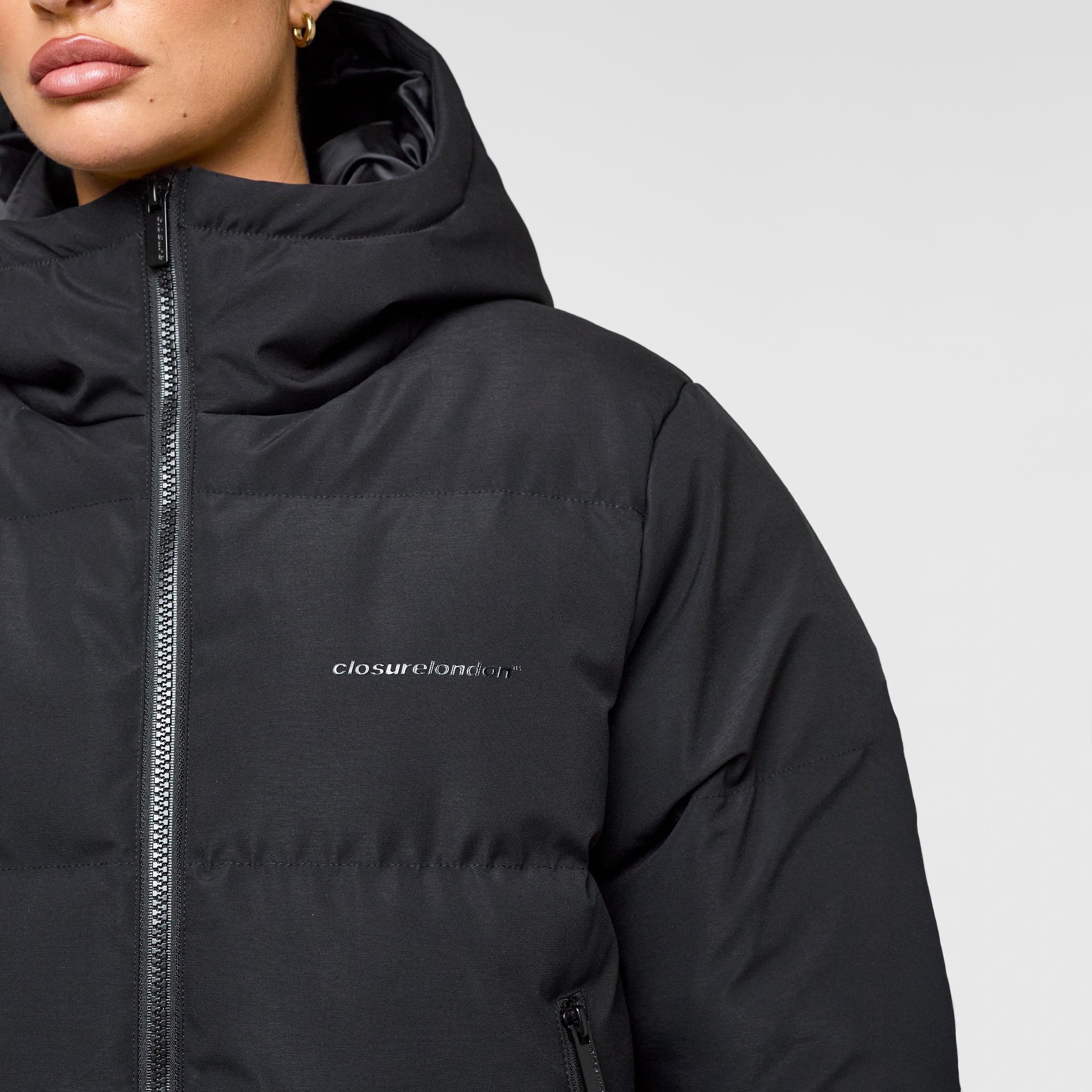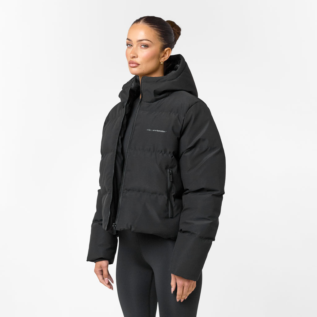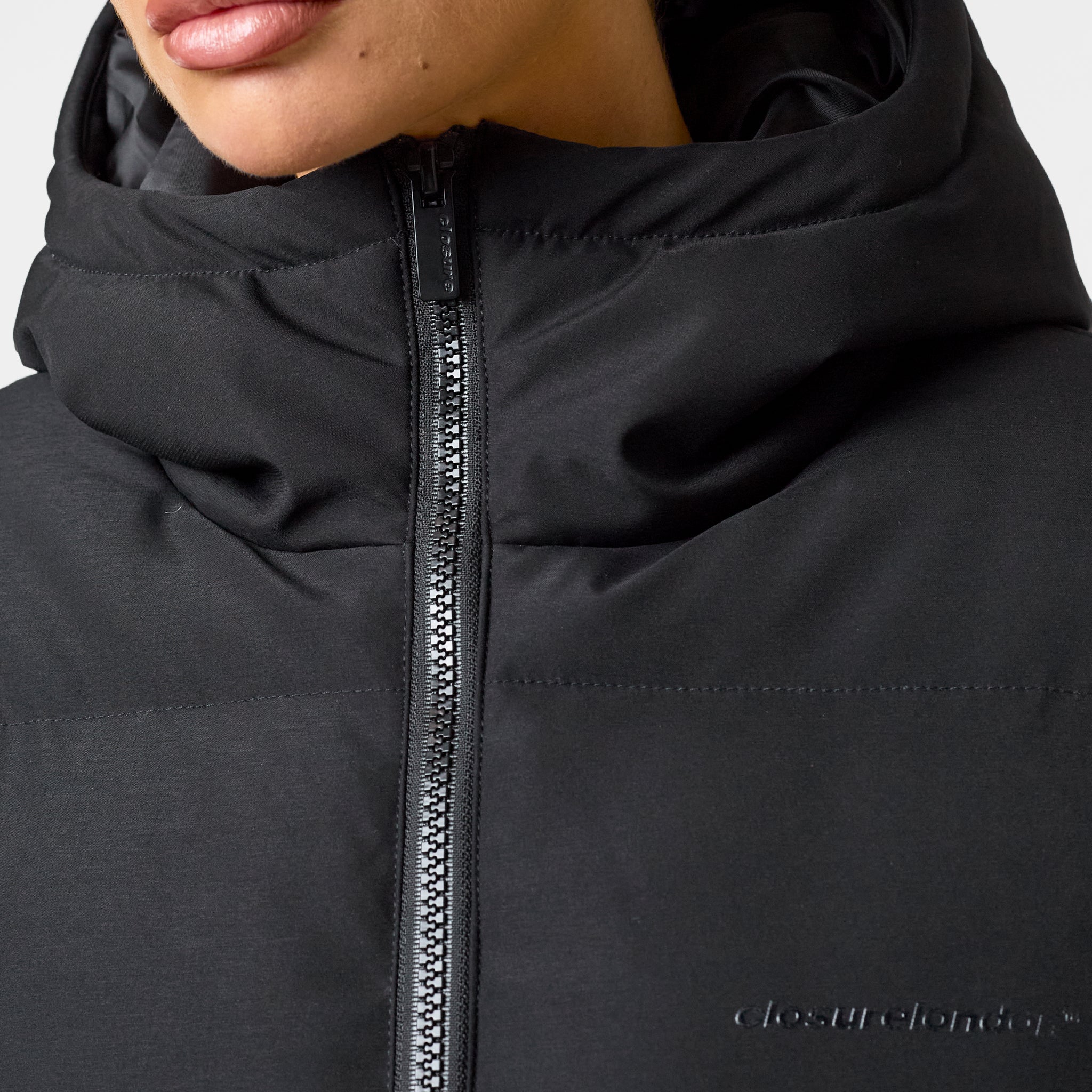 Meet your new essential: the Storm Cuff Puffer Jacket in black. Designed for ultimate protection and everyday wear, this jacket blends functionality with sleek style. It boasts a large funnel neck hood and a chunky plastic nylon coil zipfor ultimate practicality. A tonal Closure London logo graces the chest, keeping things understated. Expect warmth from ribbed storm cuffs and security from zip pockets, and adjust your fit instantly with the bungee drawcord and adjusterinside the hem.