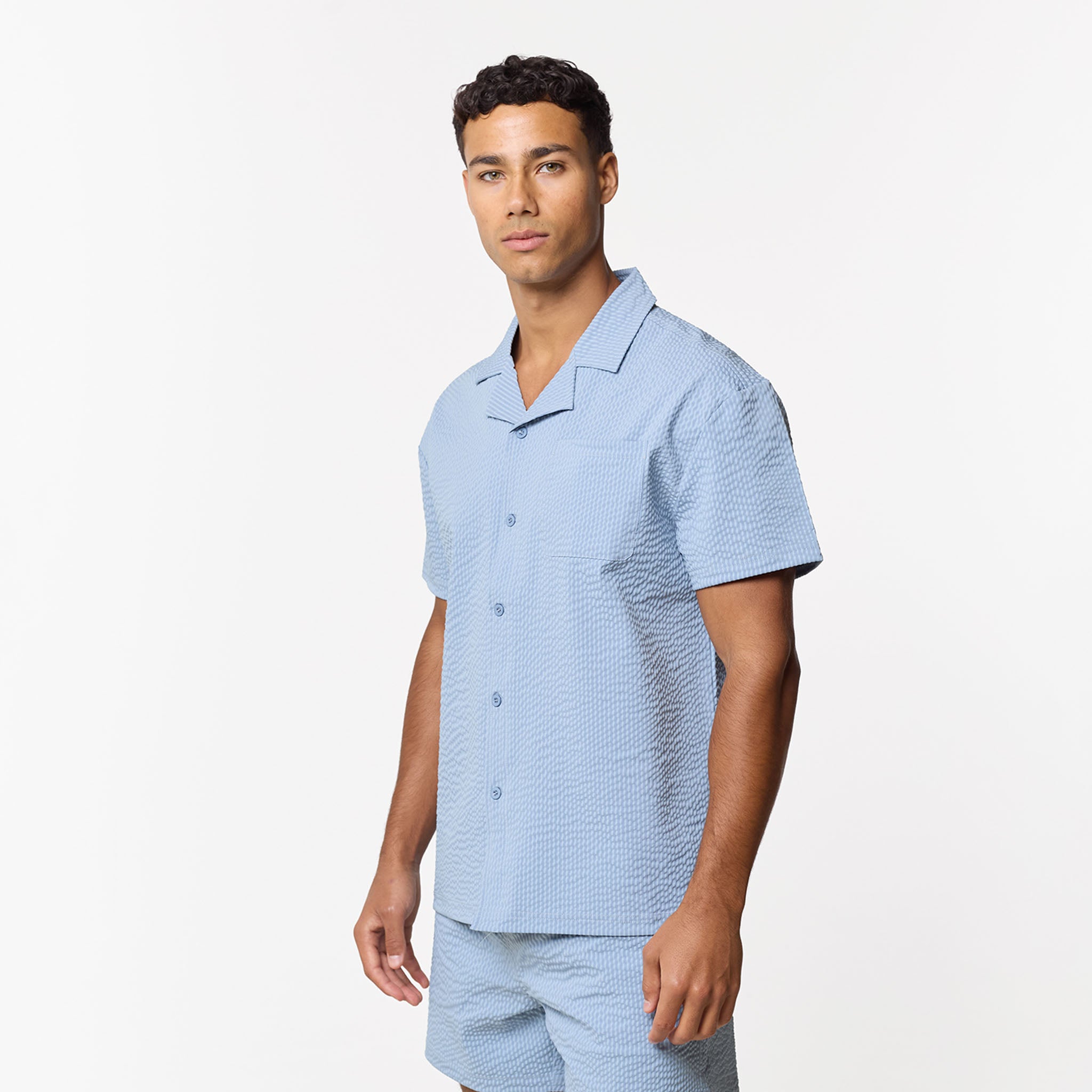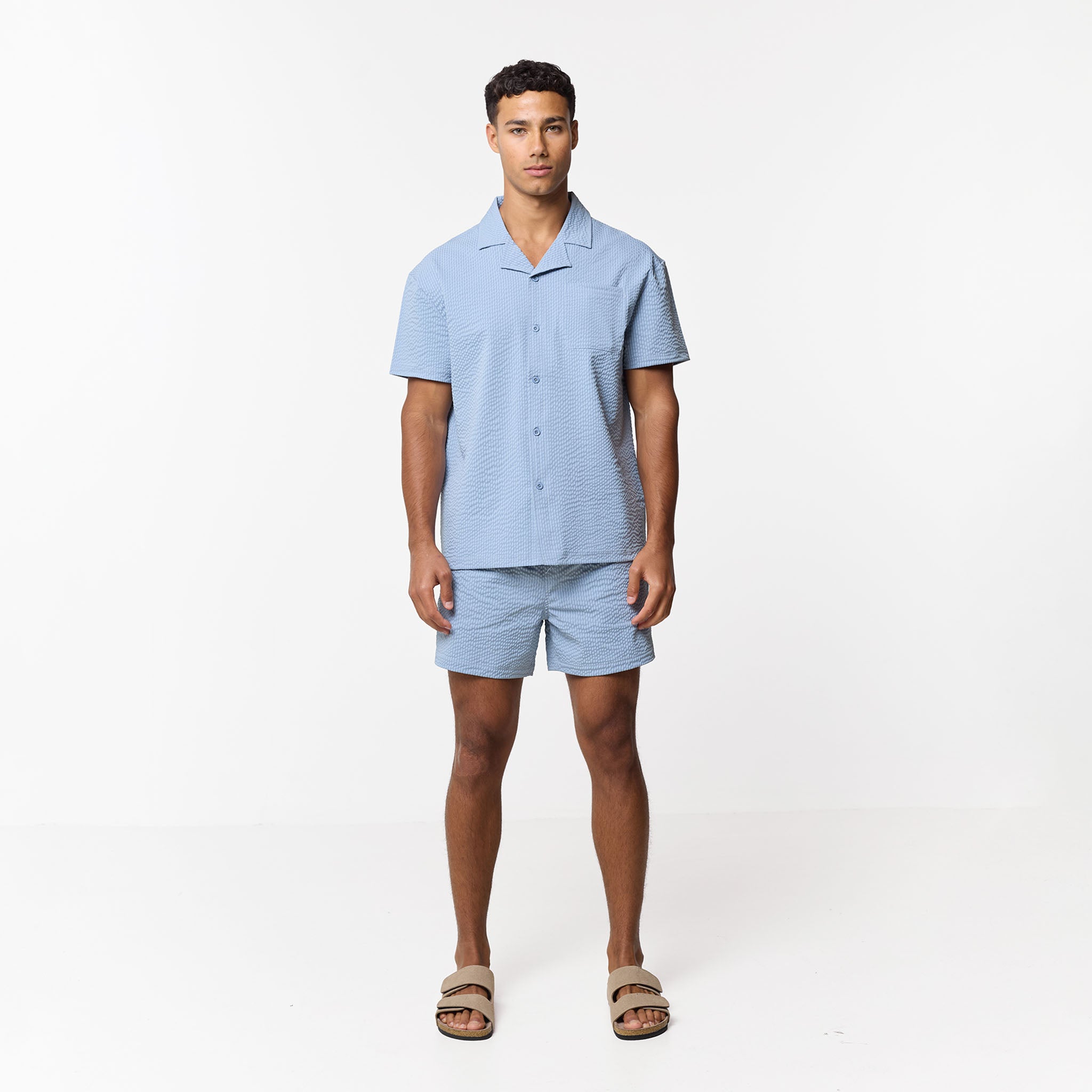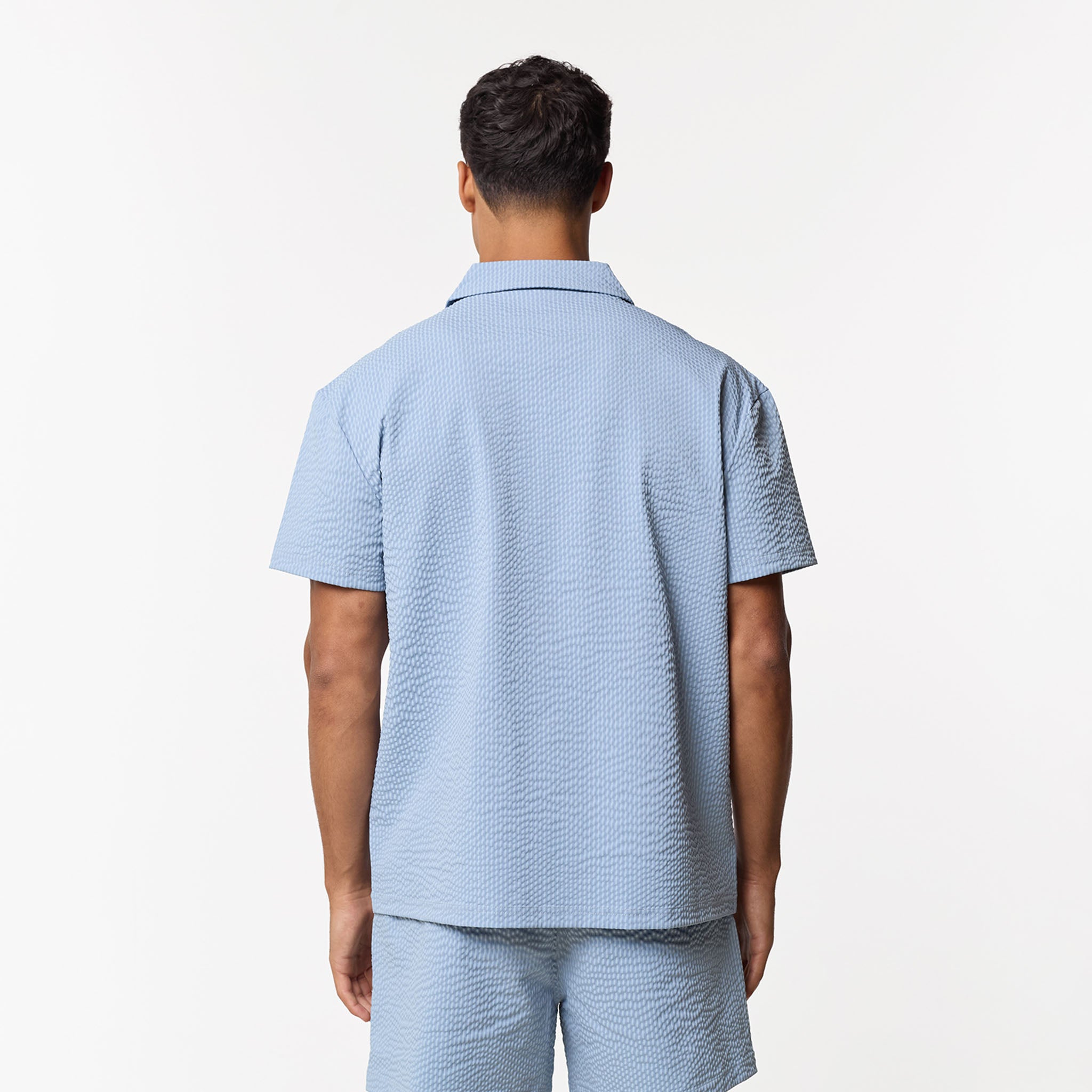 Stay cool and on trend with the  light blue Seersucker Shirt, a resort piece designed to pair effortlessly with our matching swim shorts for a sophisticated, unified aesthetic. Crafted from iconic puckered fabric that prioritizes natural airflow, the shirt features a structured revere collar and internal stand to ensure the neckline remains crisp from the beach to the boardwalk. Refined tailoring including forward-pitched shoulders, a minimalist grown-on placket, and tonal four-hole buttons creates a polished silhouette, all finished with clean-turned cuffs and our signature woven icon label at the pocket edge for a subtle mark of quality.