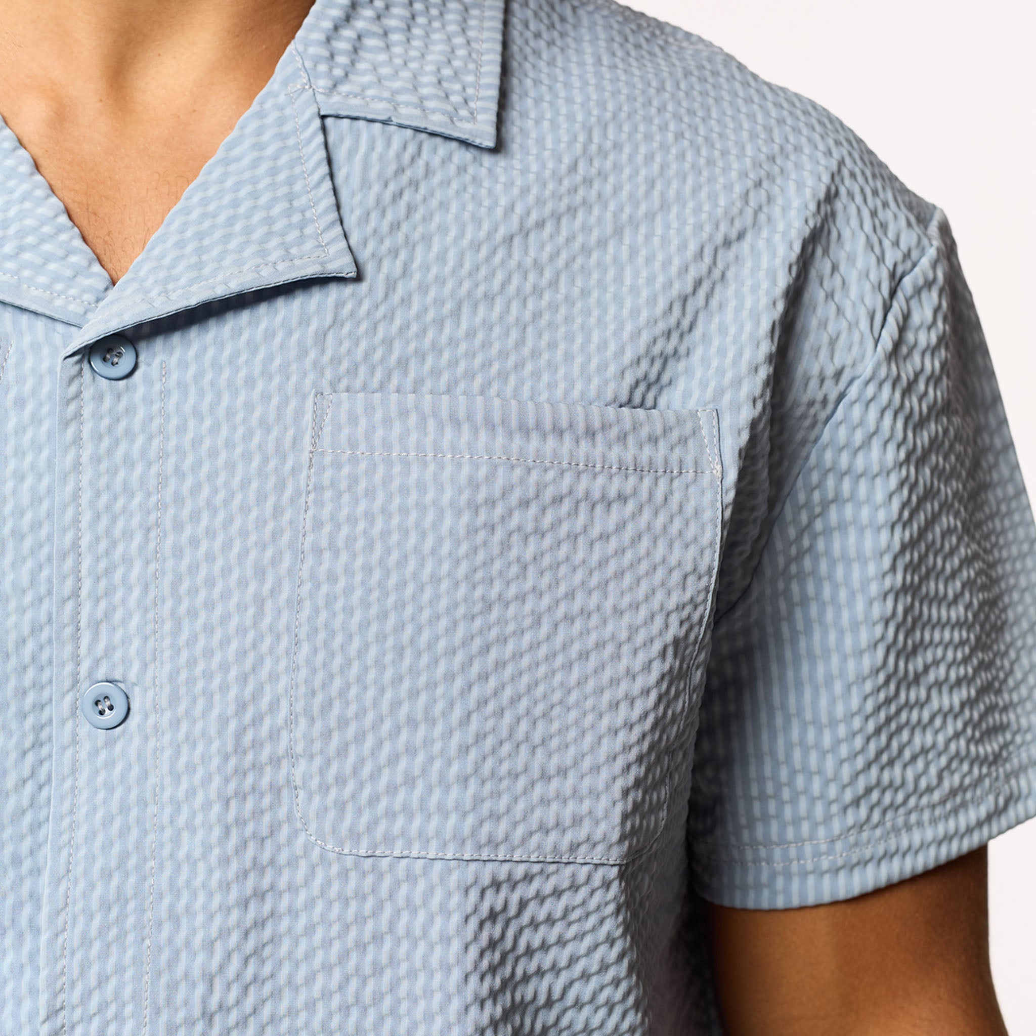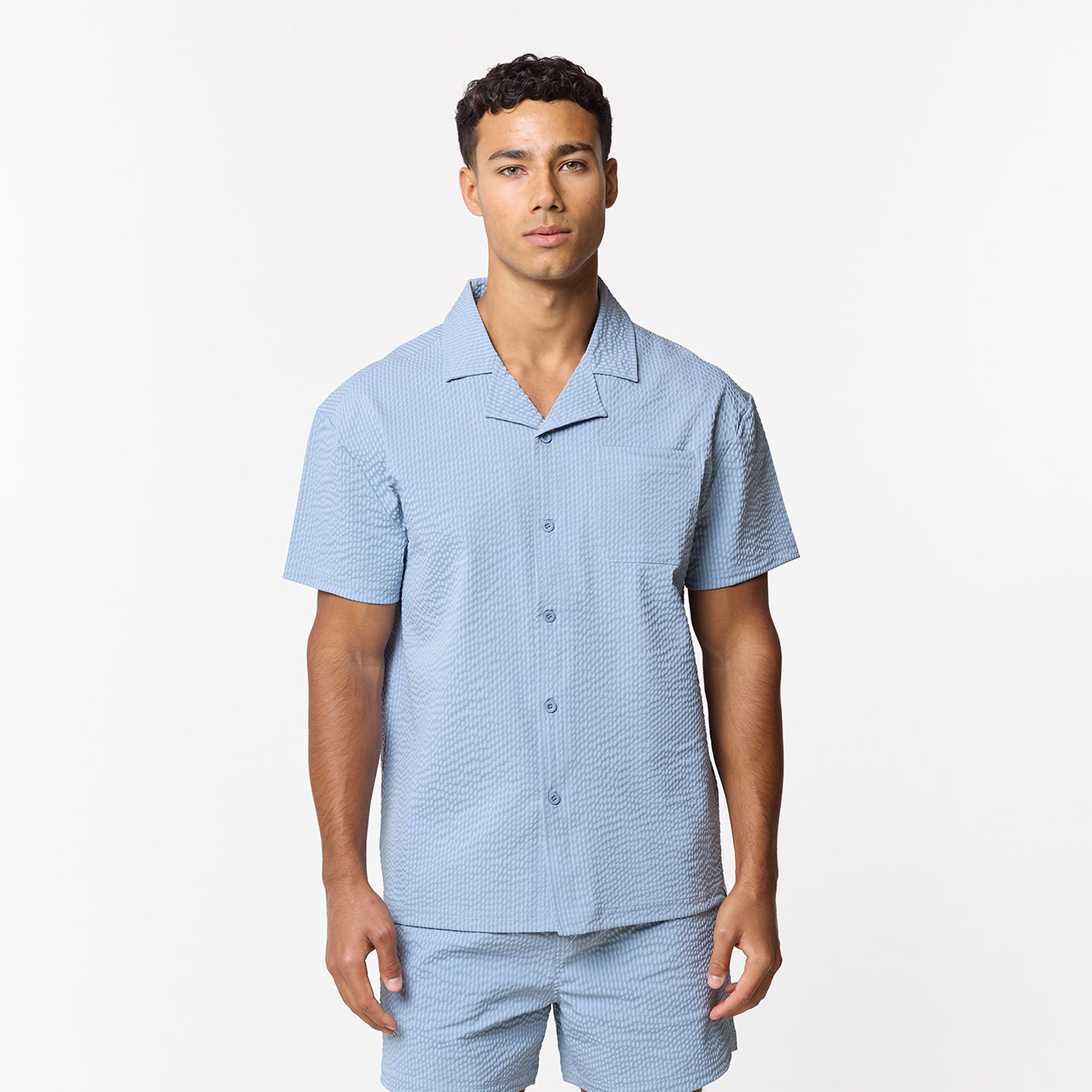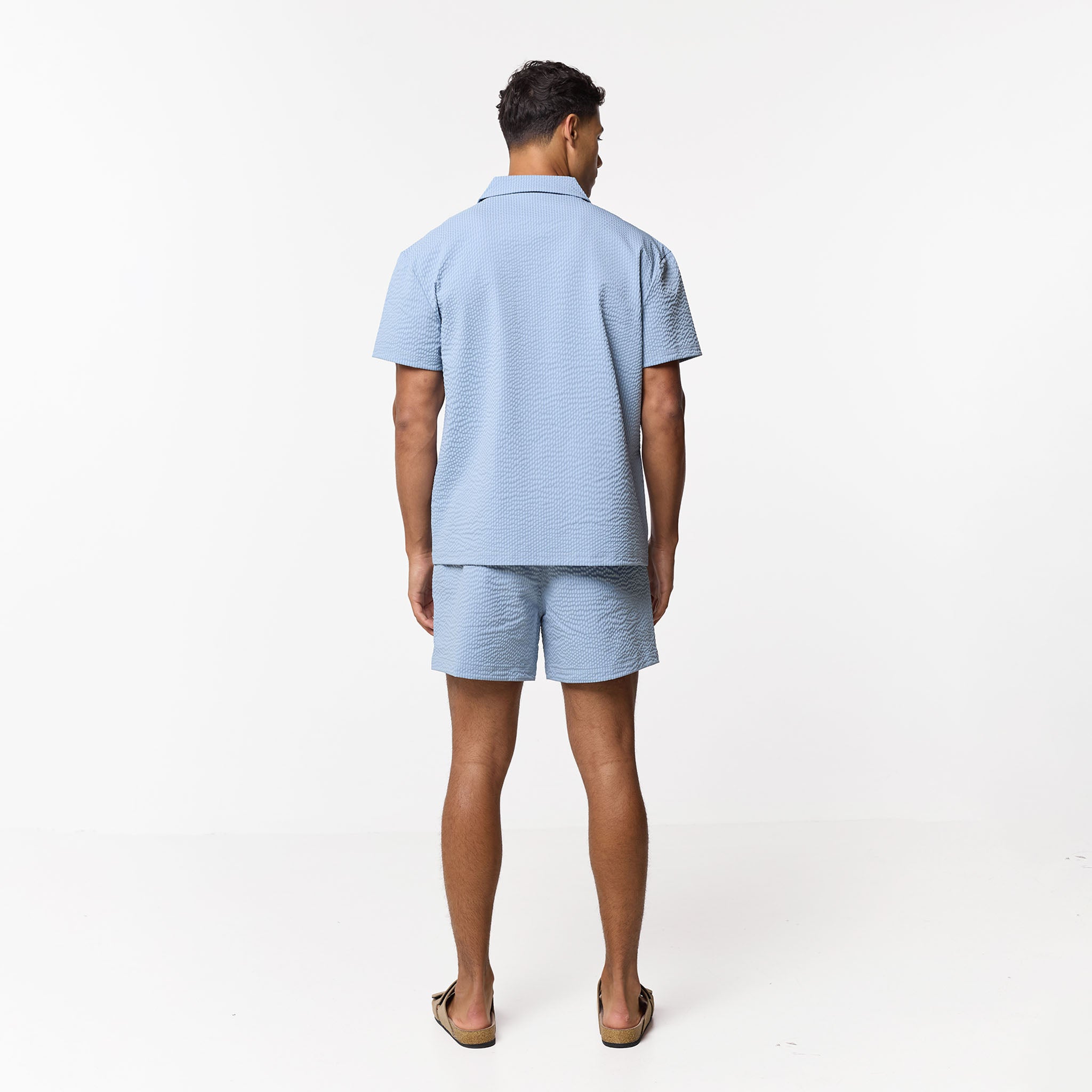 Stay cool and on trend with the  light blue Seersucker Shirt, a resort piece designed to pair effortlessly with our matching swim shorts for a sophisticated, unified aesthetic. Crafted from iconic puckered fabric that prioritizes natural airflow, the shirt features a structured revere collar and internal stand to ensure the neckline remains crisp from the beach to the boardwalk. Refined tailoring including forward-pitched shoulders, a minimalist grown-on placket, and tonal four-hole buttons creates a polished silhouette, all finished with clean-turned cuffs and our signature woven icon label at the pocket edge for a subtle mark of quality.