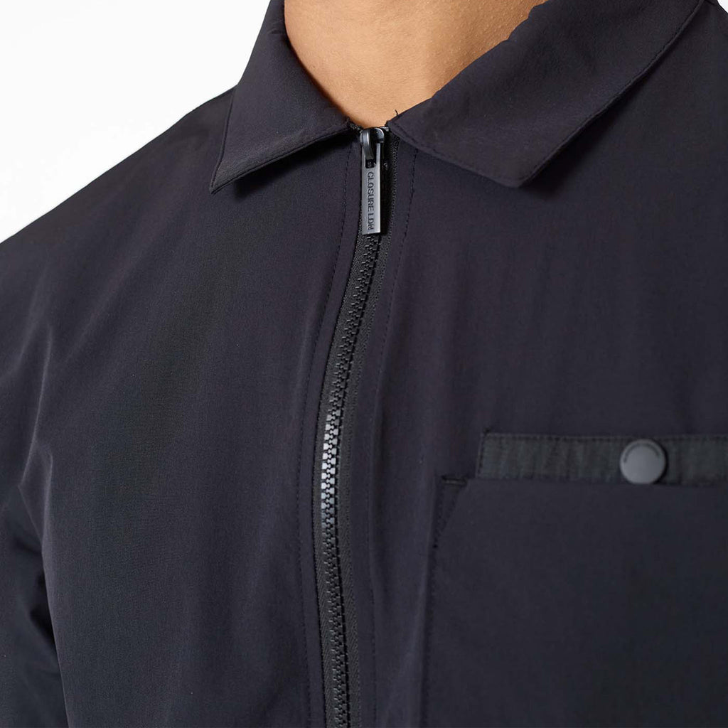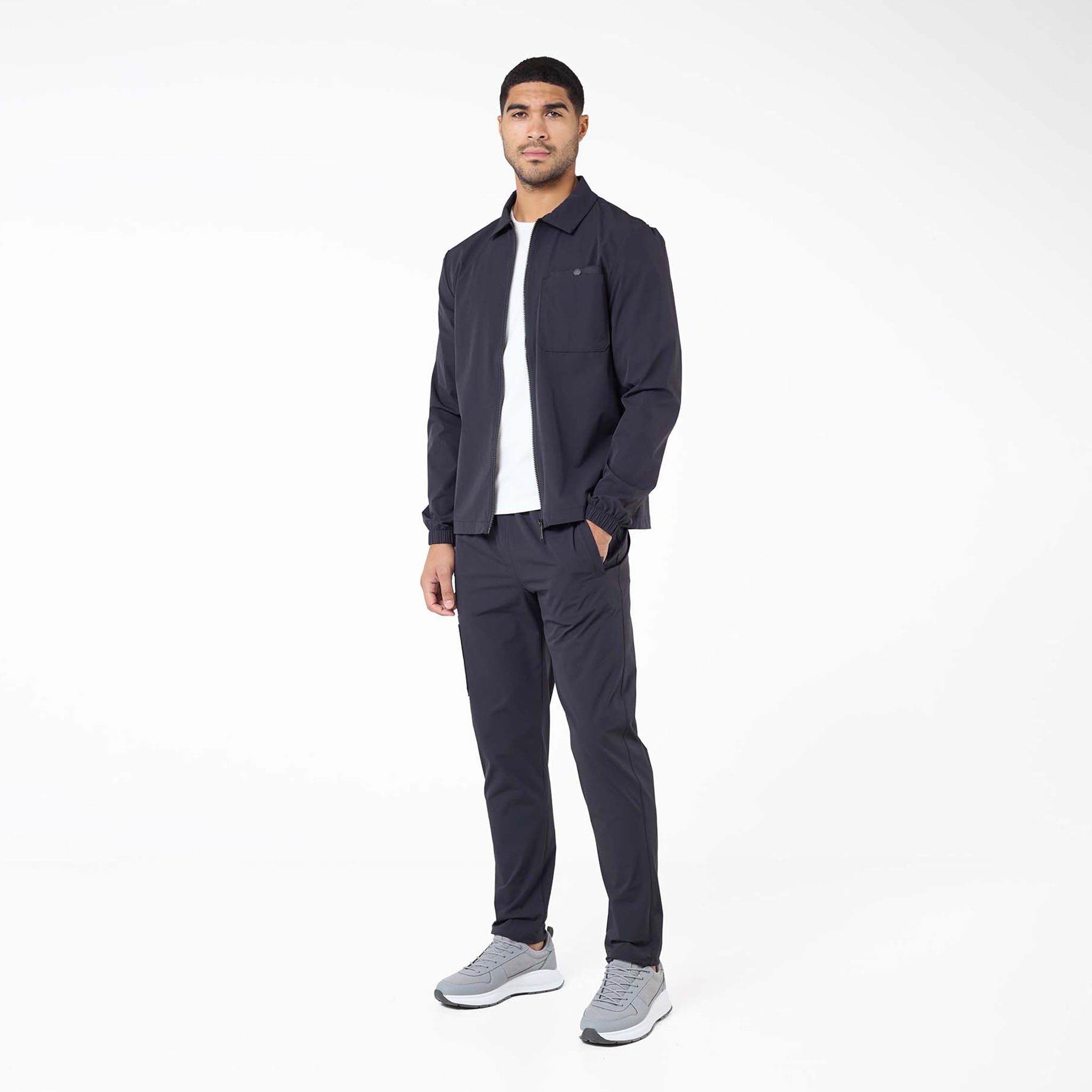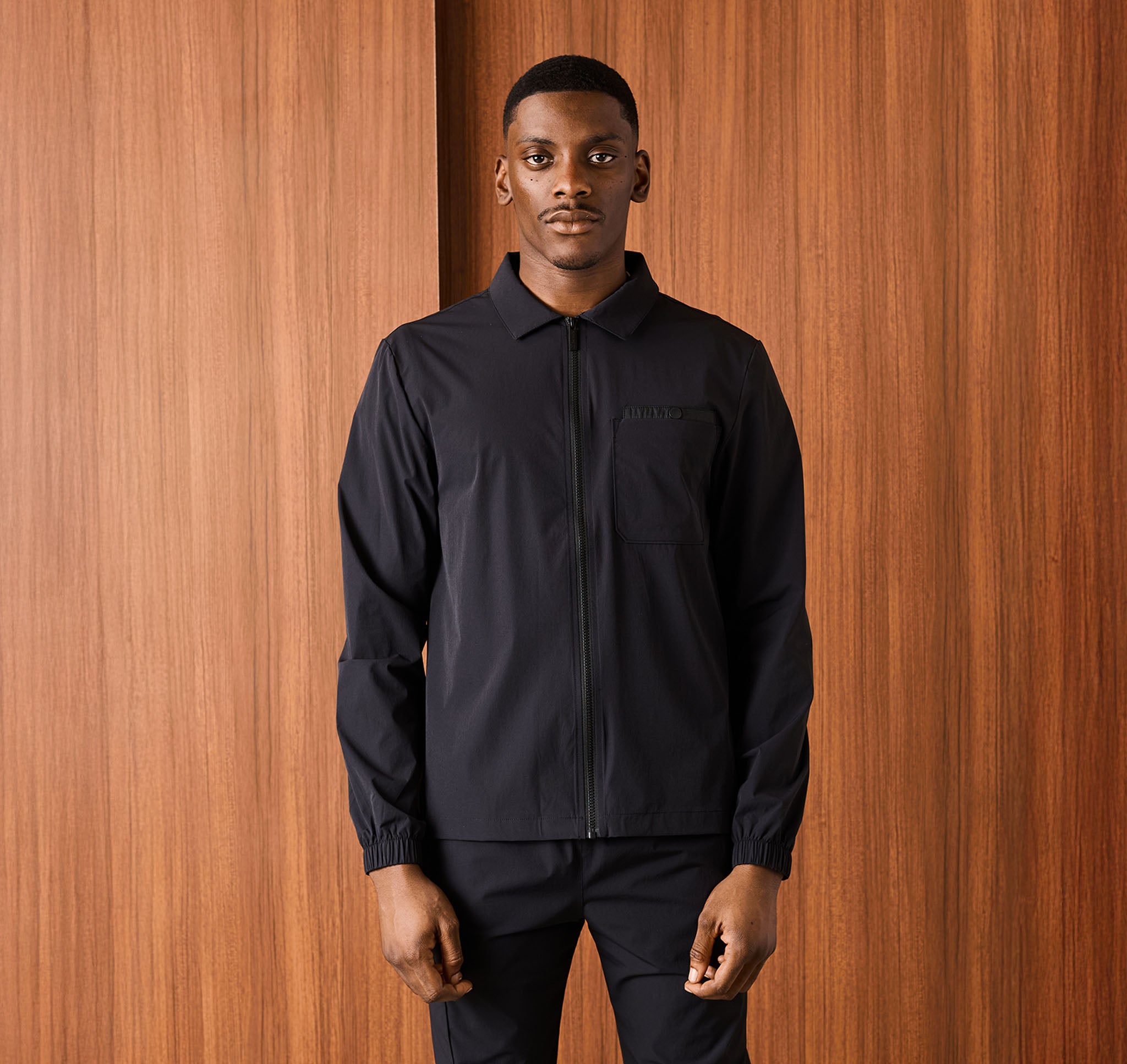 Elevate your layering game with our Double Pocket Tech Overshirt in Black. This versatile overshirt blends sharp style with practical details, perfect for a modern aesthetic. It features a crisp self-fabric collar with edge stitch and a structured collar stand for a refined finish. The smooth zip fastening is equipped with a branded zip pull. Functionality meets design with a unique double-layered chest patch pocket secured by a press stud fastening. The self-fabric elasticated cuffs and self-turn hem provide a neat, comfortable fit. A subtle Closure London branded metal badge adds a touch of premium quality, while the rear yoke seam with single edge stitch enhances its tailored aesthetic.