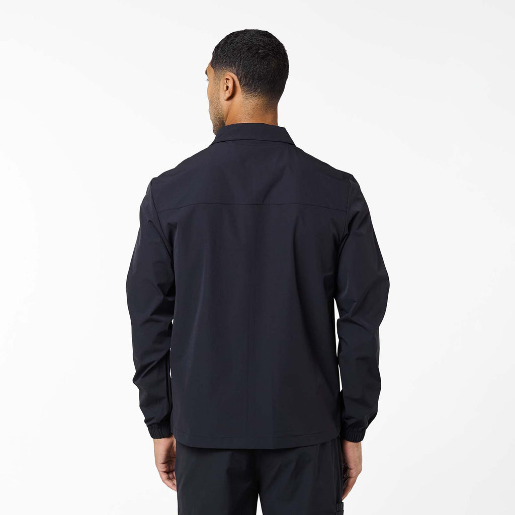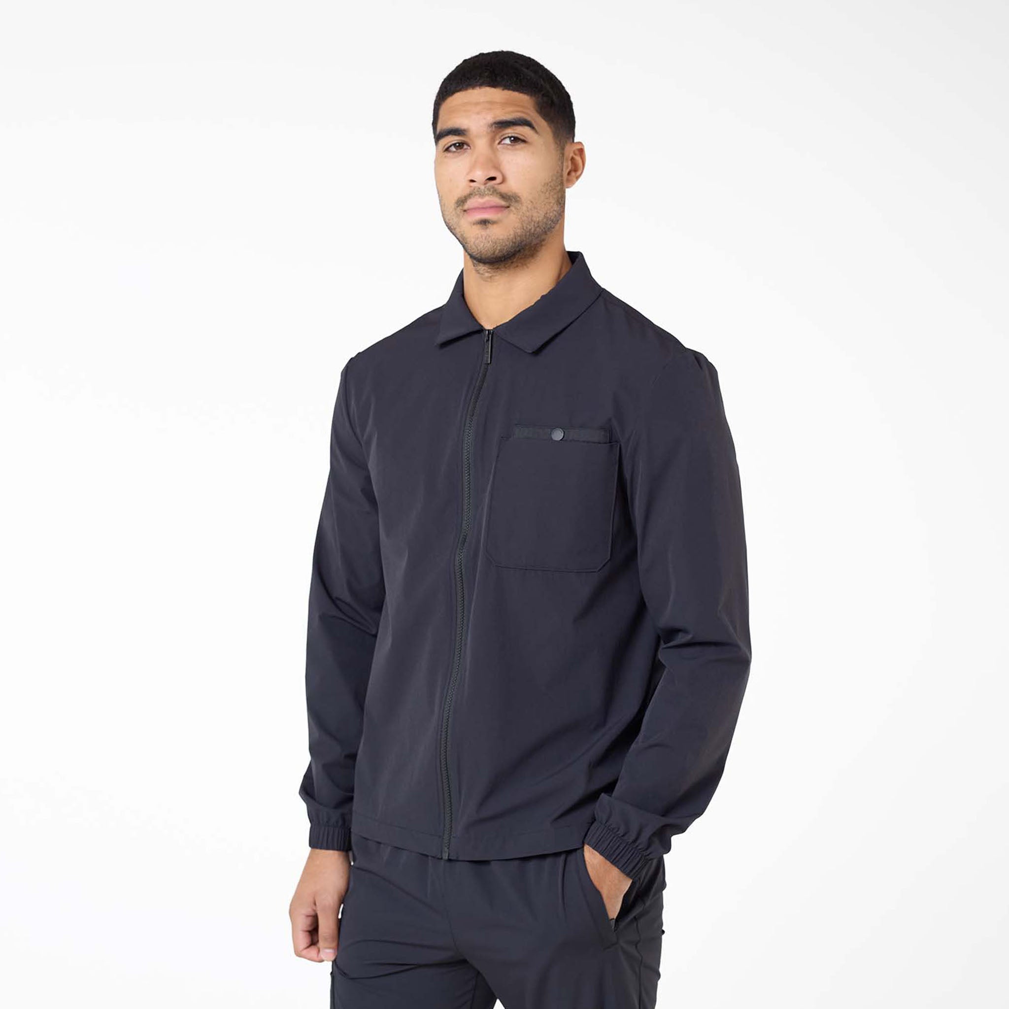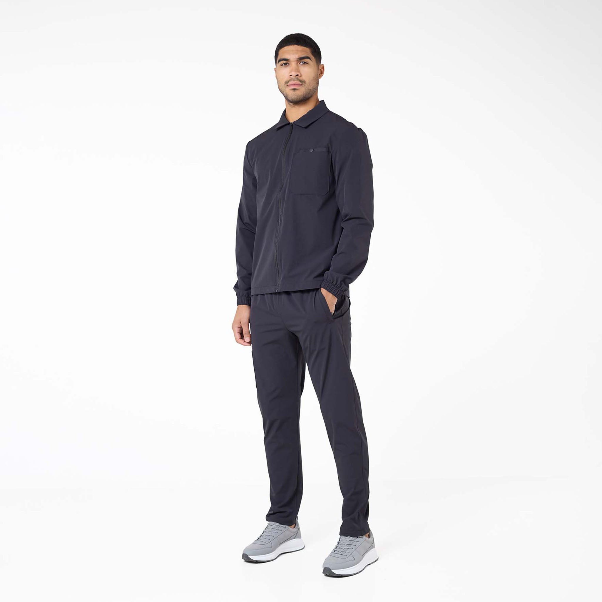 Elevate your layering game with our Double Pocket Tech Overshirt in Black. This versatile overshirt blends sharp style with practical details, perfect for a modern aesthetic. It features a crisp self-fabric collar with edge stitch and a structured collar stand for a refined finish. The smooth zip fastening is equipped with a branded zip pull. Functionality meets design with a unique double-layered chest patch pocket secured by a press stud fastening. The self-fabric elasticated cuffs and self-turn hem provide a neat, comfortable fit. A subtle Closure London branded metal badge adds a touch of premium quality, while the rear yoke seam with single edge stitch enhances its tailored aesthetic.