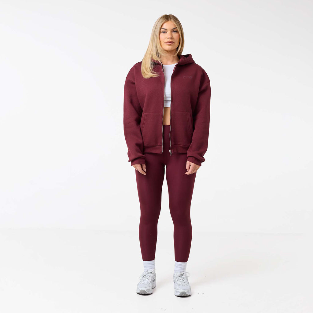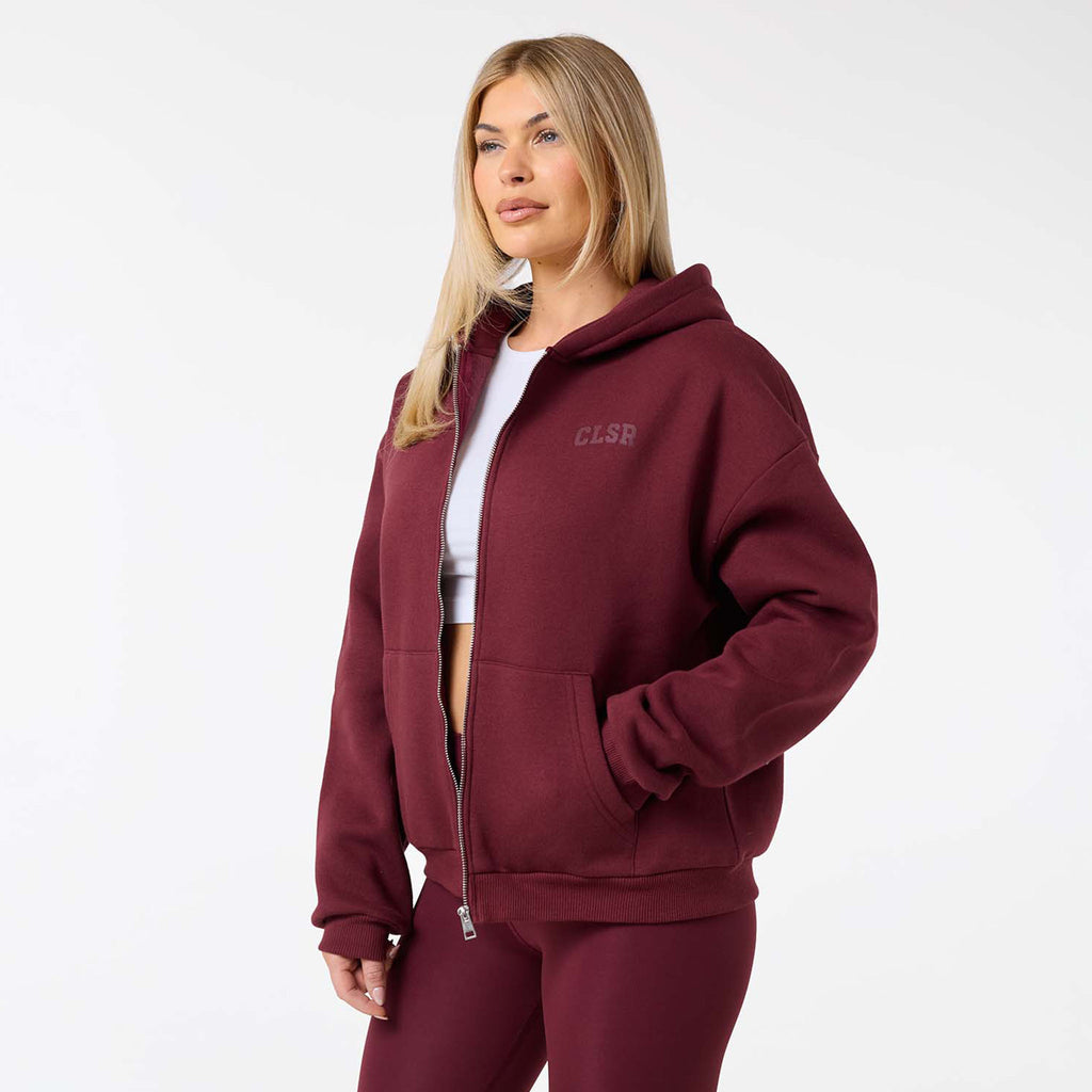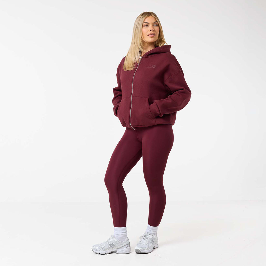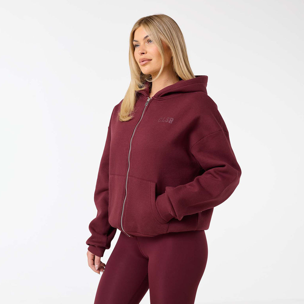 Meet your new go-to layer, the Collegiate Full Zip Hoodie in burgundy, designed for ultimate comfort and effortless style. Made from a plush 300G brushback fleece, it's the perfect weight for warmth without the bulk. Featuring a soft hood lining and a functional double-ended zipper, offering multiple ways to wear it. Practical details like the spacious kangaroo pocket and classic ribbed cuffs and hem enhance its versatility. A clean CLSR chest logo and a large CLSR logo on the back provide a subtle and sleek branding accent, making this a staple piece for any wardrobe. Team with second skin leggings for a laid back yet coordinated look.