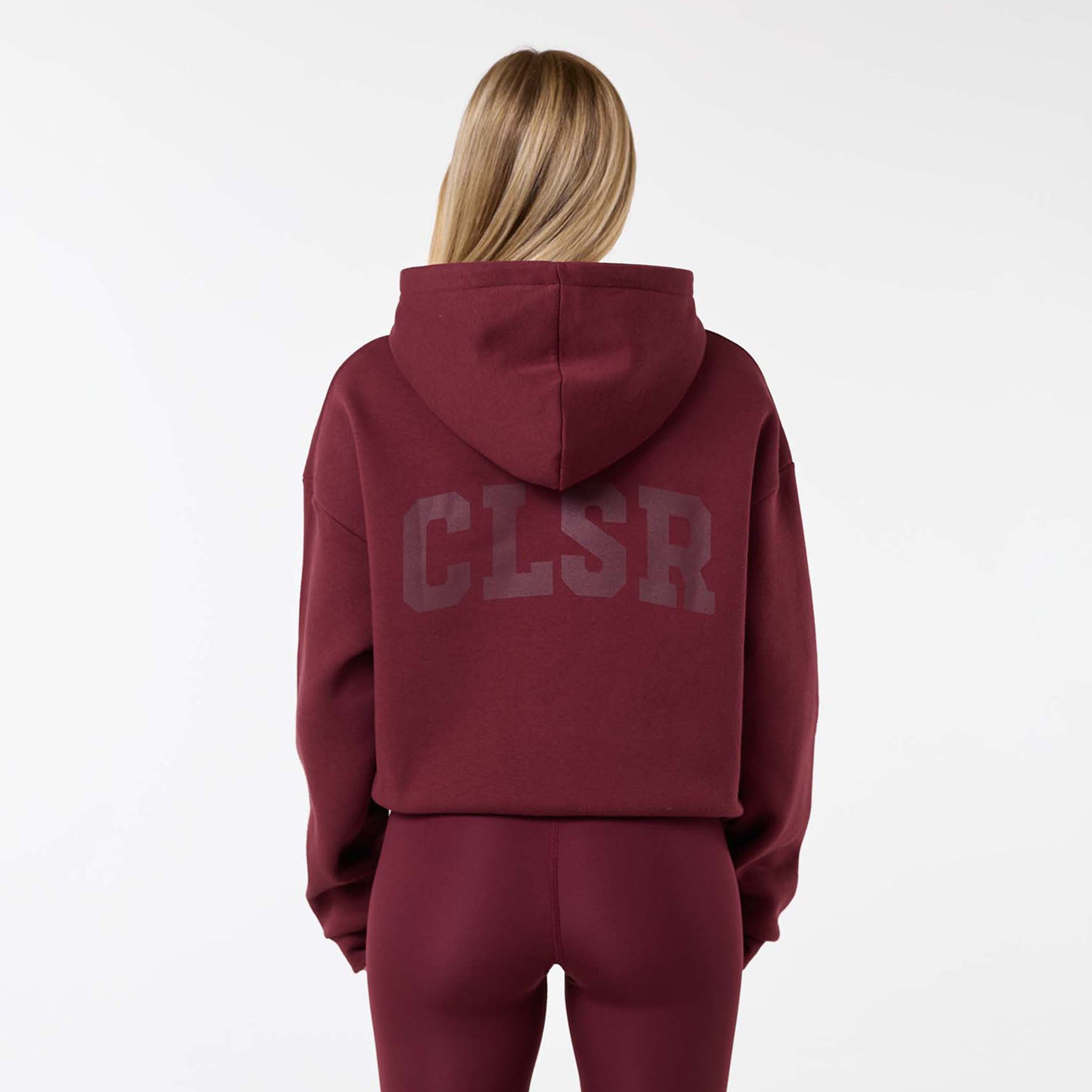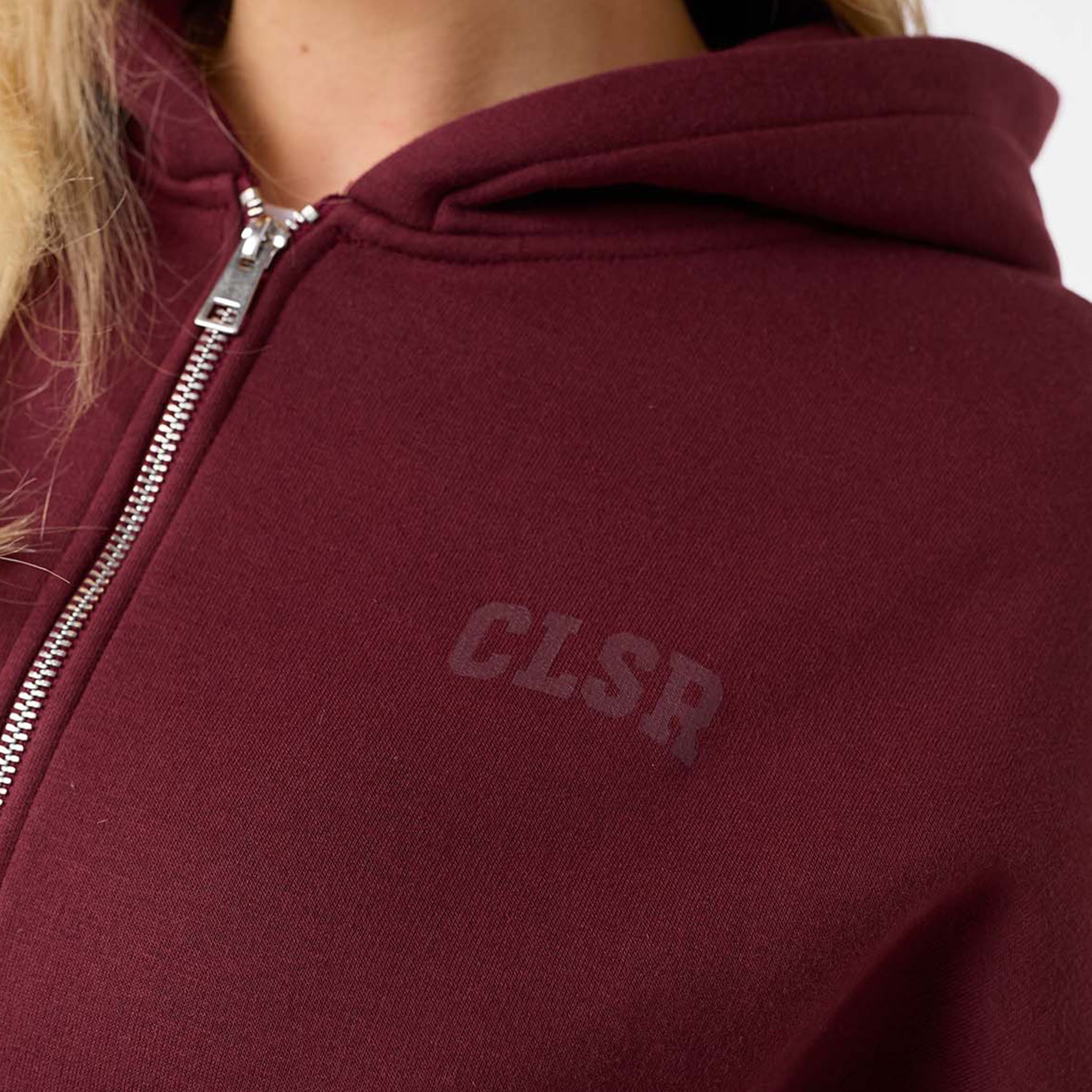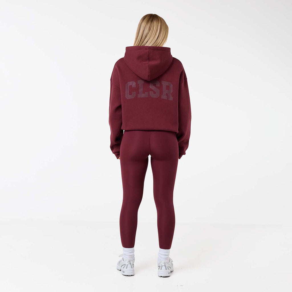 Meet your new go-to layer, the Collegiate Full Zip Hoodie in burgundy, designed for ultimate comfort and effortless style. Made from a plush 300G brushback fleece, it's the perfect weight for warmth without the bulk. Featuring a soft hood lining and a functional double-ended zipper, offering multiple ways to wear it. Practical details like the spacious kangaroo pocket and classic ribbed cuffs and hem enhance its versatility. A clean CLSR chest logo and a large CLSR logo on the back provide a subtle and sleek branding accent, making this a staple piece for any wardrobe. Team with second skin leggings for a laid back yet coordinated look.