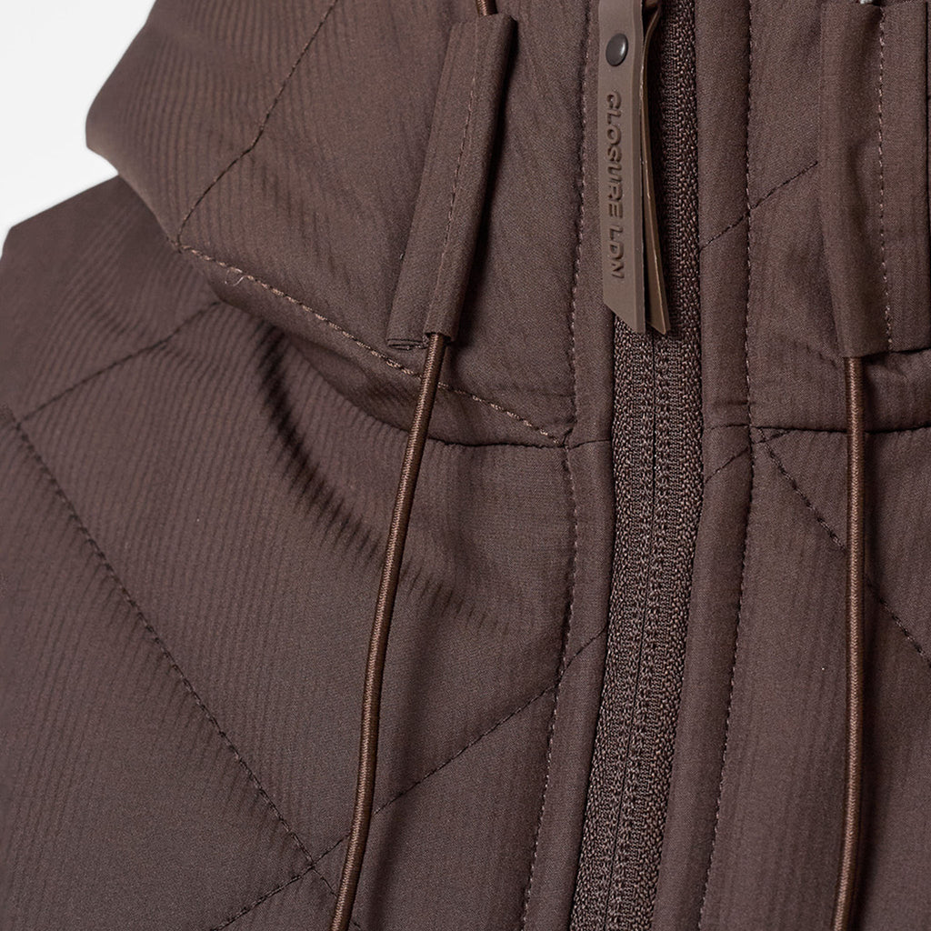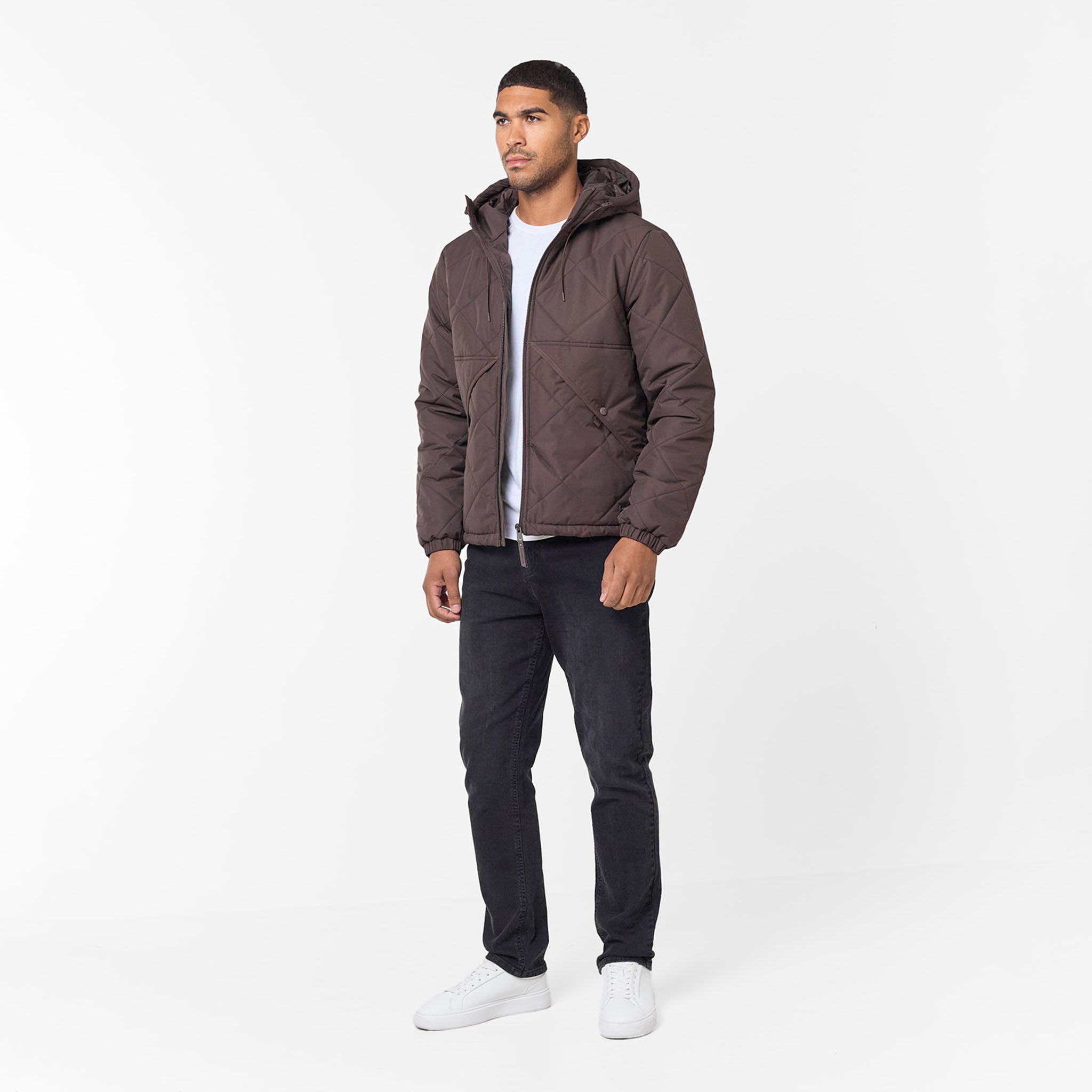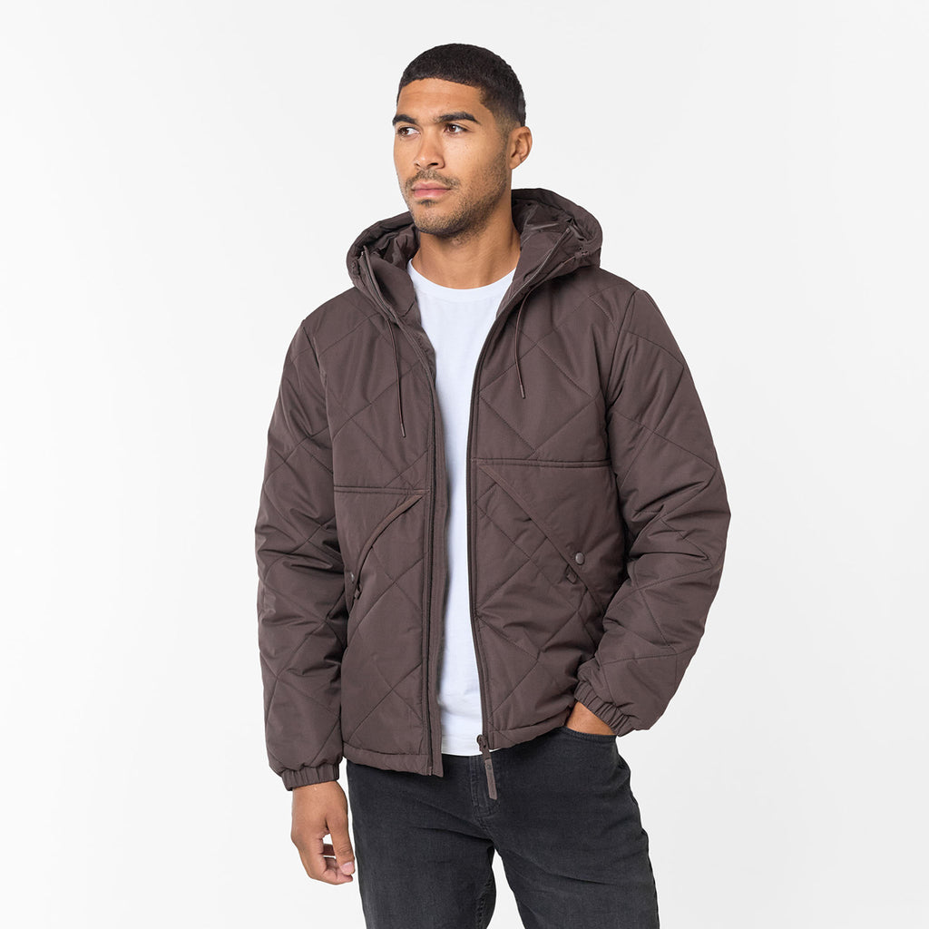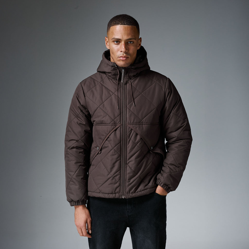 Discover the perfect blend of classic style and modern warmth with our men's diamond quilted puffer jacket in brown. It boasts a comfortable 3-piece panel lined hood and an eye-catching diamond quilted design that sets it apart. Every detail is crafted for quality and convenience, from the rubber zip puller with its high-build logo to the prominent Closure branded rubber badge at the hem. The sleek reverse nylon zip contributes to its refined look, while flap pockets with branded binding offer practical and secure storage. Customise your fit with the strap at the cuff featuring a branded press stud and the bungee cord with adjuster at the hem. An internal welt pocket provides a secure spot for essentials, and the self-turn hem adds a clean, polished finish.