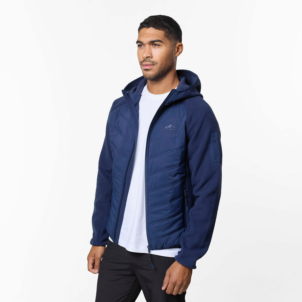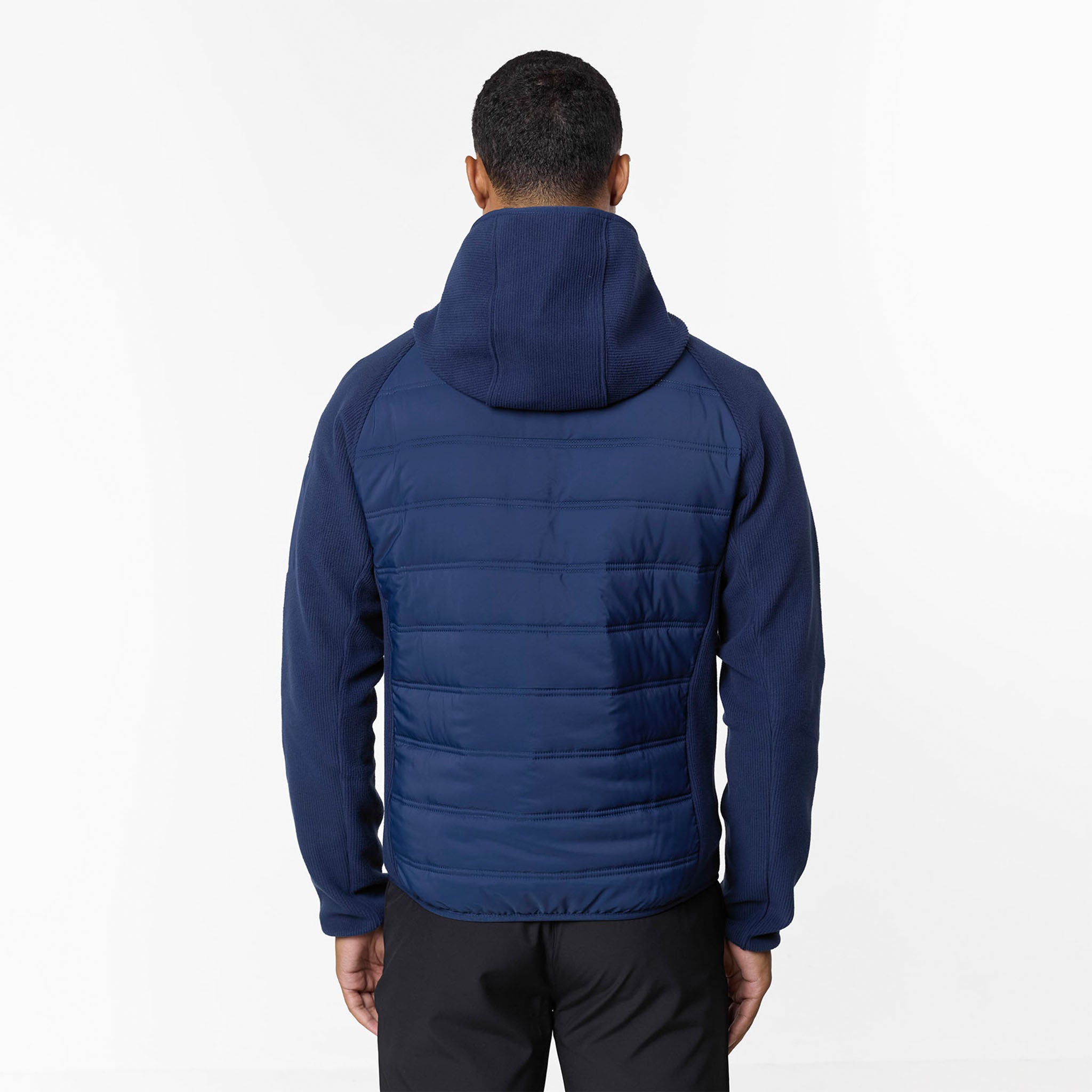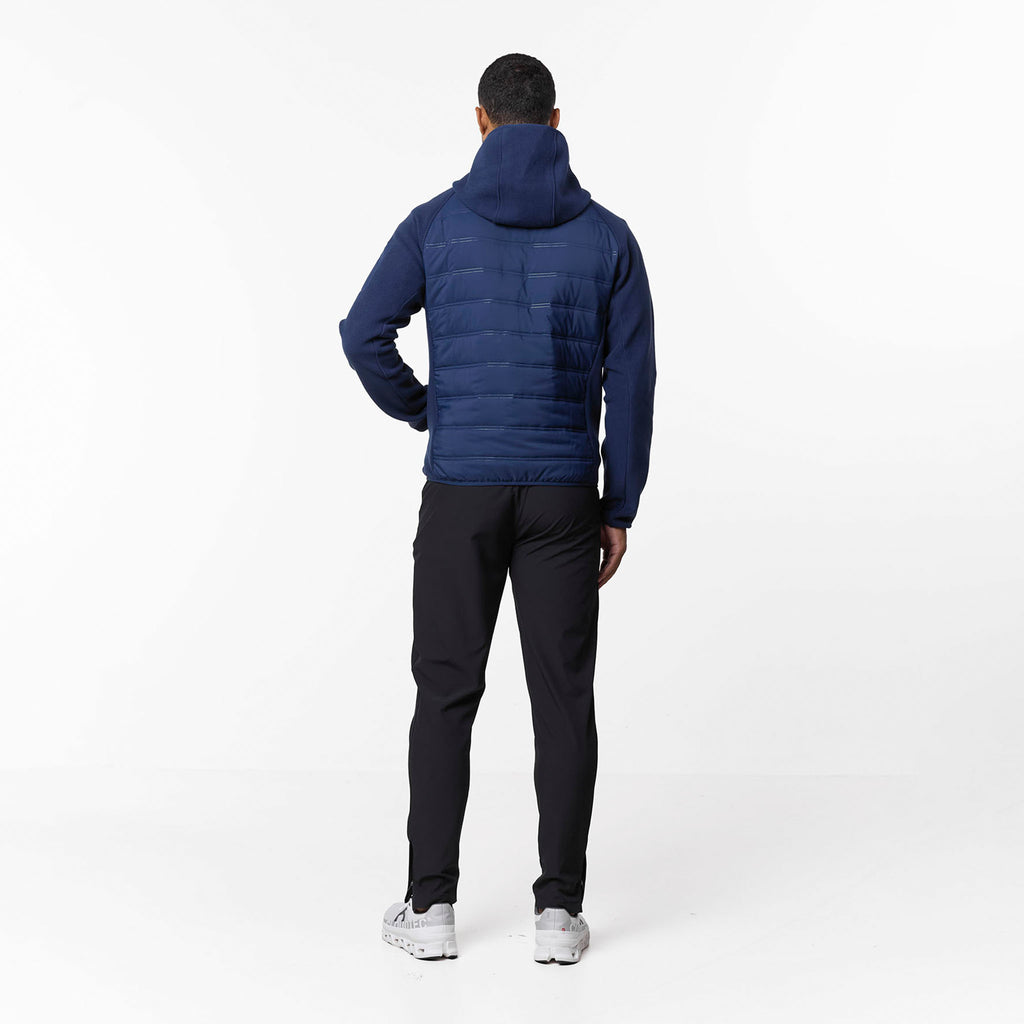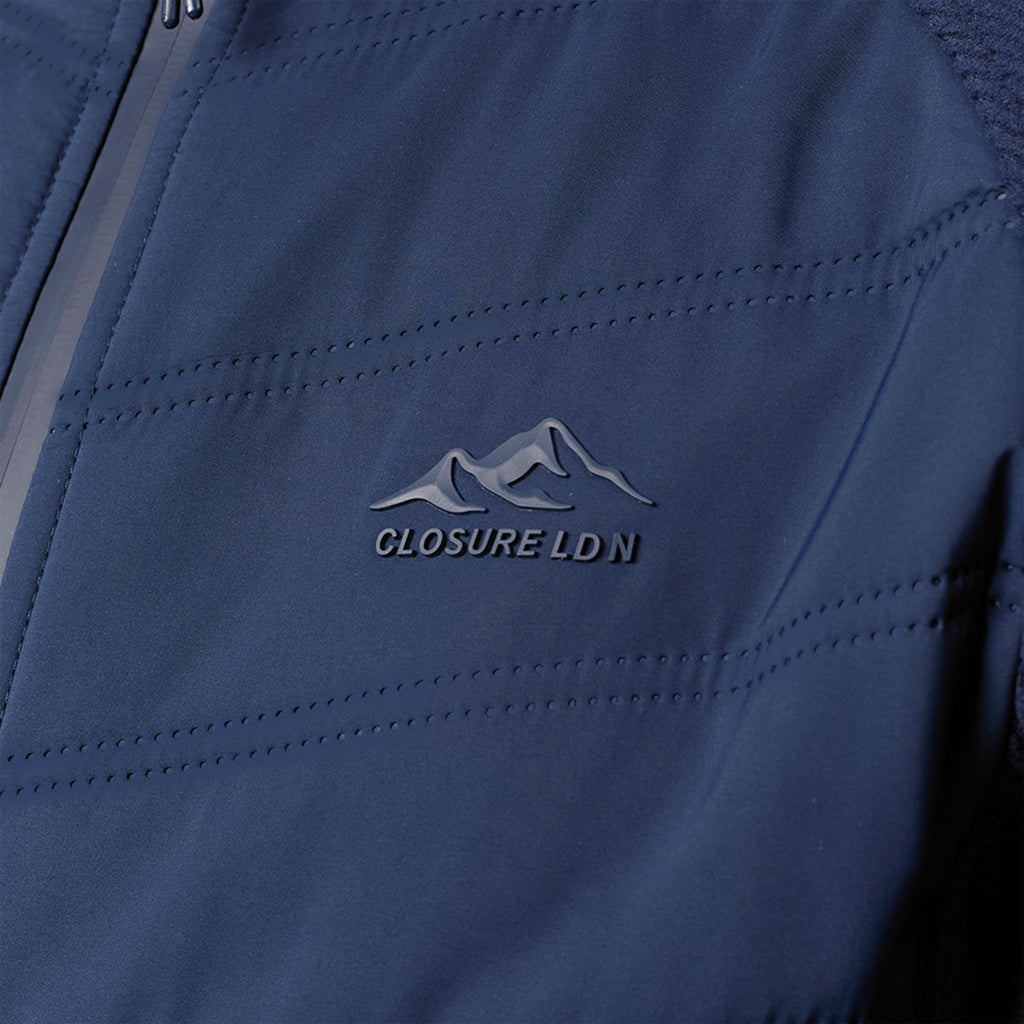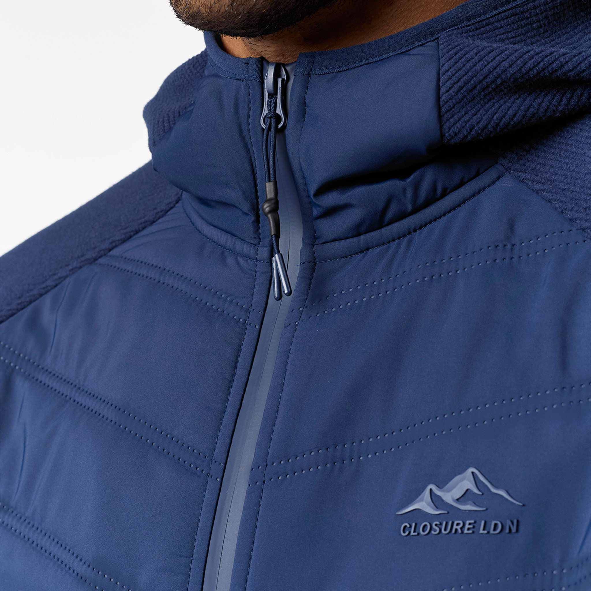 Discover a blend of superior comfort and contemporary style with our Men's Heat Seal Hybrid Jacket in a sophisticated navy. The stitch-free heat seal quilted body panels offer lightweight warmth, seamlessly integrated with a well-defined cut and sew panel 3-piece hood that features elastic binding, mirrored at the cuffs for a secure fit. Ergonomic cut and sew panel detailing further refines the silhouette. This jacket also includes a subtle heat seal sleeve pocket with a concealed zip, functional zip pockets with reverse nylon coil, and a reflective Closure logo on the chest for a stylish and visible finish.