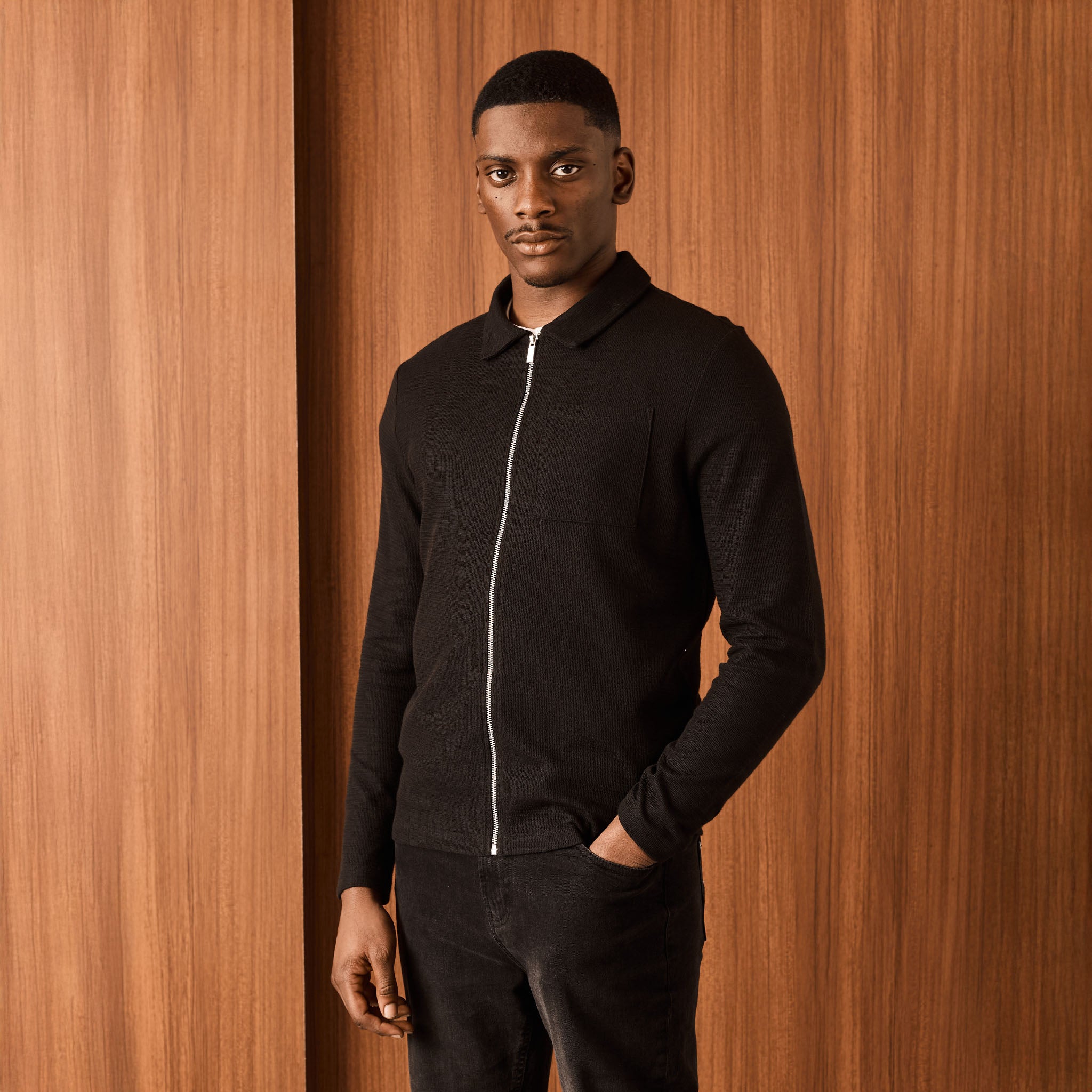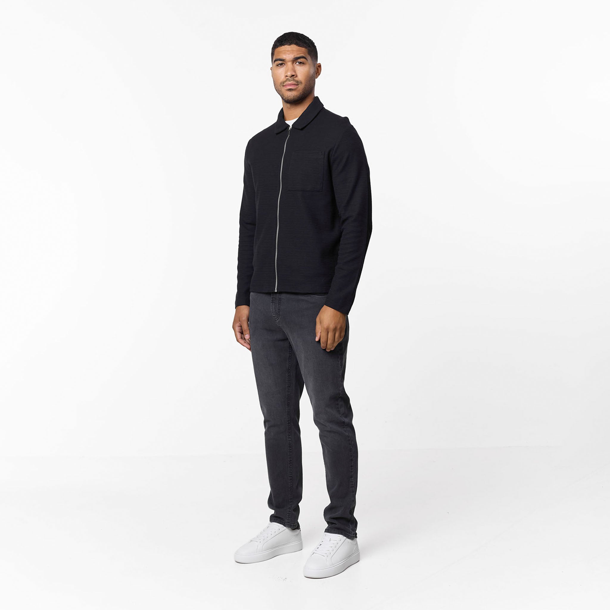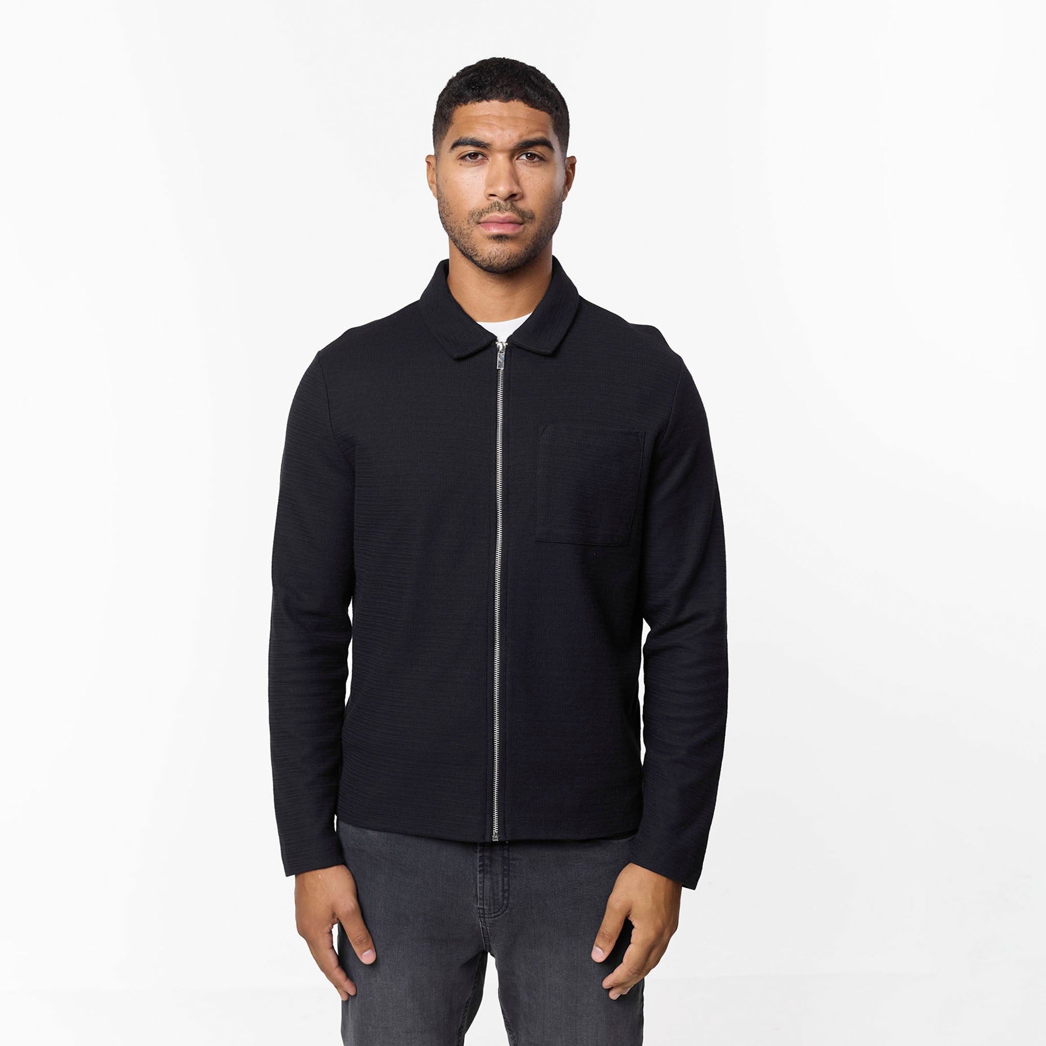Discover the versatile Tonal Knit Zipped Overshirt in essential black. Designed with a regular fit, this knit overshirt delivers both comfort and style. The self-fabric collar and exposed metal zip add refined details, while the patch pocket provides a touch of utility. The tonal knit fabric offers a premium feel and a sophisticated, understated look, making it a perfect layering piece for any occasion.