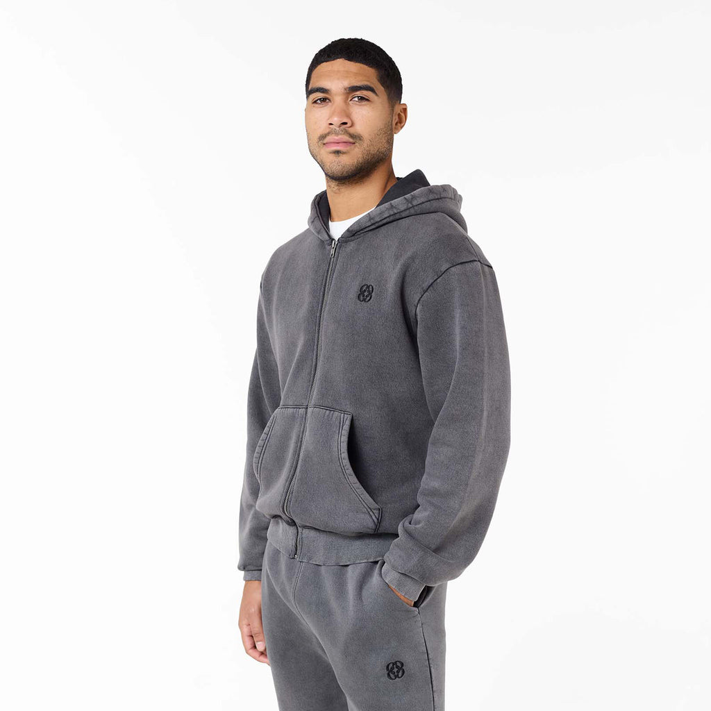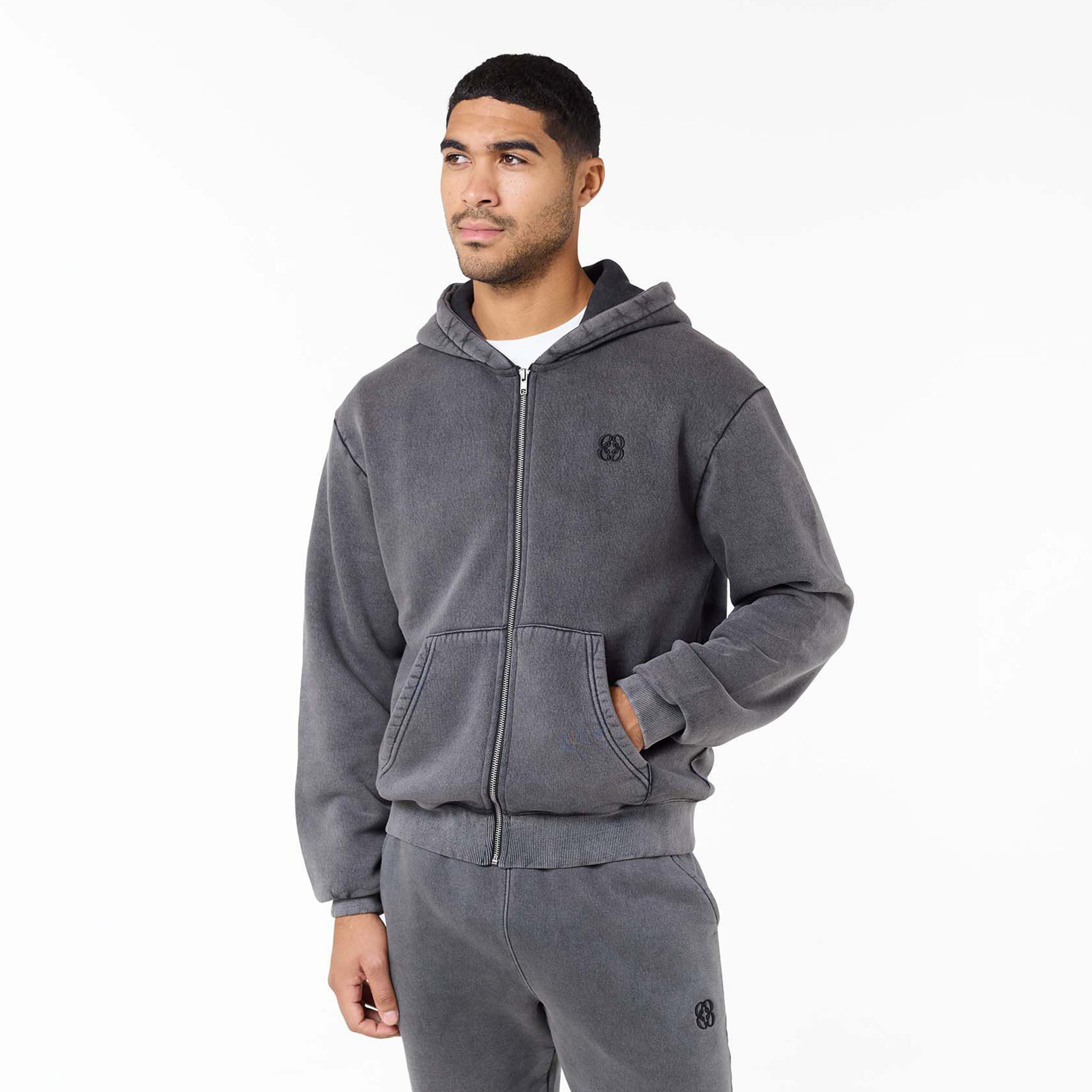 Introducing the Relaxed Full Zip Icon Hoodie in a contemporary washed black shade. Experience a new standard of casual wear with this relaxed full-zip hoodie. The premium gunmetal zipper offers a sleek, modern finish, while a branded metal clasp on the split kangaroo pocket adds a sophisticated touch of detail. Designed with a comfortable fit and finished with ribbed cuffs and hem, this hoodie is crafted for both style and comfort.