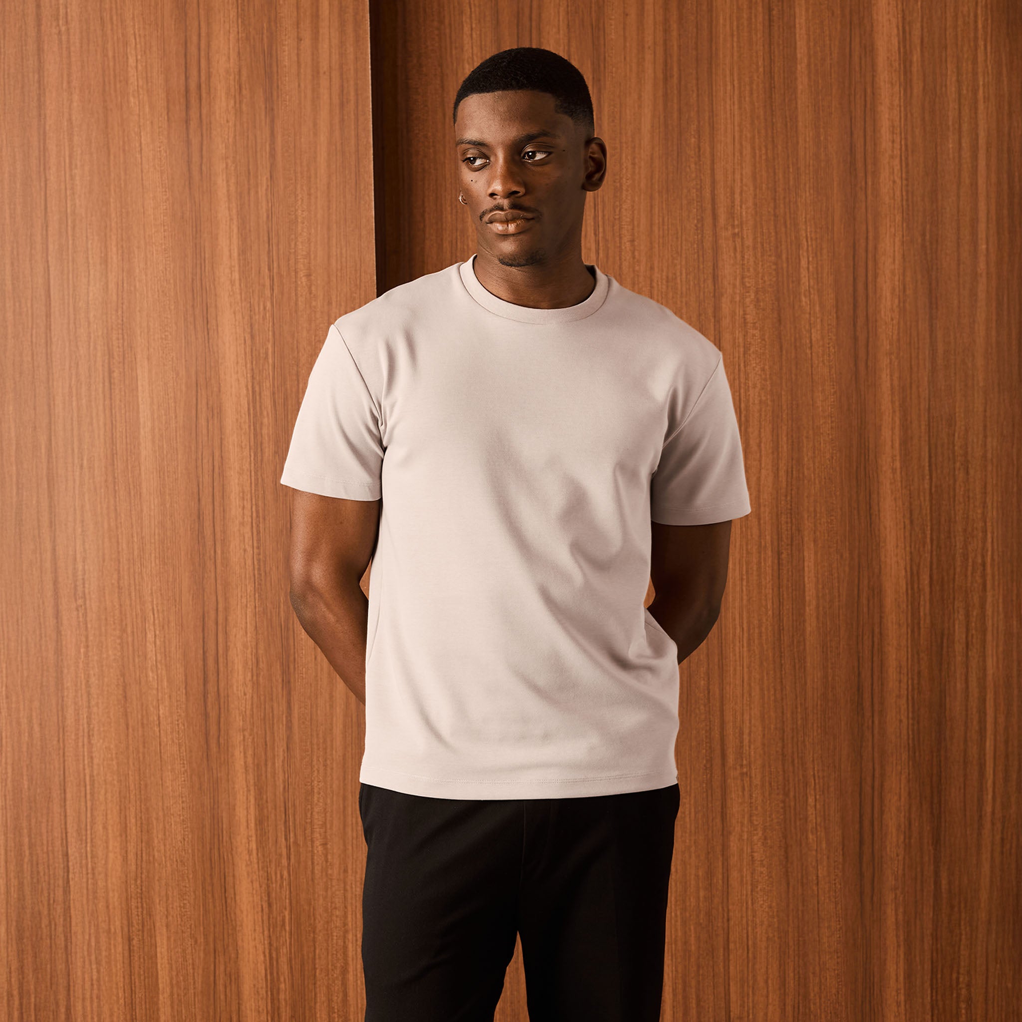 Introducing the Smart Scuba T-Shirt in stone : a timeless essential that embodies understated luxury. Crafted from the finest scuba fabric, it offers an exceptionally soft feel and a structured silhouette that drapes impeccably. Experience unparalleled comfort and versatile style, whether you're dressing it up for a sophisticated evening ensemble or maintaining a refined casual look for everyday wear with the matching shorts. This meticulously crafted garment is a must-have for any discerning individual who values both comfort and style.