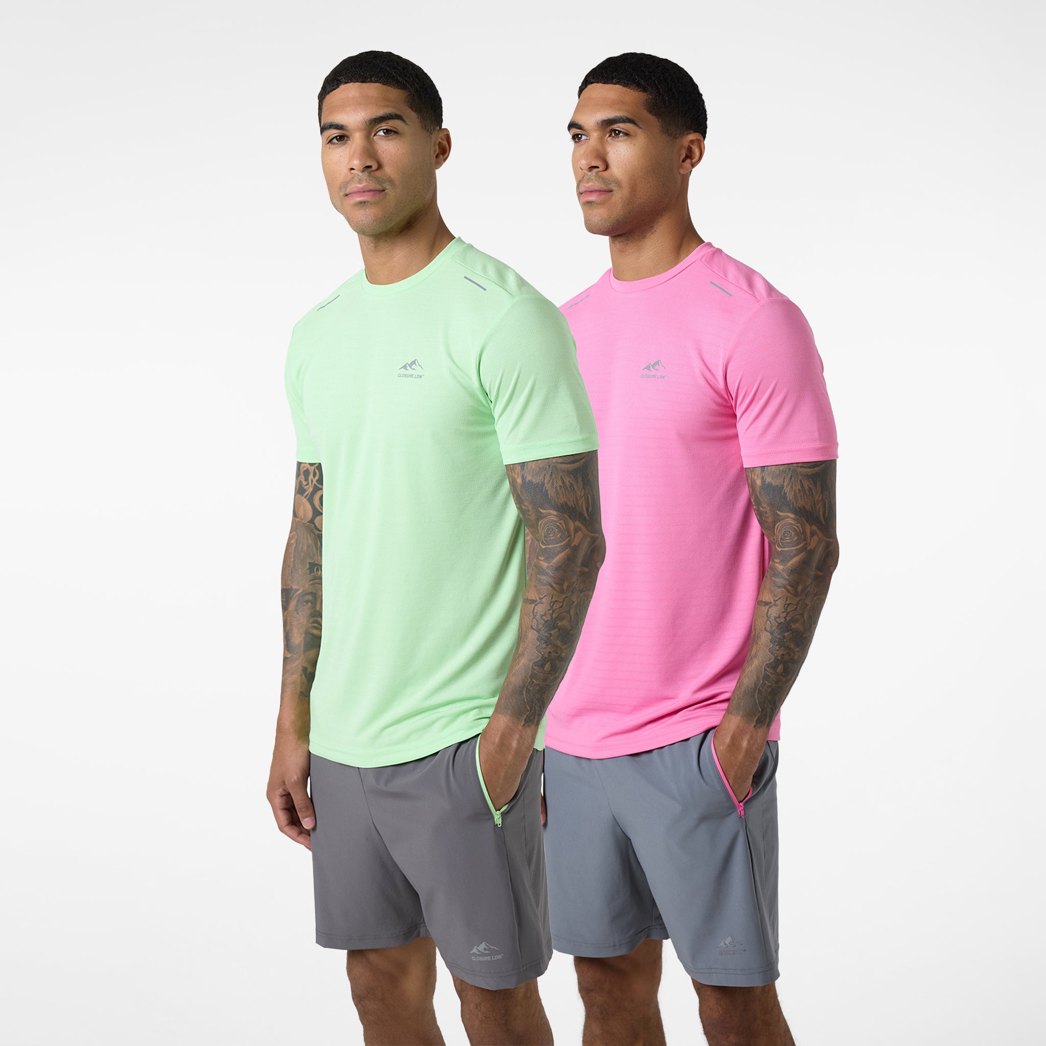 Be ready for your workout schedule with the Training Poly Twinset Duo. Featuring both the Training Twinset Pink & Training Twinset Lime. Each training twinset includes a breathable poly t-shirt and matching shorts, ensuring you stay cool and comfortable from warm-up to cool-down. The crewneck tee features a forward-facing shoulder seam for effortless movement and reflective darts for visibility. The poly bi-stretch shorts offer unrestricted movement with an elasticated waistband and drawstring, a secure contrast zip pocket, and a stylish, flexible cut and sew panel.