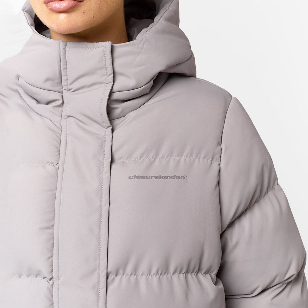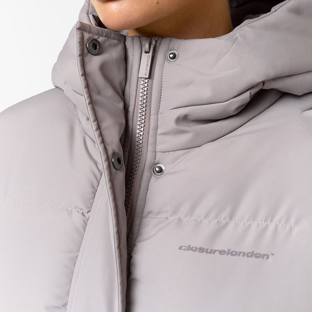 Discover the iconic Closure London Women's Longline Puffer Coat in unique mink shade. This coat is designed with an on-trend funnel neck hood and a sleek poly shell lining for ultimate comfort. It features a clean front placket with concealed press snap fastening and a double-ended chunky zip, offering versatile styling options and easy wear. The quilted body and sleeves provide warmth without bulk, while the discreet welt zip concealed pockets keep your essentials secure. Finished with a subtle yet distinctive Closure London logo tonal gel print on the chest, this longline puffer is your go-to for effortless cold-weather style.
