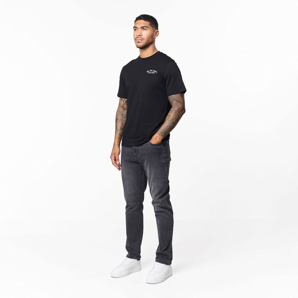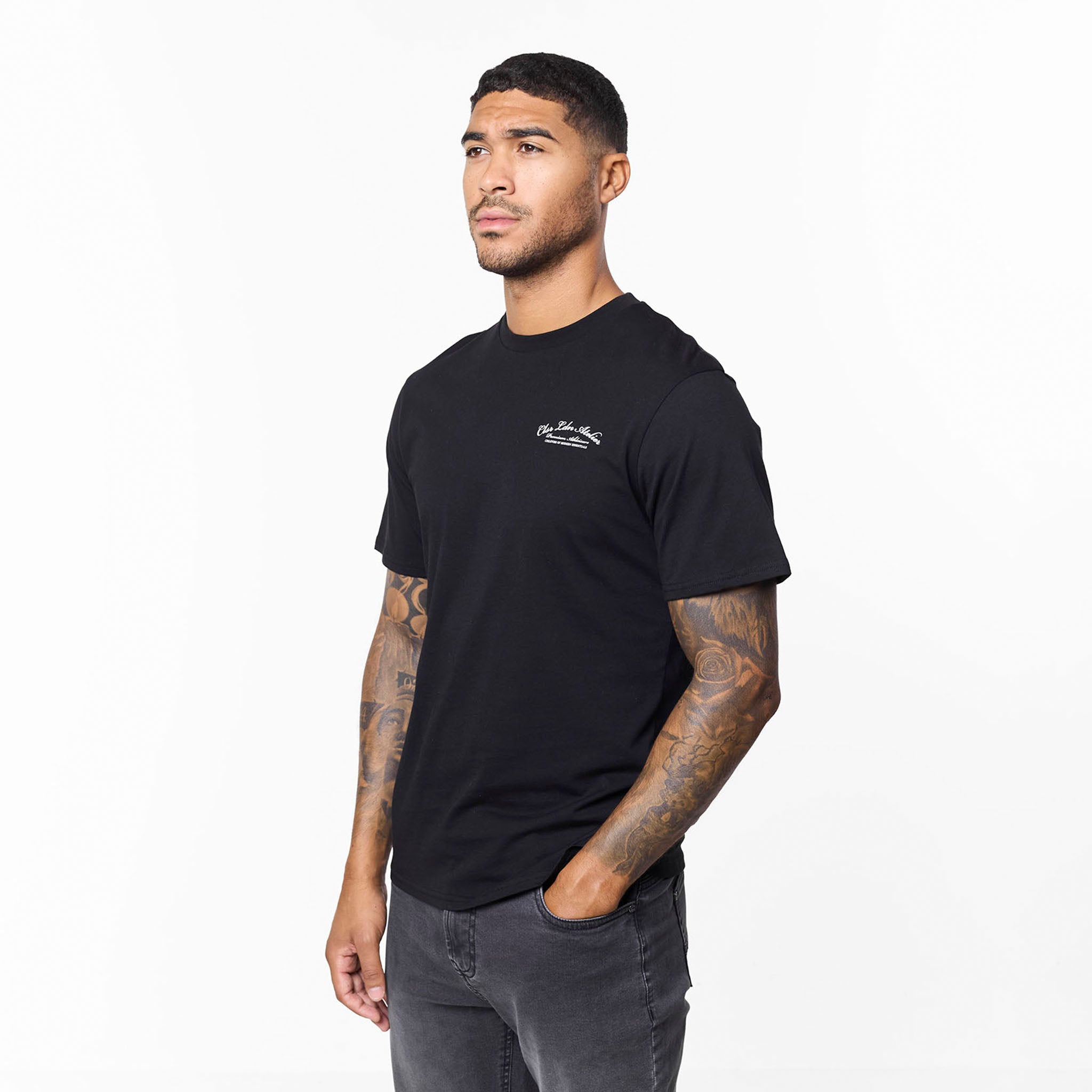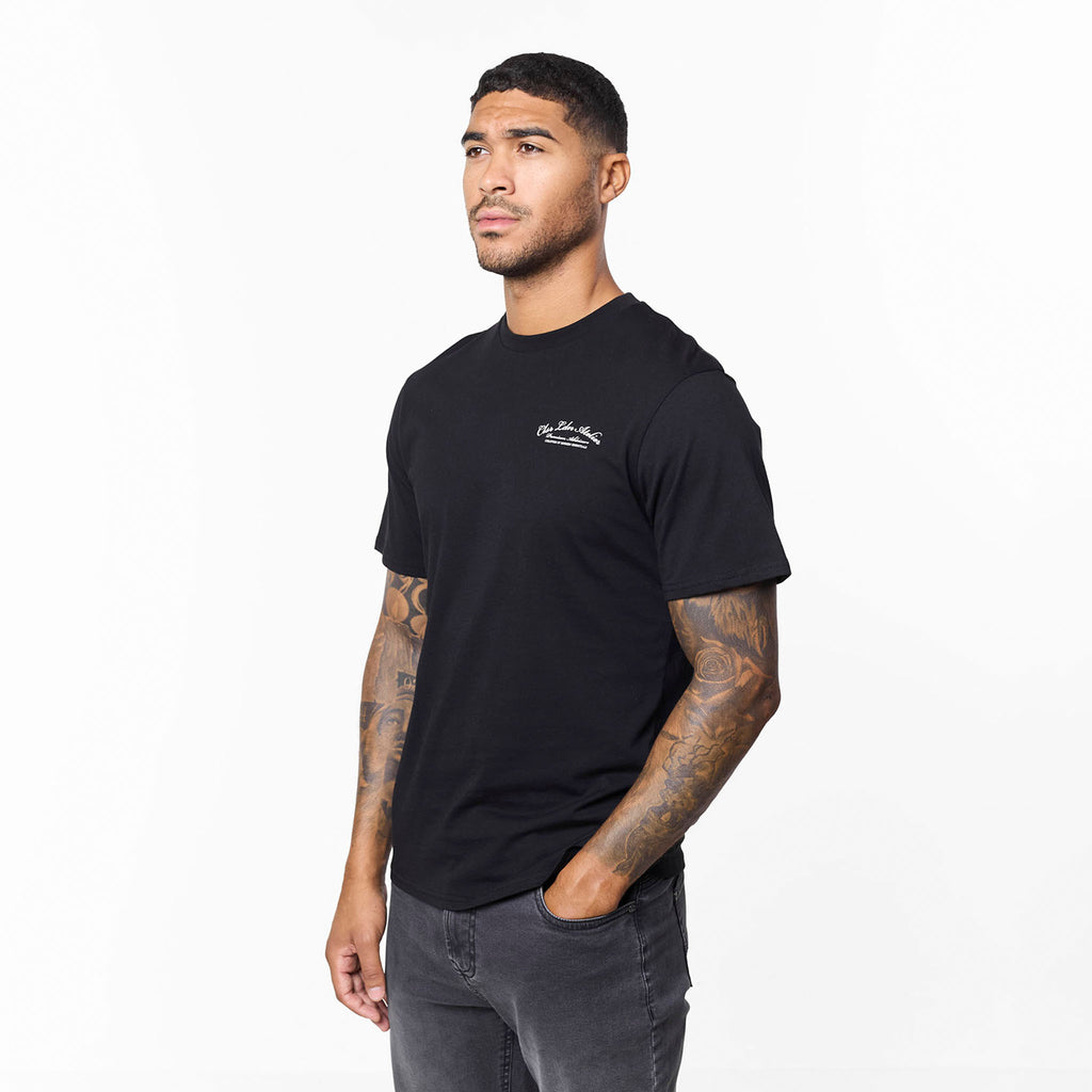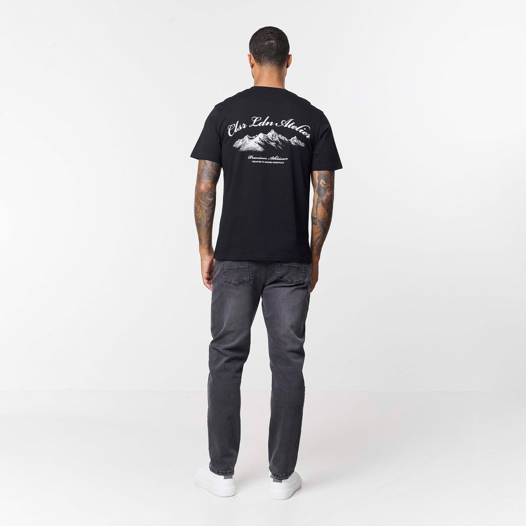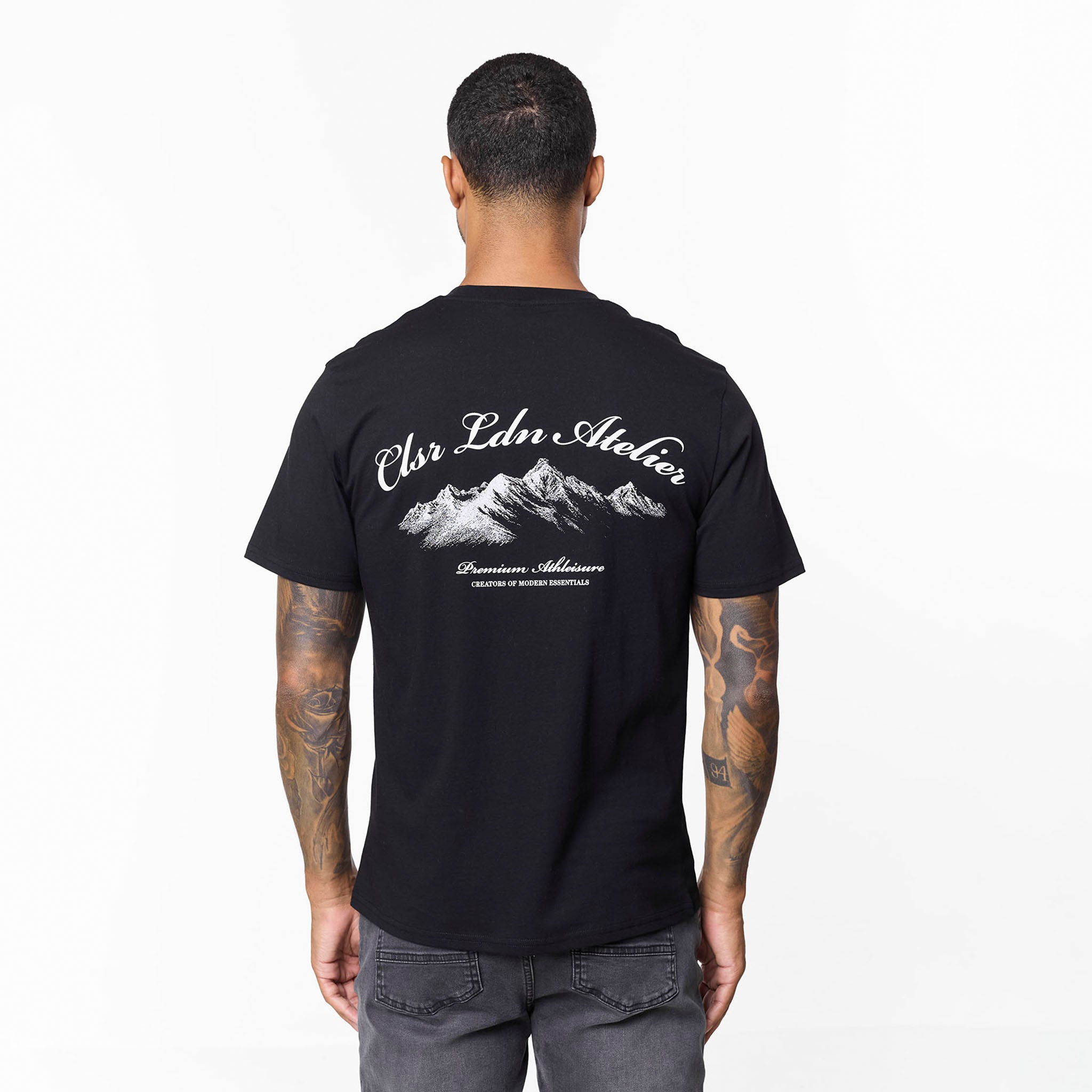 Make a statement with our new Men's Mountain Logo Graphic T-Shirt in classic black. Featuring a striking front print and our popular mountain logo graphic on the rear, this crew neck t-shirt boasts an elevated script font that adds a sophisticated, contemporary flair. This regular fit, short-sleeve tee is designed for superior comfort and standout style. Crafted from a cotton-rich fabric, it offers a soft feel and excellent breathability for all-day wear. Perfect for casual wear, weekend outings, or simply expressing your unique style with a bold graphic impact.