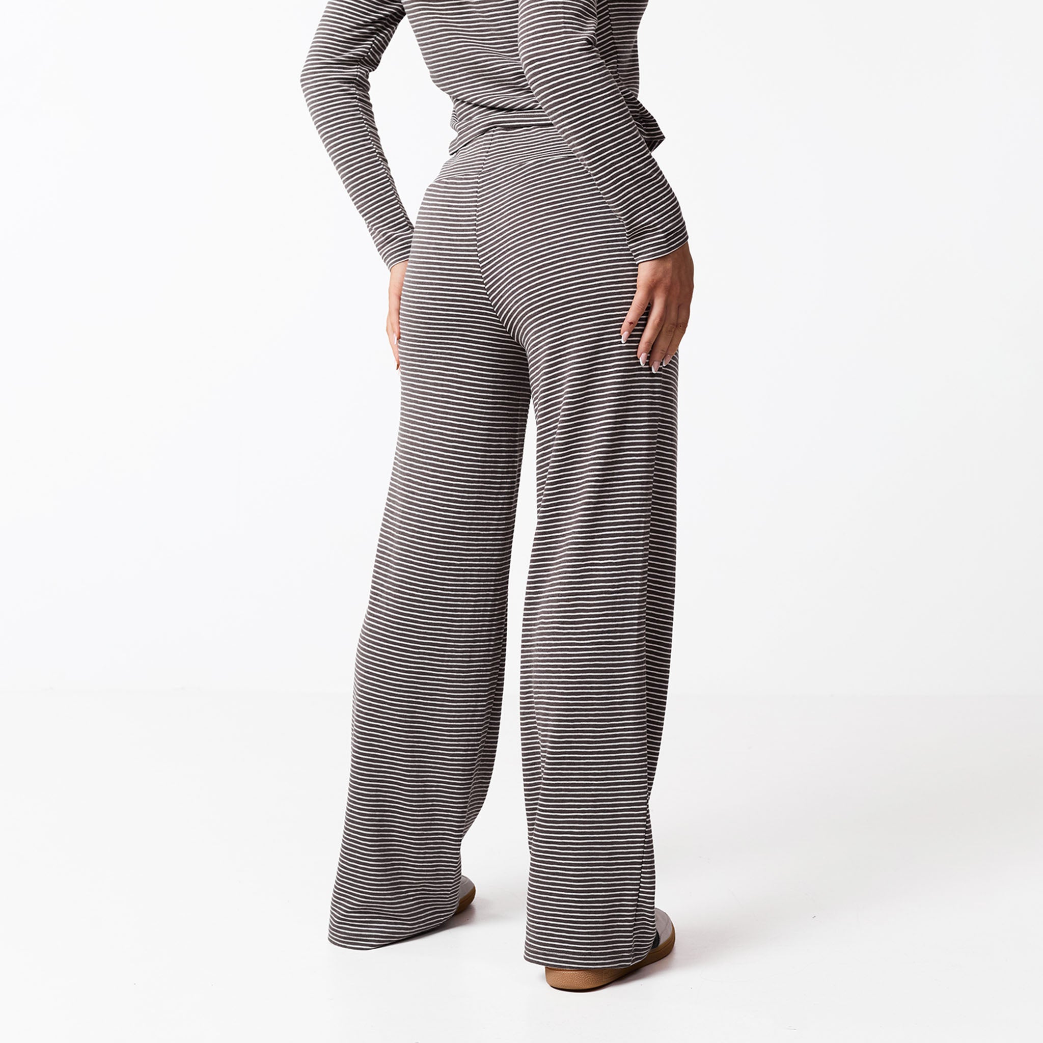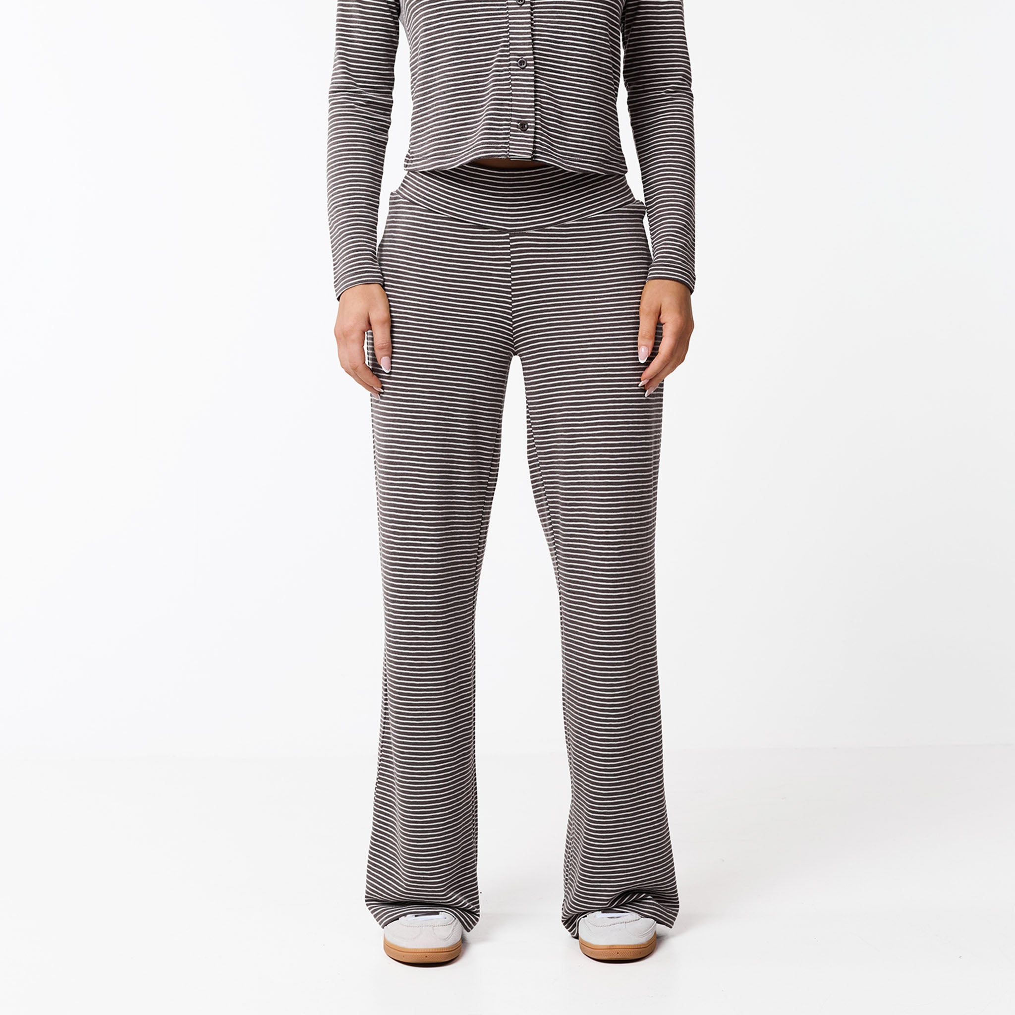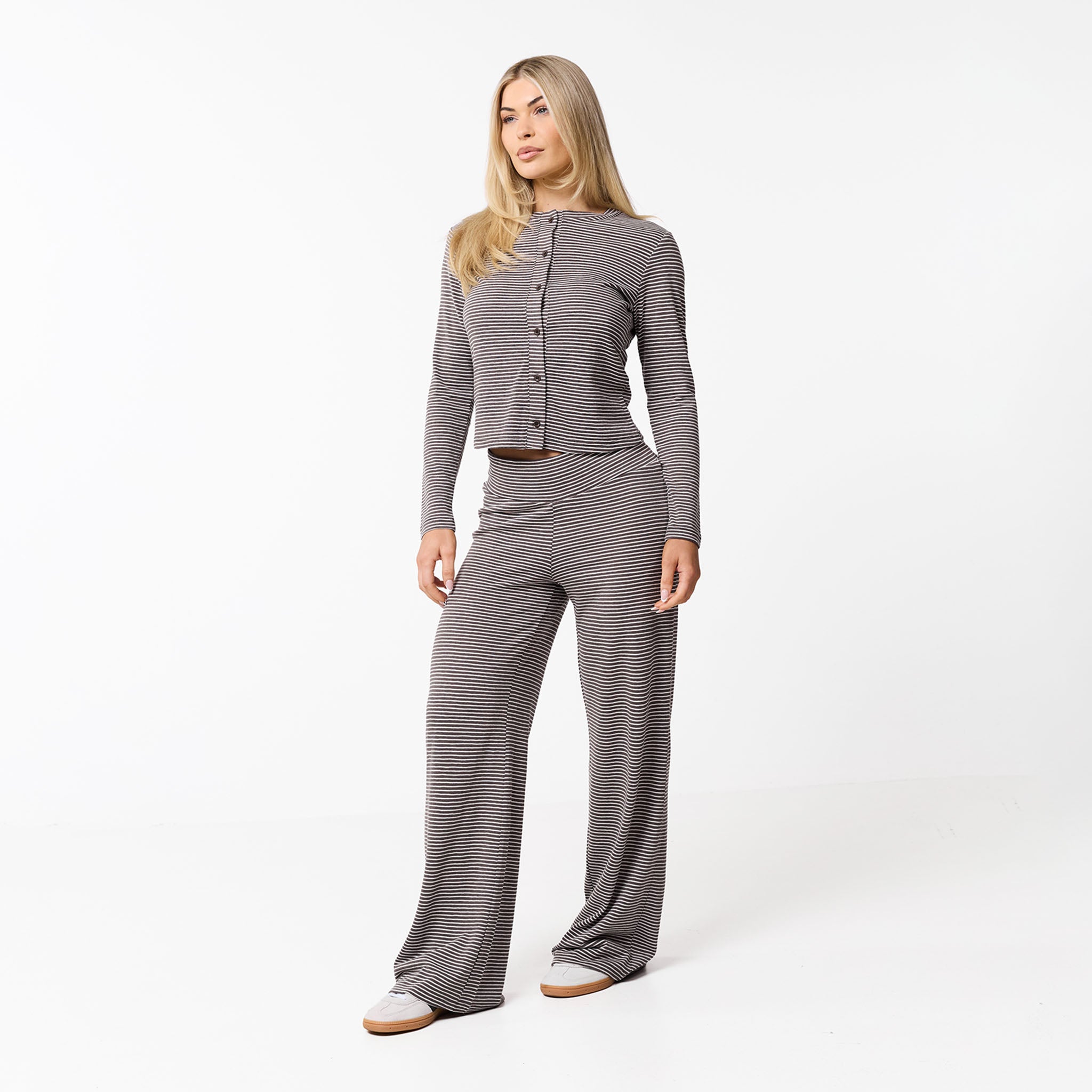 Introducing the new season Stripe Open Hem Pants in a white/brown print, a versatile addition to any wardrobe. Designed with a comfortable waistband and a stylish open hem, these pants offer a flattering silhouette. The subtle ribbed fabric provides a sophisticated texture, making them suitable for elevated loungewear or running errands in style. A durable twin-needle hem stitch ensures they'll be a lasting favourite. Team with the matching button up top to complete the look.