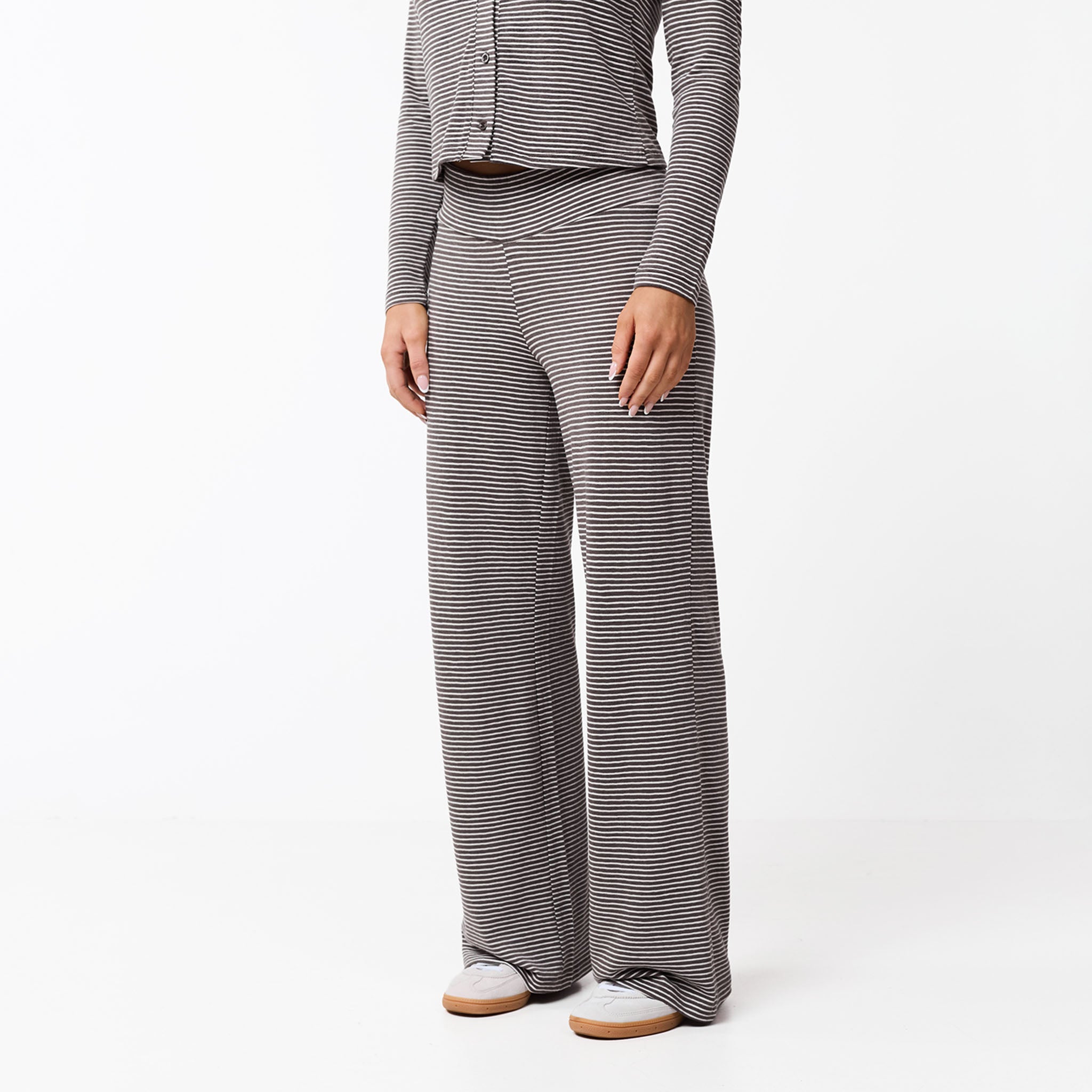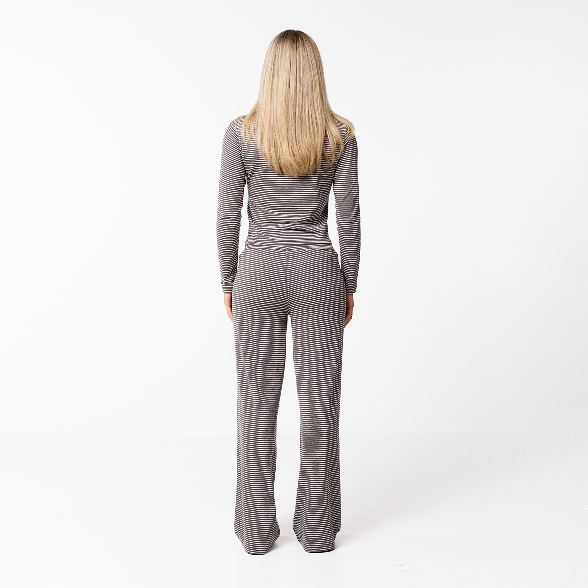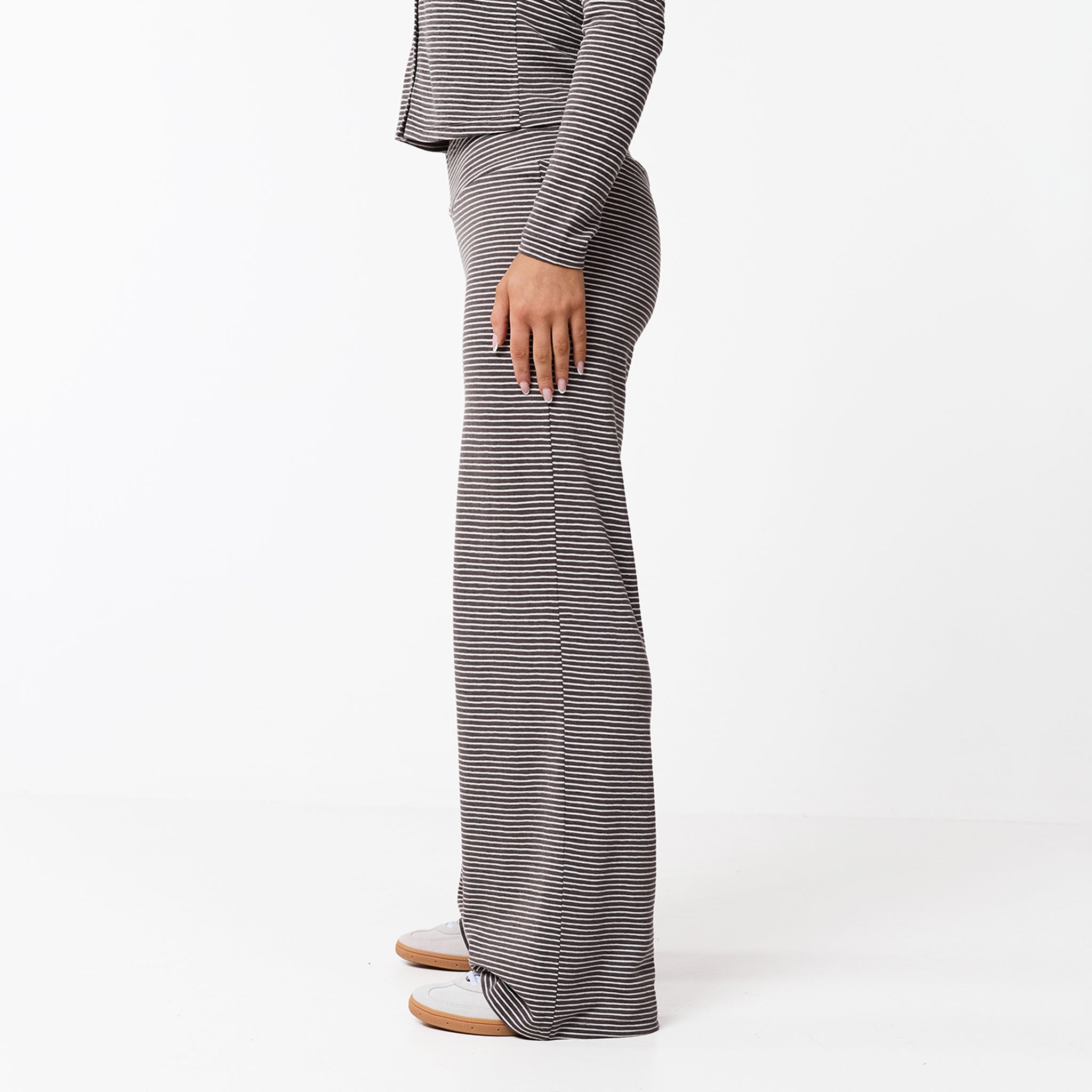 Introducing the new season Stripe Open Hem Pants in a white/brown print, a versatile addition to any wardrobe. Designed with a comfortable waistband and a stylish open hem, these pants offer a flattering silhouette. The subtle ribbed fabric provides a sophisticated texture, making them suitable for elevated loungewear or running errands in style. A durable twin-needle hem stitch ensures they'll be a lasting favourite. Team with the matching button up top to complete the look.