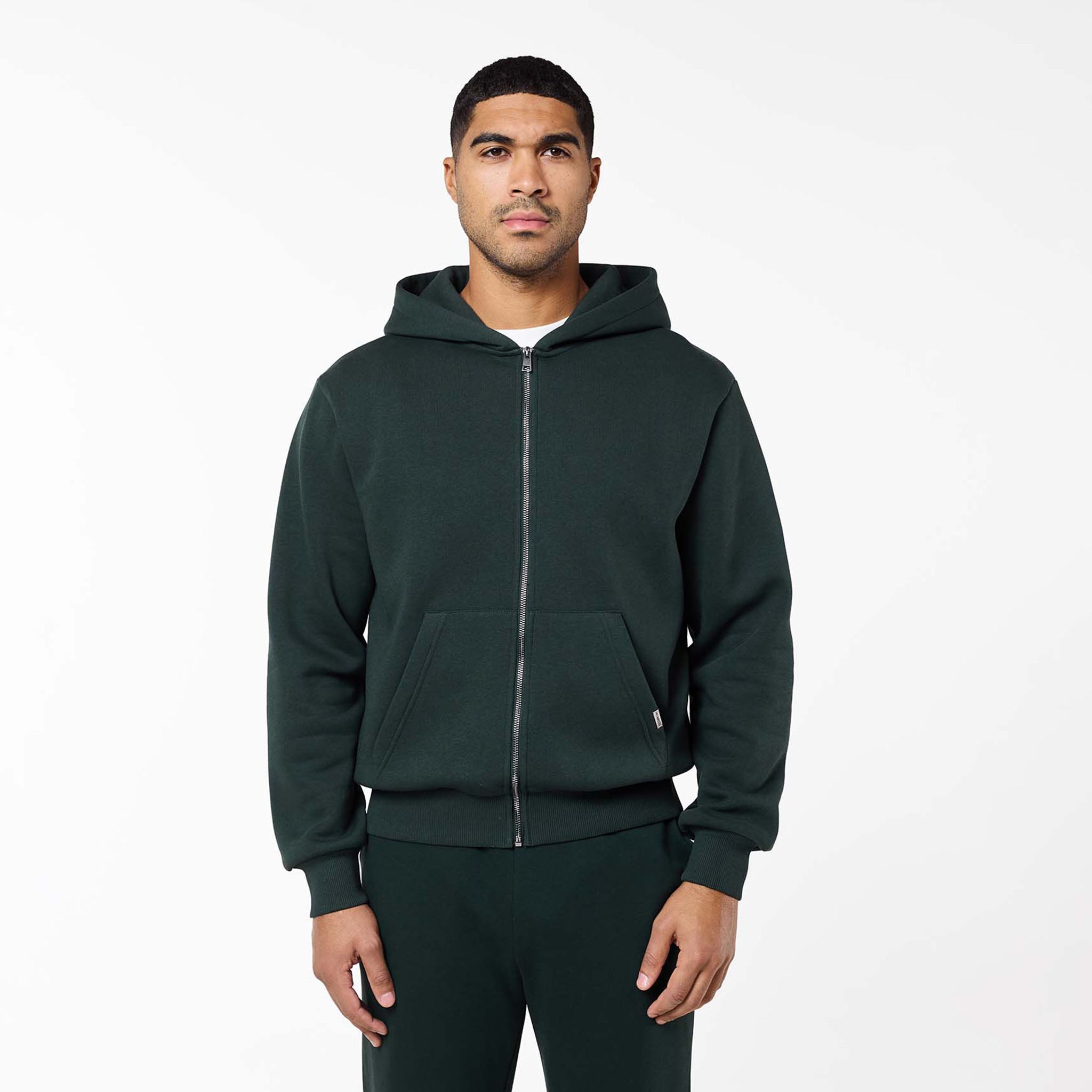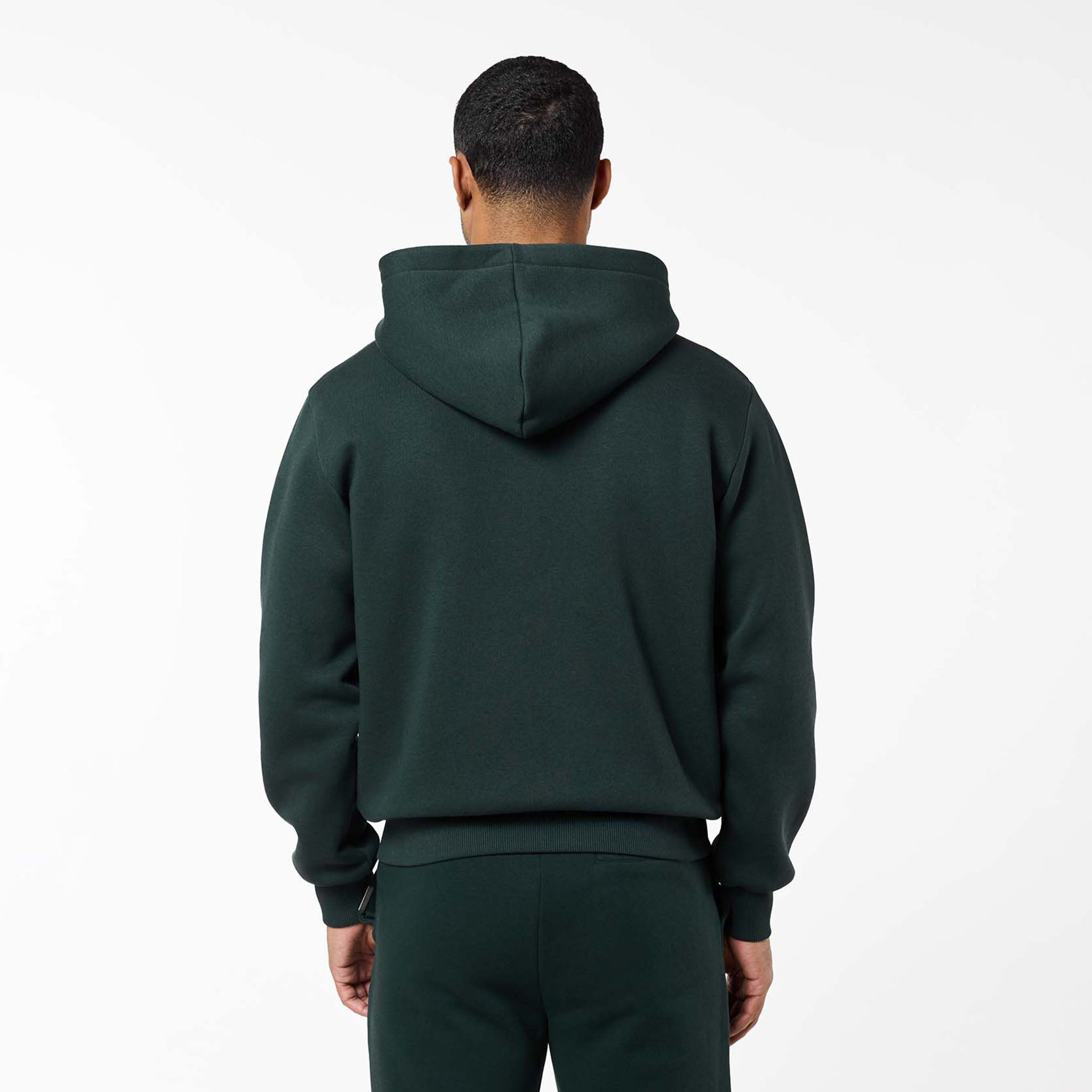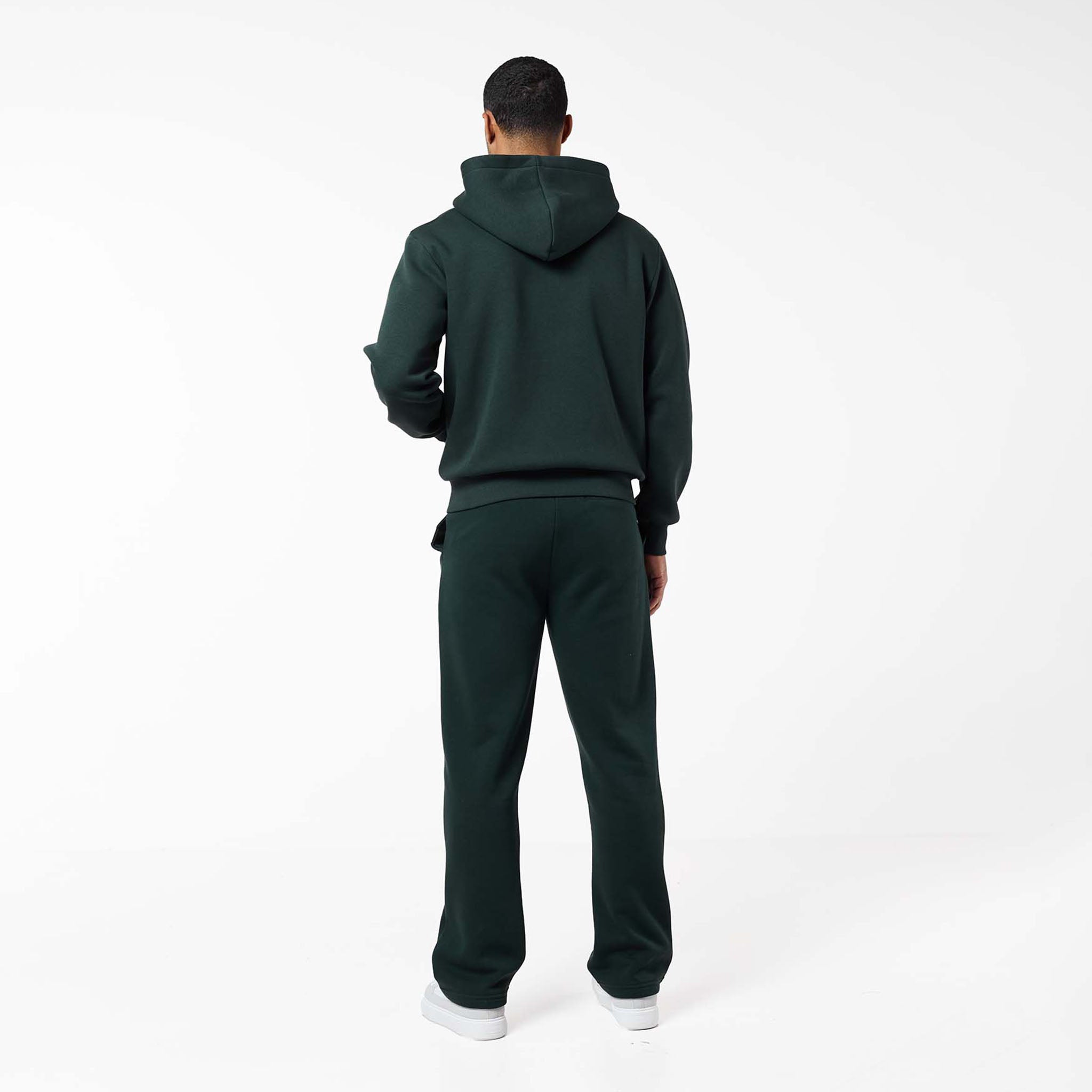Meet the new season staple: the Relaxed Fit Open Hem Tracksuit in a deep Forest Green shade. The set features a substantial 300GSM Fleece Lined Cotton that ensures an incredibly warm and plush feel. The Full Zip Hoodie elevates the classic design with practical details like a smooth zipper and premium metal hardware on the pockets. The coordinating Open Hem Joggers maintain a comfortable, relaxed drape, secured by a custom-fit elasticated waistband with internal drawstrings. Transition seamlessly through your week with this tracksuit, your key to a versatile and impeccably comfortable aesthetic.