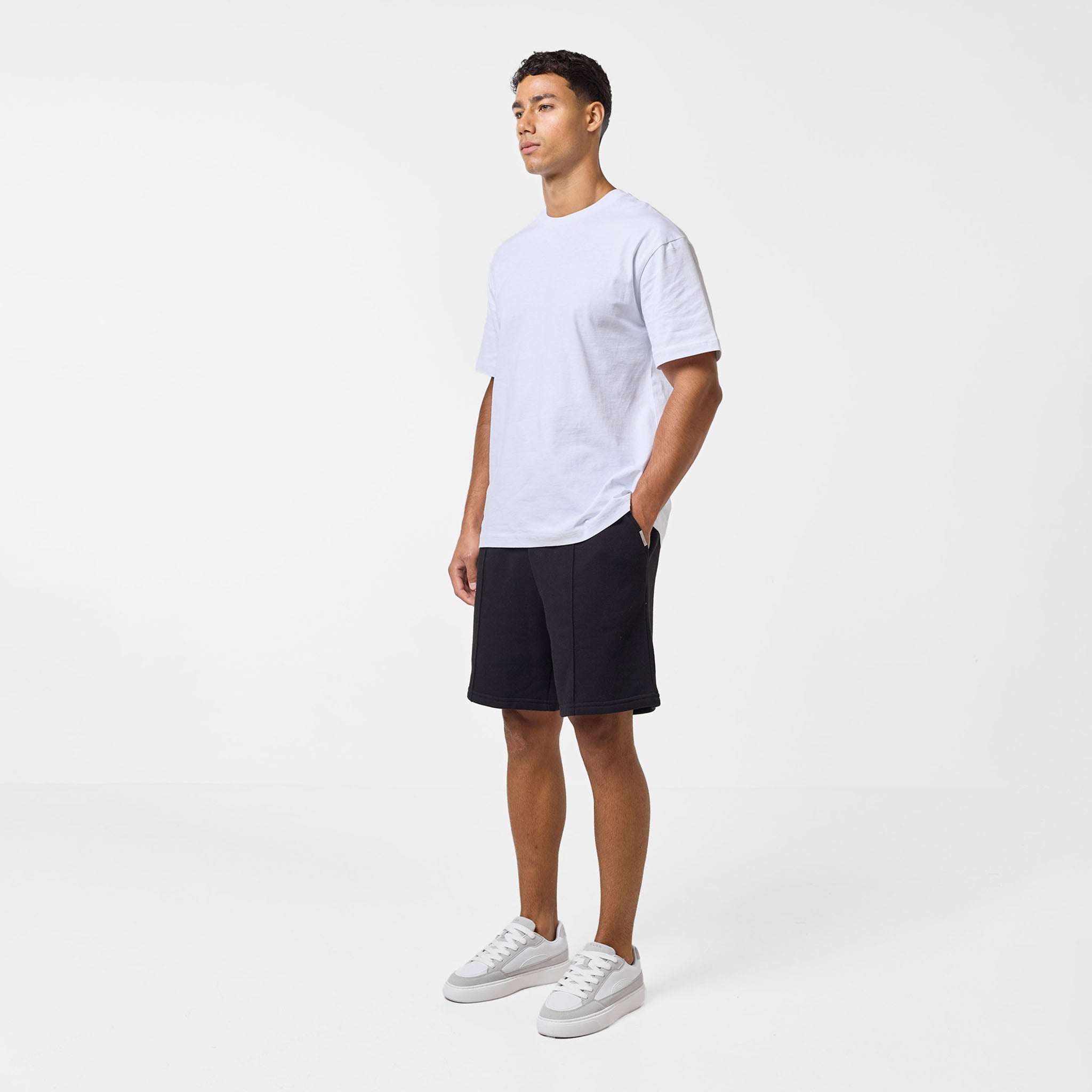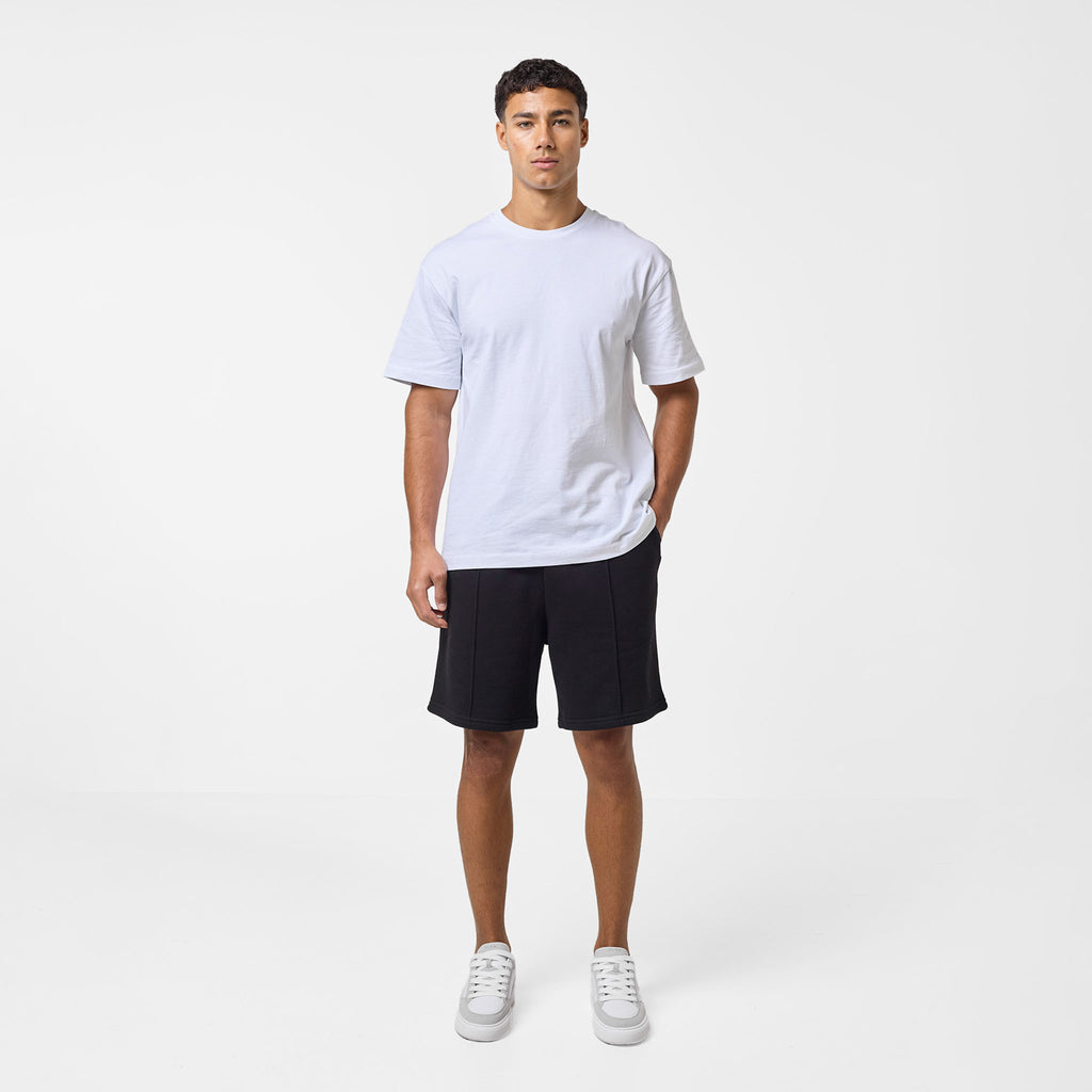 Experience ultimate comfort and refined style with our Men's Pleated Core Shorts in black, crafted from luxurious 300GSM brushed fleece; these shorts feature a secure ribbed waistband with adjustable drawcords finished with self turn ends, convenient slant pockets accented by a branded metal clasp, a subtle tailored pleat down the front leg, and a clean self turn hem, providing a perfect blend of casual elegance and everyday practicality.