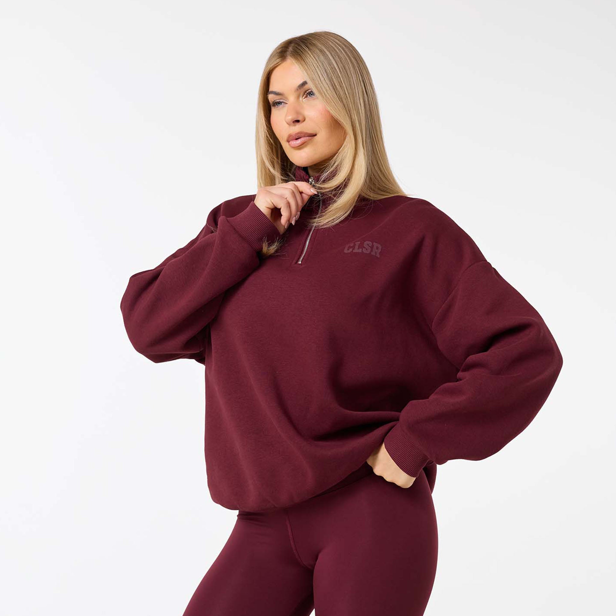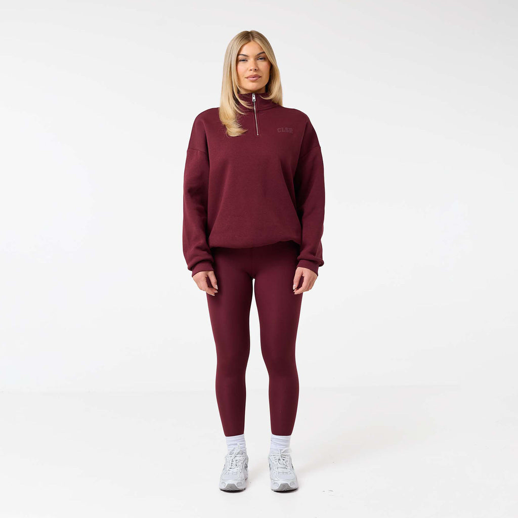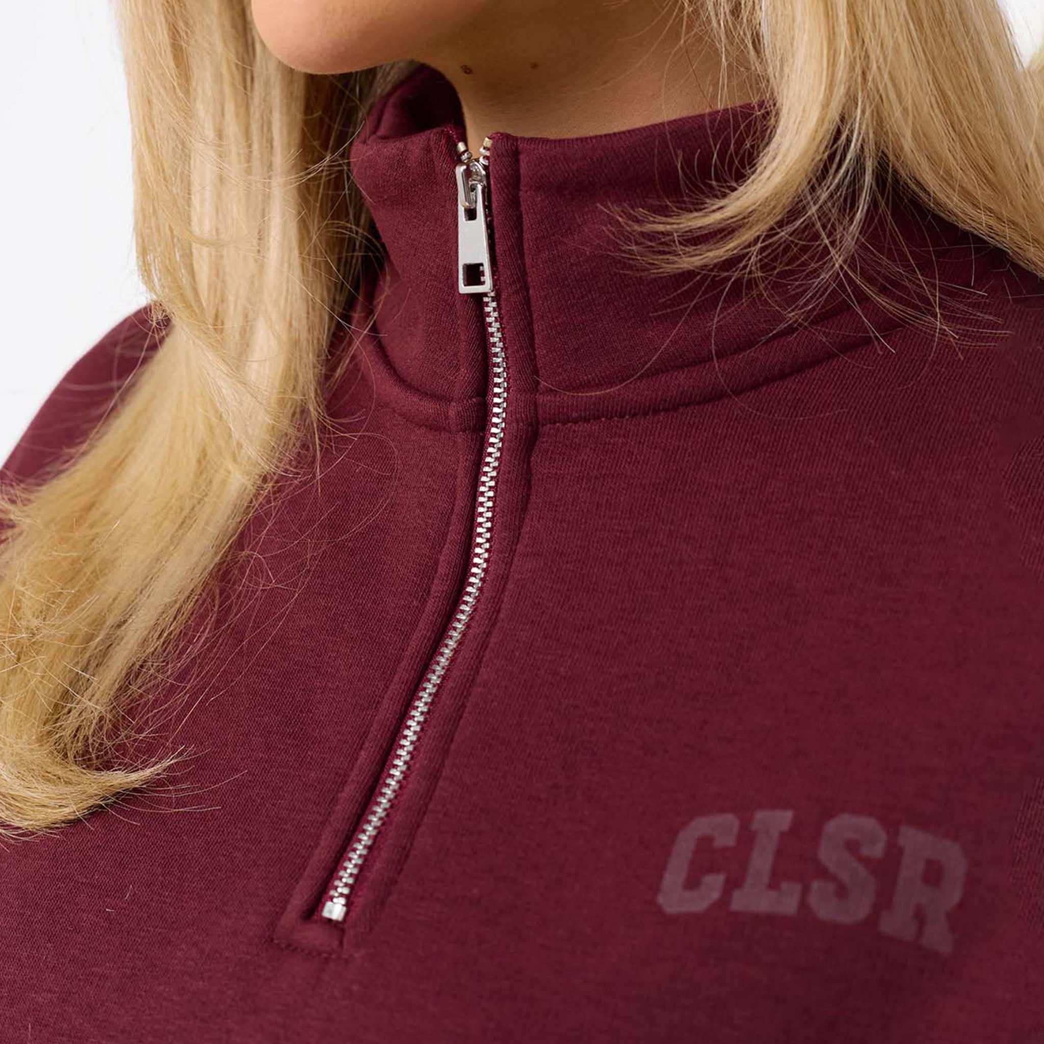 Introducing the new season Collegiate 1/4 Zip Jumper in burgundy, your new go-to for effortless style and comfort. Crafted from a premium 300G brushback fleece, this jumper is exceptionally soft and warm without the bulk. Its chic funnel neck and 1/4 zip offer a versatile look, while ribbed cuffs and a ribbed hem provide a clean, polished finish. The subtle CLSR logo on the chest adds a signature touch to this essential piece. Designed to pair perfectly with our open-hem joggers for a coordinated look, or with our Second Skin leggings for a sporty silhouette.