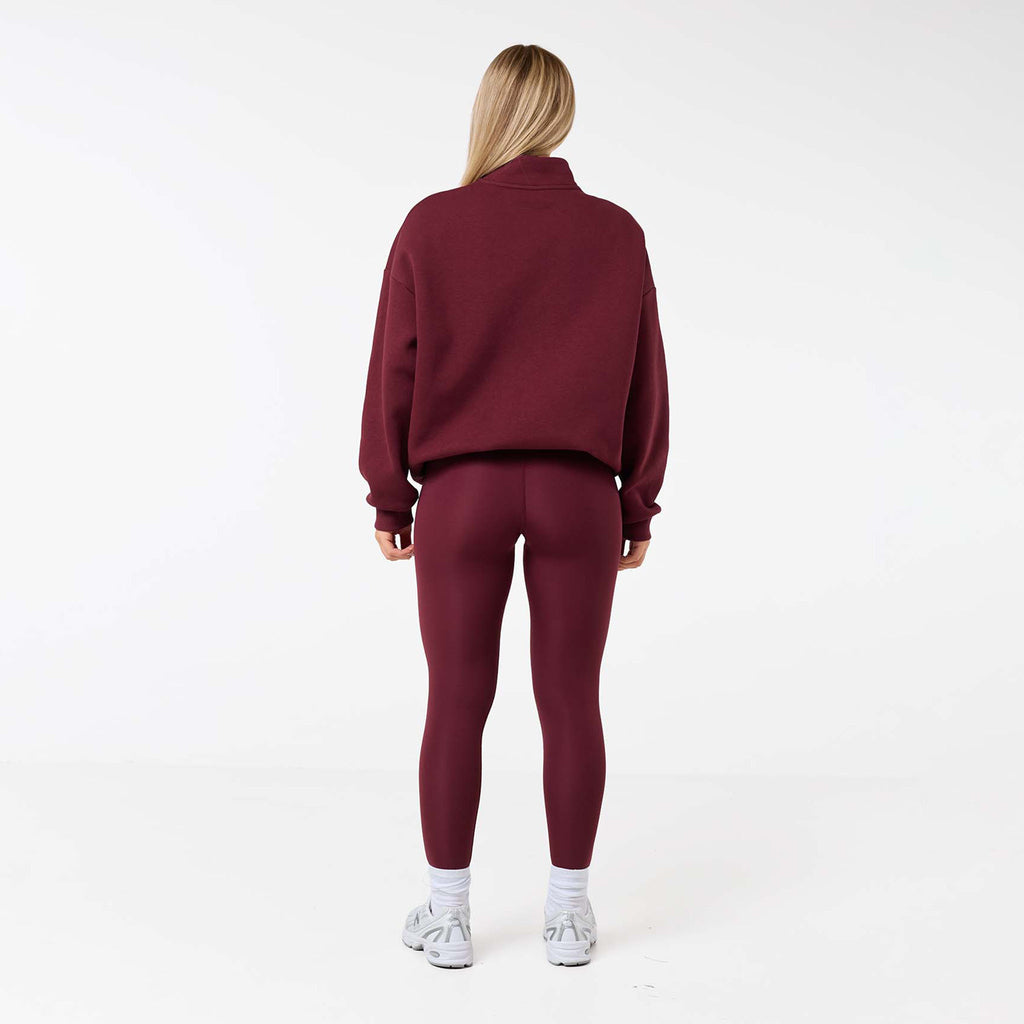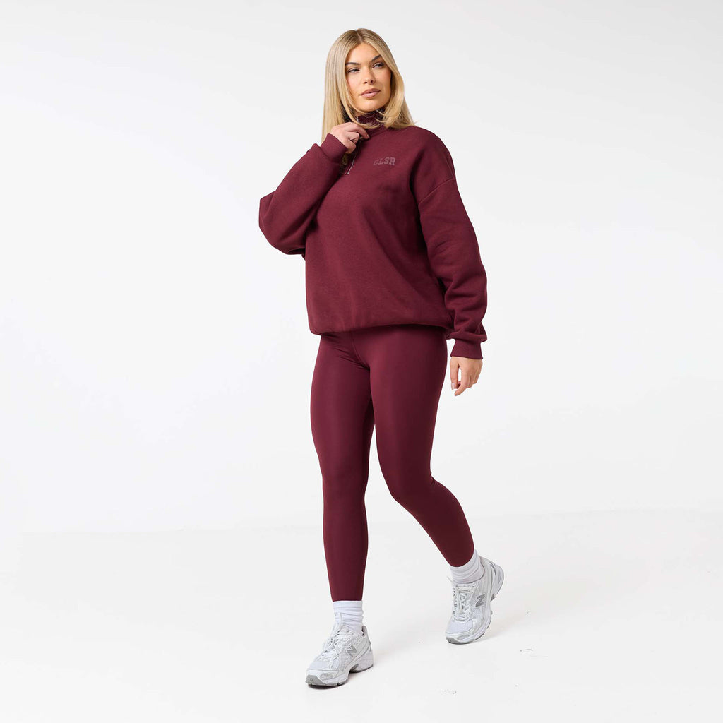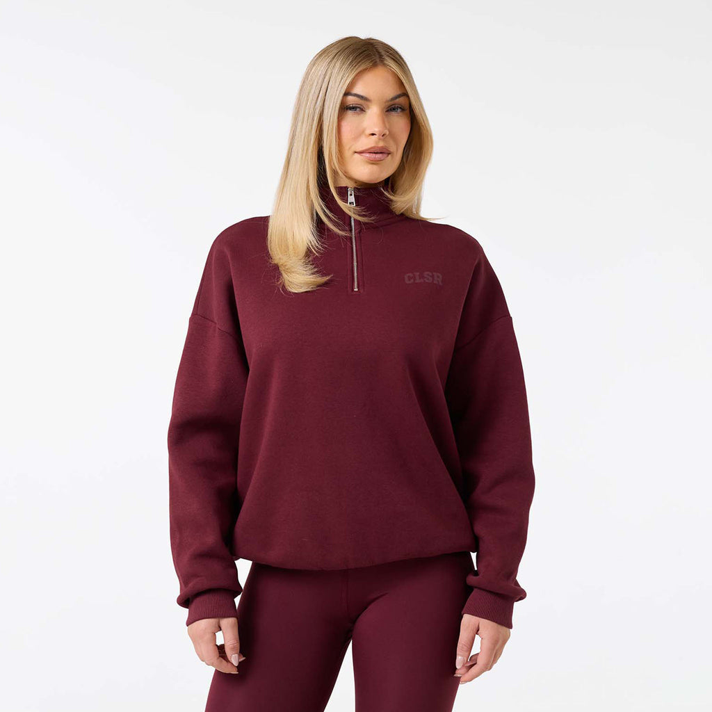 Introducing the new season Collegiate 1/4 Zip Jumper in burgundy, your new go-to for effortless style and comfort. Crafted from a premium 300G brushback fleece, this jumper is exceptionally soft and warm without the bulk. Its chic funnel neck and 1/4 zip offer a versatile look, while ribbed cuffs and a ribbed hem provide a clean, polished finish. The subtle CLSR logo on the chest adds a signature touch to this essential piece. Designed to pair perfectly with our open-hem joggers for a coordinated look, or with our Second Skin leggings for a sporty silhouette.