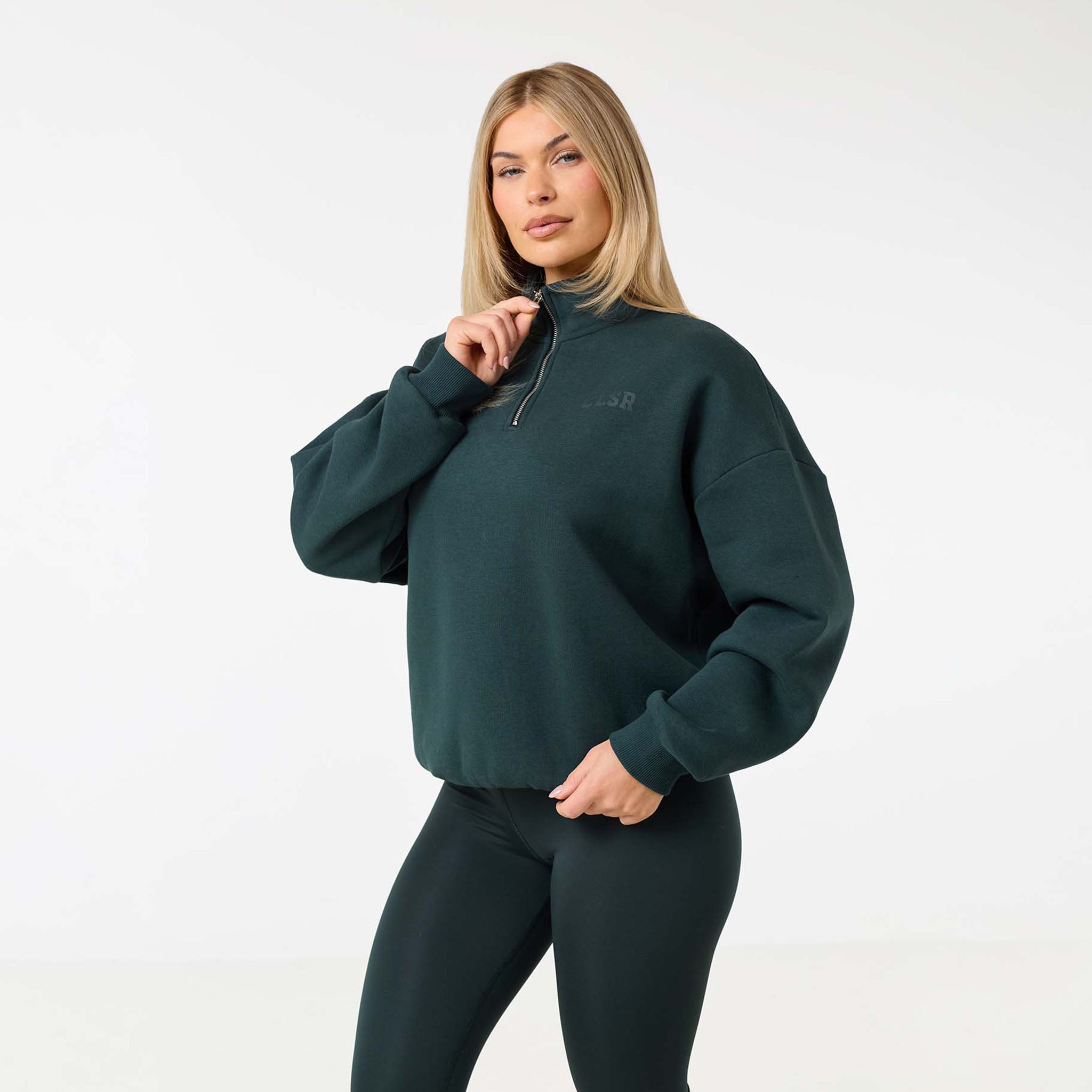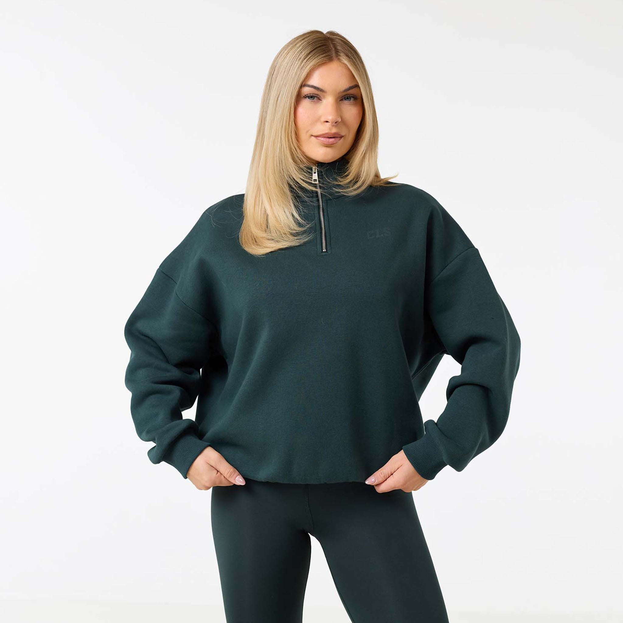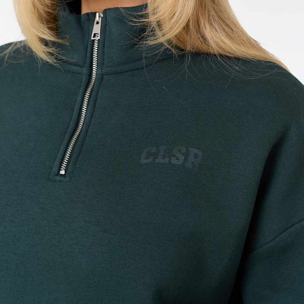 Discover new season style with the Collegiate 1/4 Zip Jumper in a rich pine green. Your new go-to for effortless style and all-day comfort. Made from a premium 300G brushback fleece, it’s designed to be exceptionally soft and warm without feeling bulky. The chic funnel neck and quarter-zip fastening offer a versatile look, while the ribbed cuffs and hem provide a clean, polished finish. A subtle CLSR logo on the chest adds a signature touch. Perfect for a coordinated look with our open-hem joggers or with our second skin leggings for a sleek, sporty style.