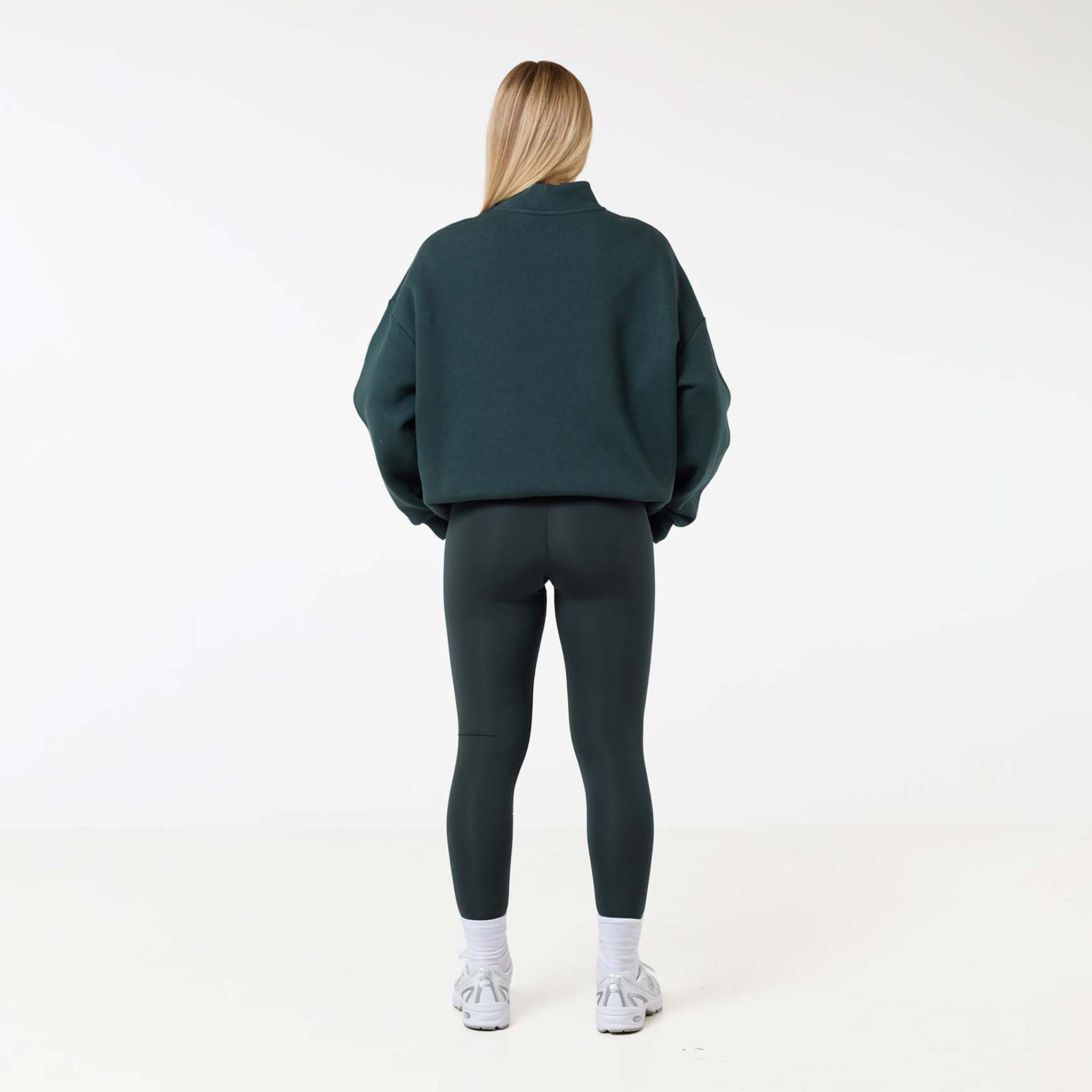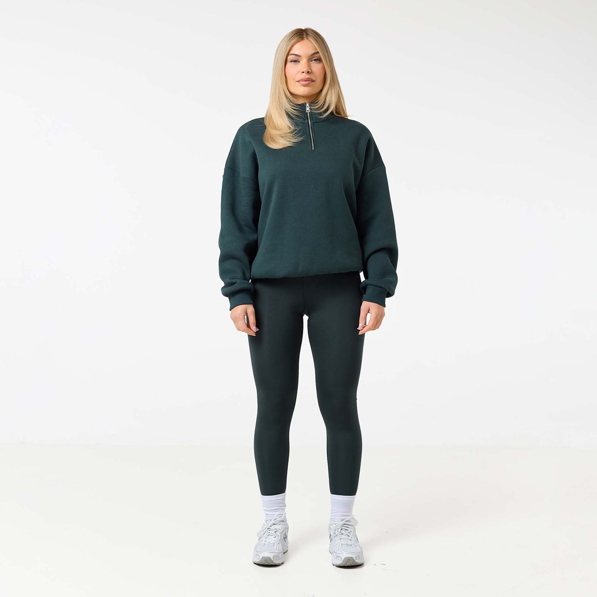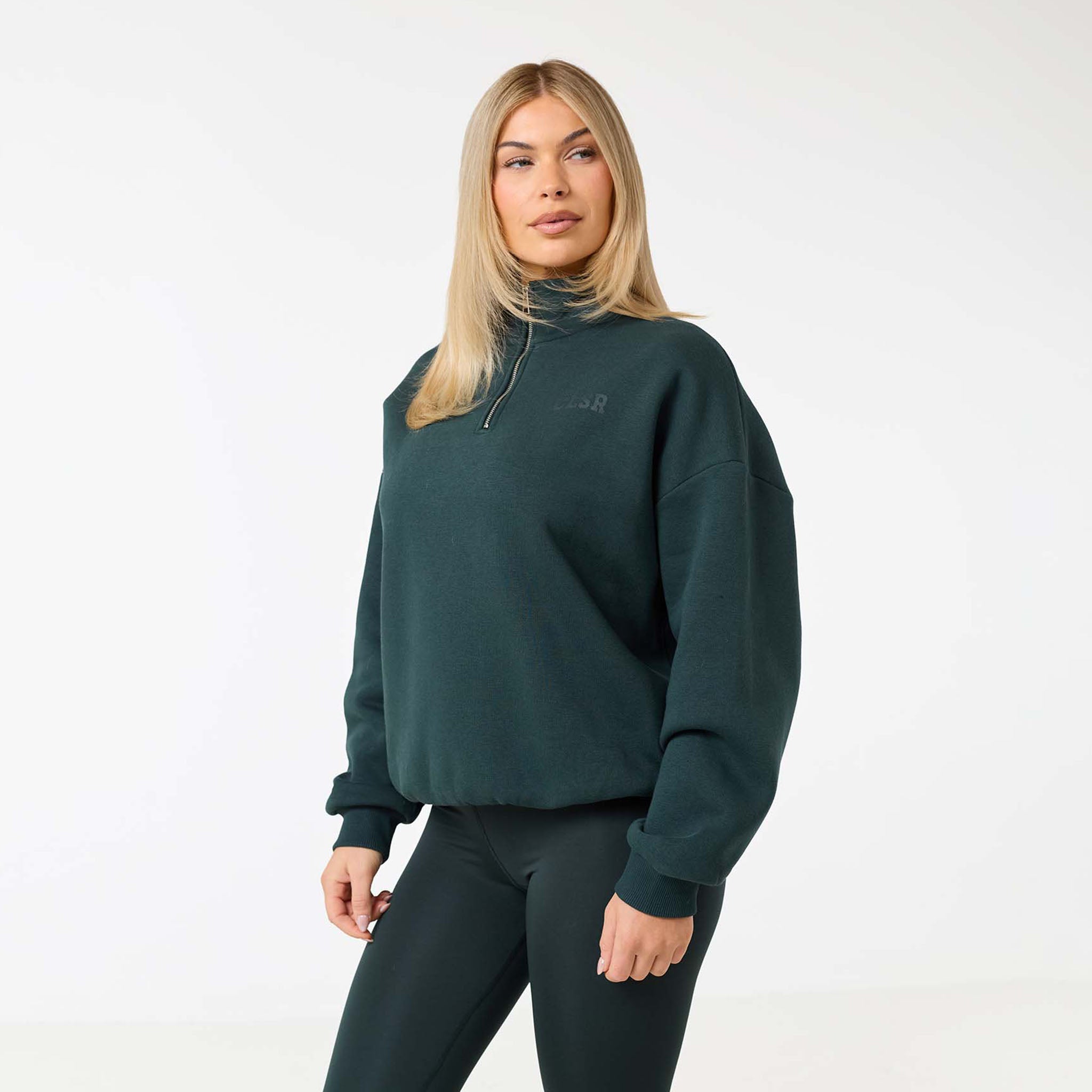 Discover new season style with the Collegiate 1/4 Zip Jumper in a rich pine green. Your new go-to for effortless style and all-day comfort. Made from a premium 300G brushback fleece, it’s designed to be exceptionally soft and warm without feeling bulky. The chic funnel neck and quarter-zip fastening offer a versatile look, while the ribbed cuffs and hem provide a clean, polished finish. A subtle CLSR logo on the chest adds a signature touch. Perfect for a coordinated look with our open-hem joggers or with our second skin leggings for a sleek, sporty style.
