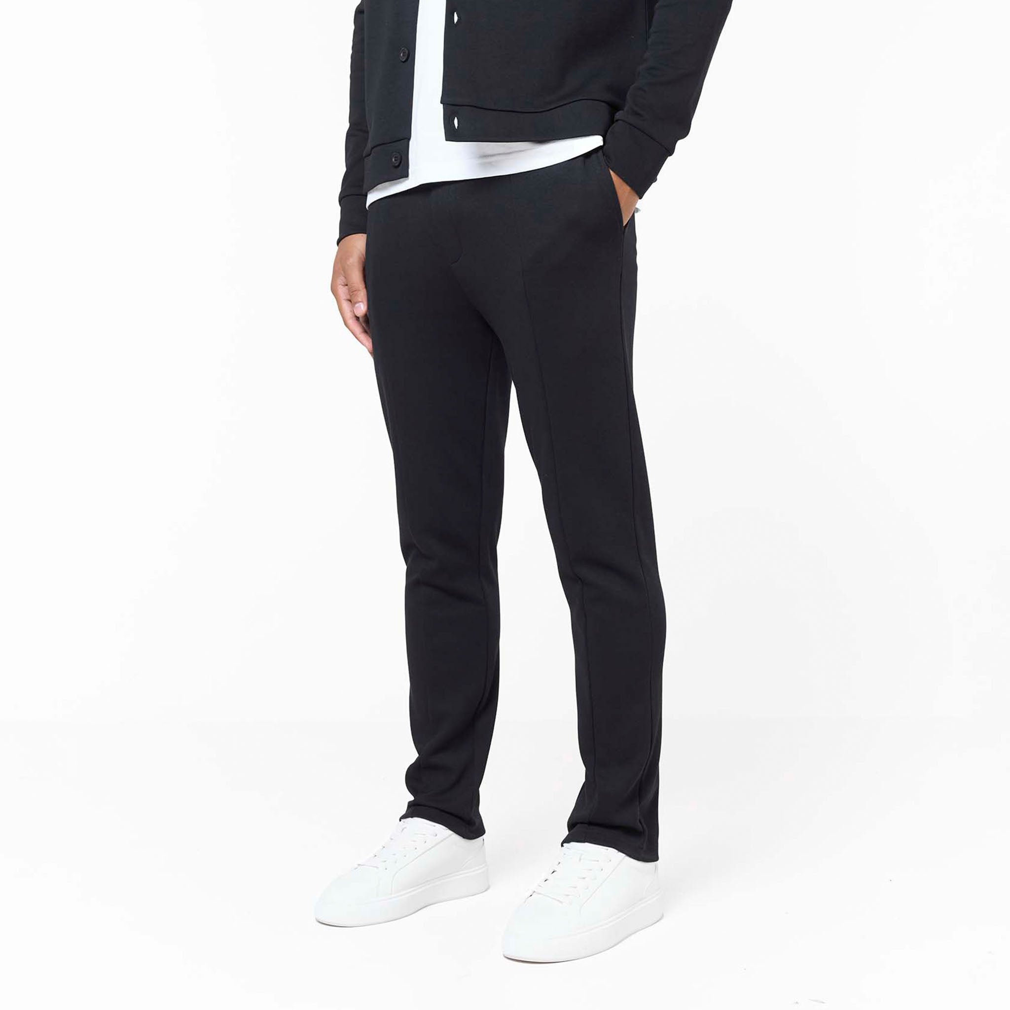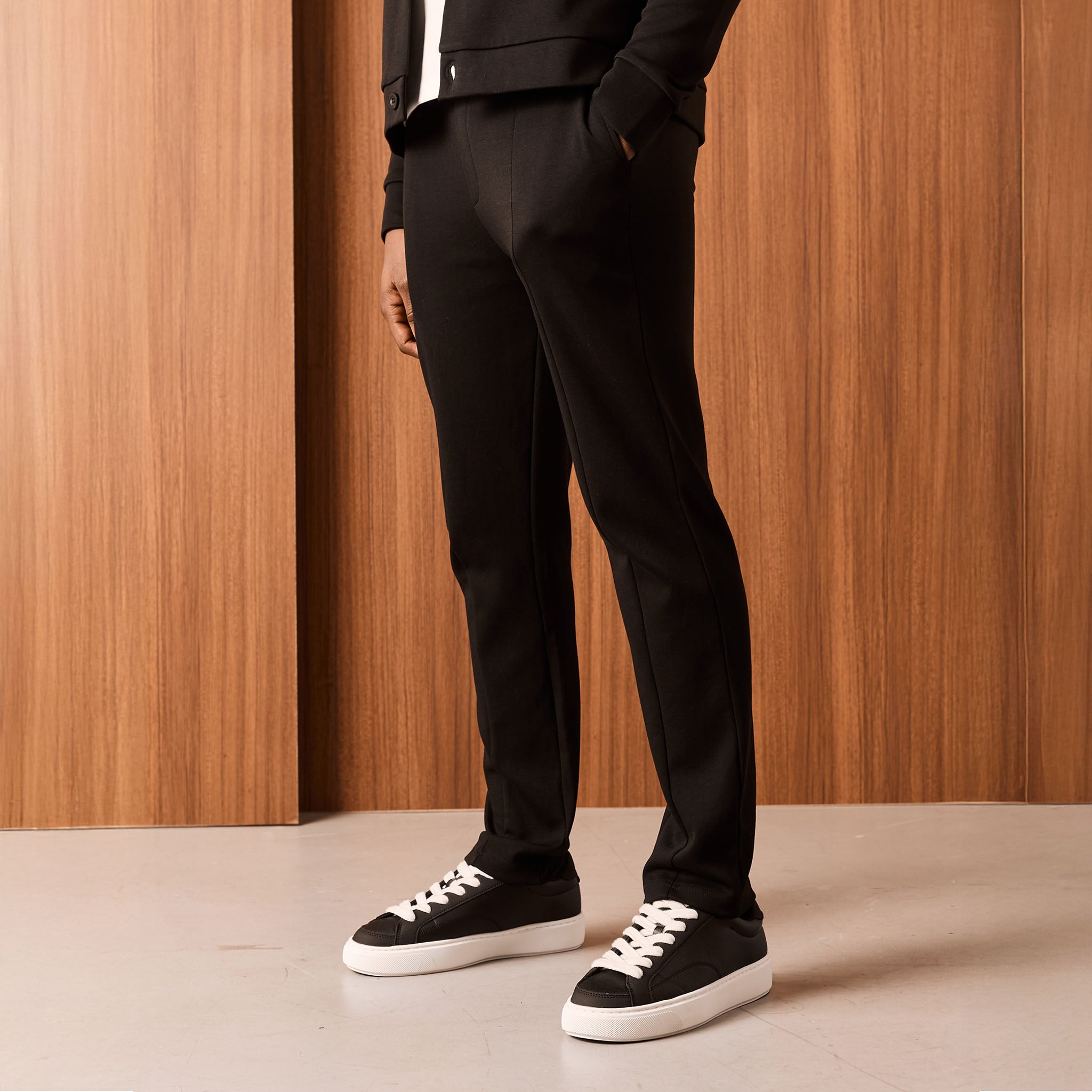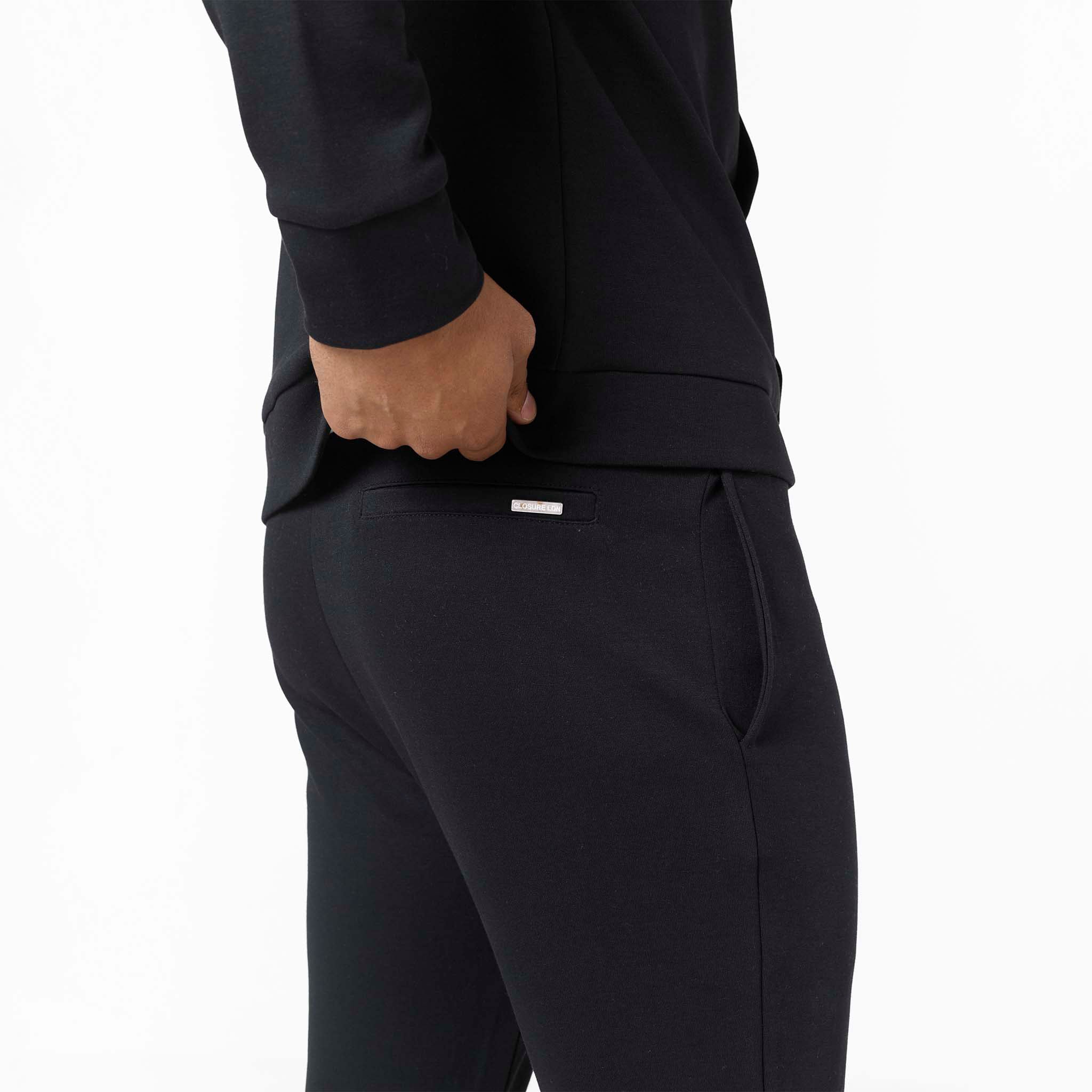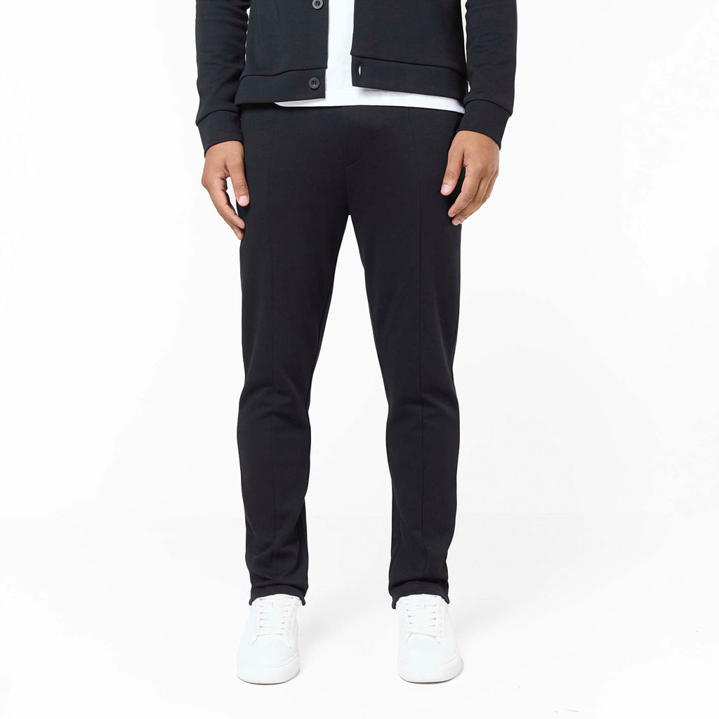 Experience elevated comfort with our new Interlock Smart Slim Fit Joggers, presented in classic black. These joggers are meticulously engineered for a sleek, modern look, featuring a slim fit that tapers effortlessly to a clean open hem. Designed for your casual attire, they boast flat internal drawcords and a secure ribbed waistband for a customisable feel. Subtle details like the faux zip fly stitch and the distinctive centre-leg seam add a touch of refinement. With practical slant pockets and stylish rear faux welt pockets adorned with a sleek metal badge, finished with neat self-turn cuffs, these joggers are your ultimate choice for effortless style.