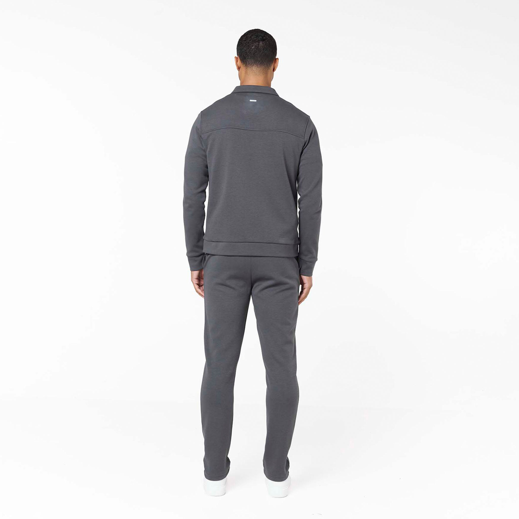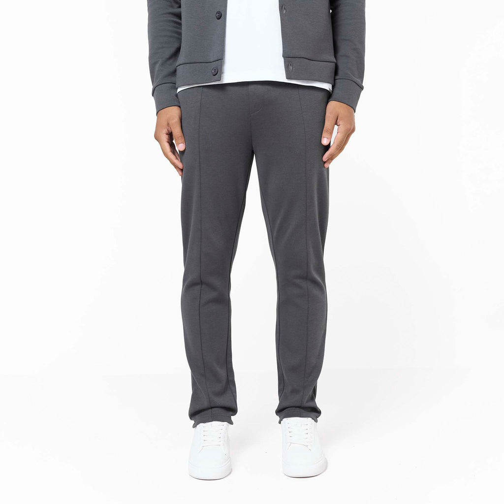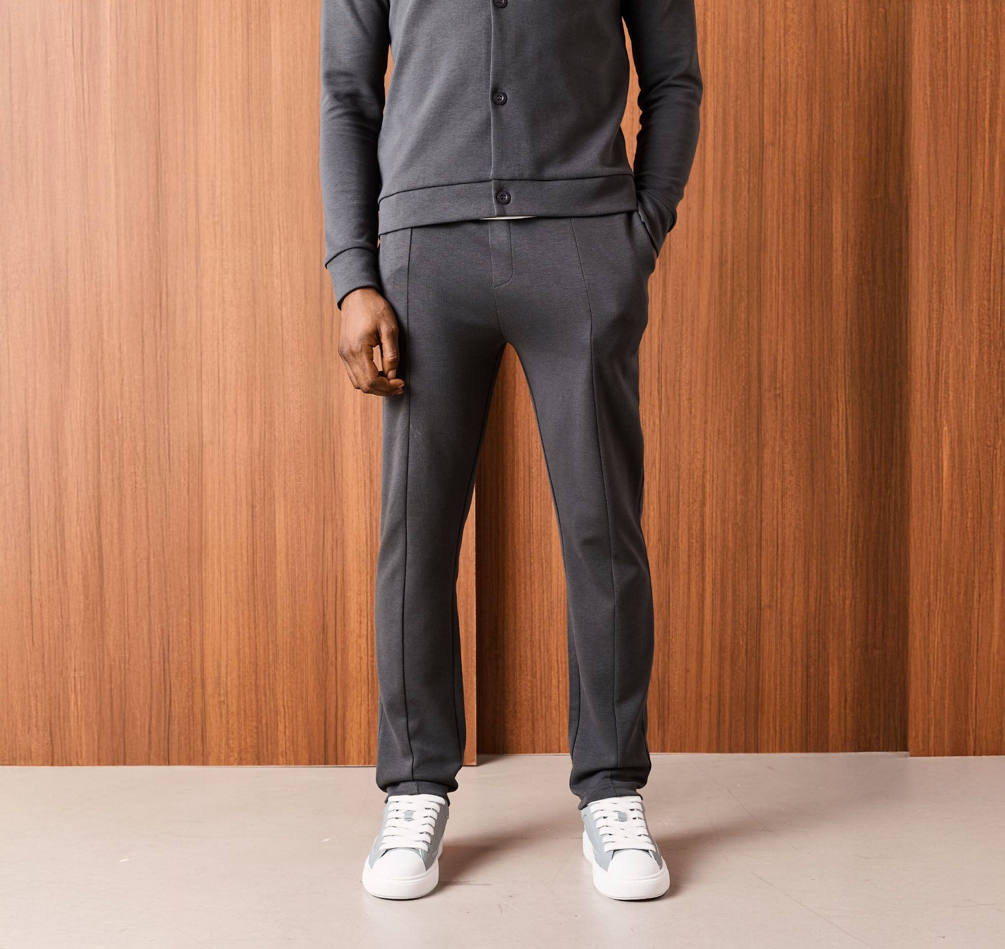Discover the new Interlock Smart Slim Fit Joggers in charcoal, engineered for a modern fit and ultimate comfort. These joggers feature a slim fit that tapers perfectly, ending with a clean open hem. Designed for your everyday pursuits, they include flat internal drawcords and a snug ribbed waistband for a secure, customisable fit. The subtle faux zip fly stitch and distinctive seam down the centre of the leg adds a refined touch.  Practicality is key with convenient slant pockets and stylish rear faux welt pockets adorned with a sleek metal badge. Finished with neat self-turn cuffs, these joggers are your go-to for effortless style.