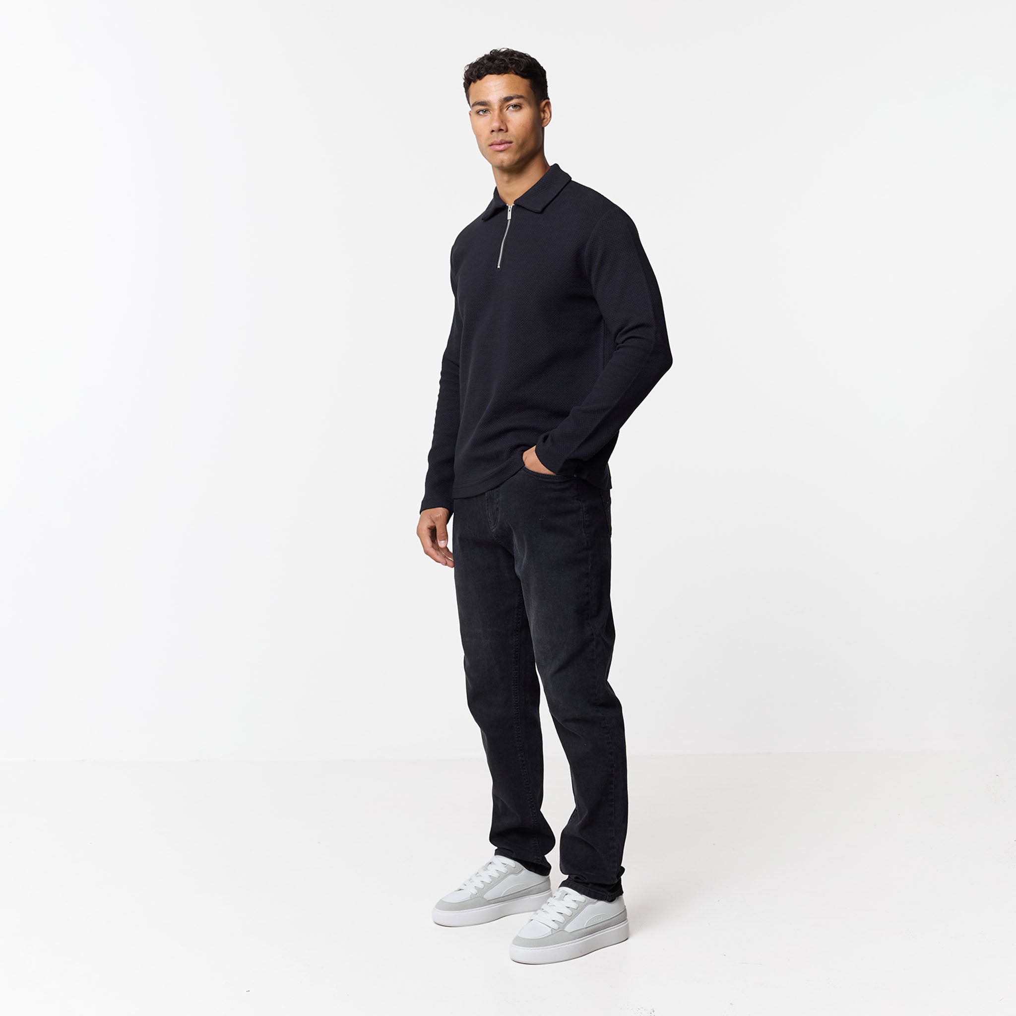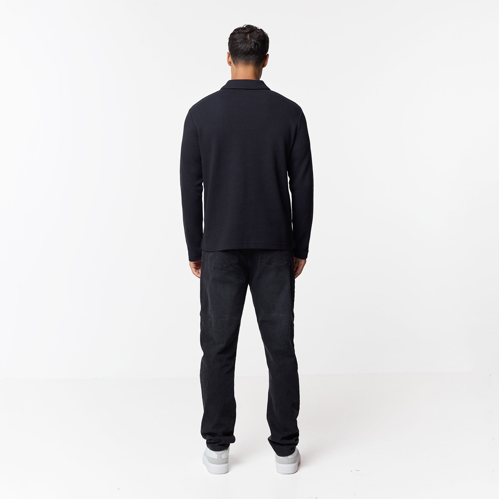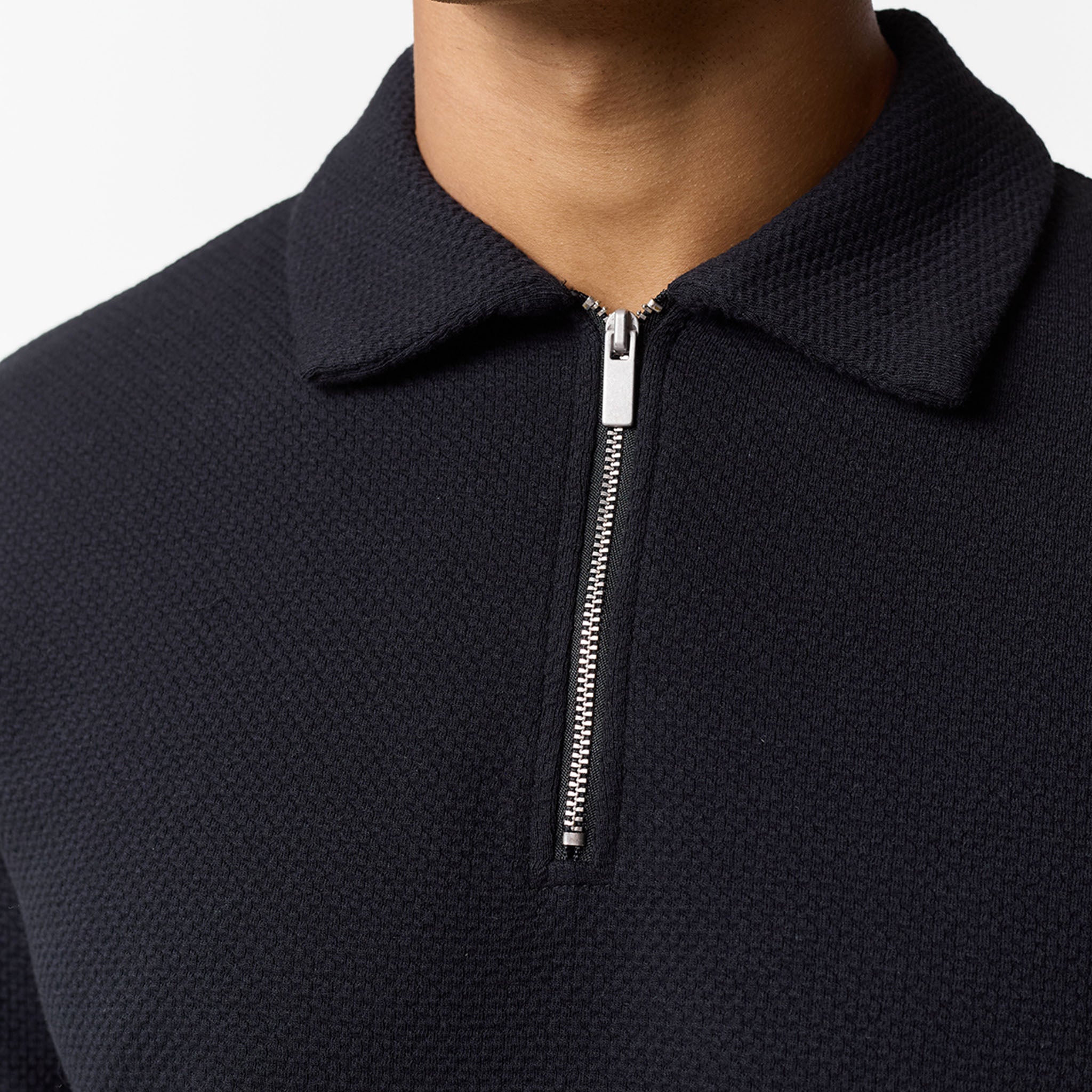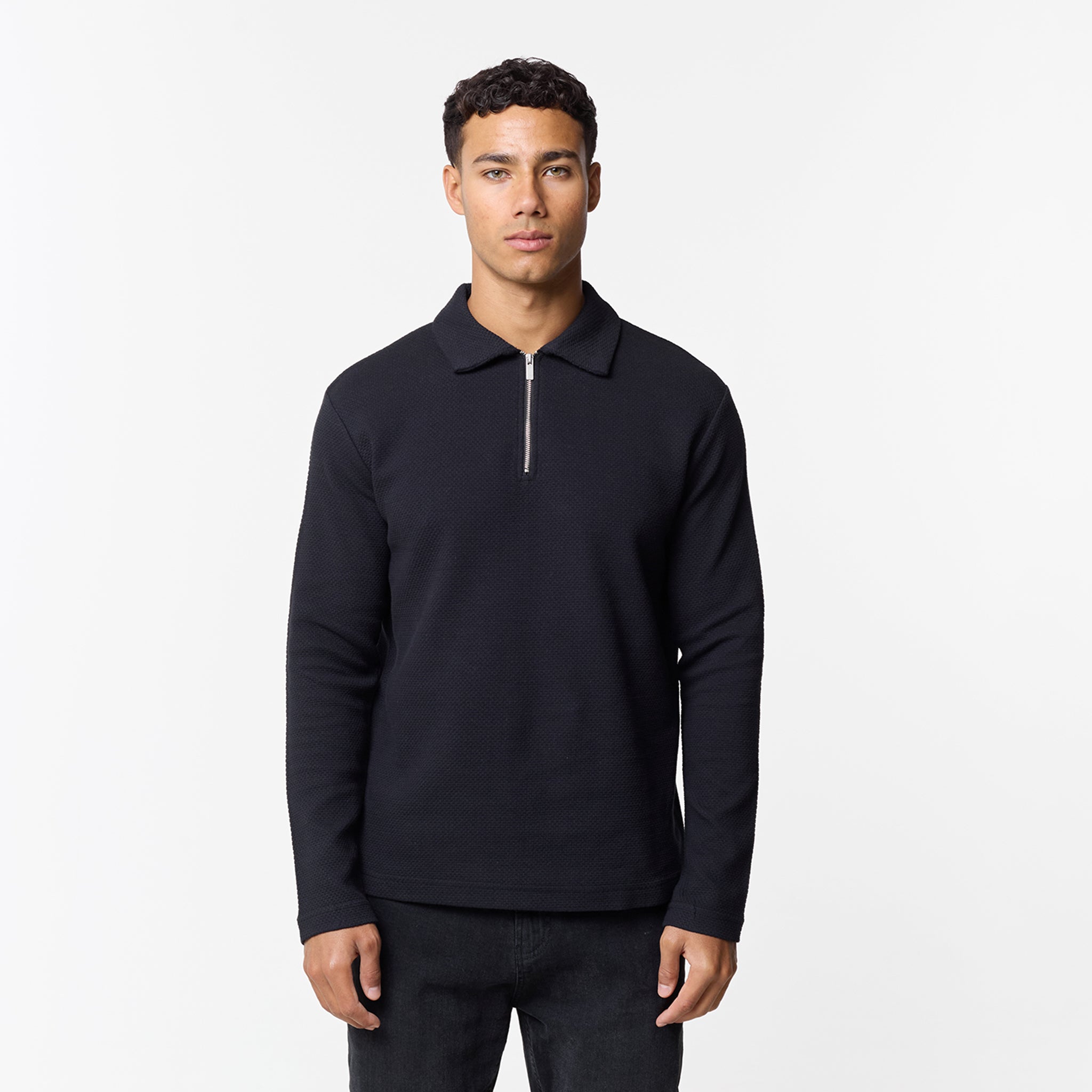 Elevate your smart-casual wardrobe with the men's black Long Sleeve Textured Polo in a timeless black shade. Crafted from a distinctive jacquard cotton fabric, this polo offers both sophisticated style and comfortable wear. It features a refined self-fabric collar and a modern 1/4 zip design with an exposed metal zip for a sleek finish. The self-turn hem and cuff provide a clean, contemporary silhouette. This versatile polo can be effortlessly styled with jeans or chinos for a polished everyday look. A subtle yet premium touch is added by the Closure metal branded clip at the hem, perfecting this versatile long-sleeved polo.