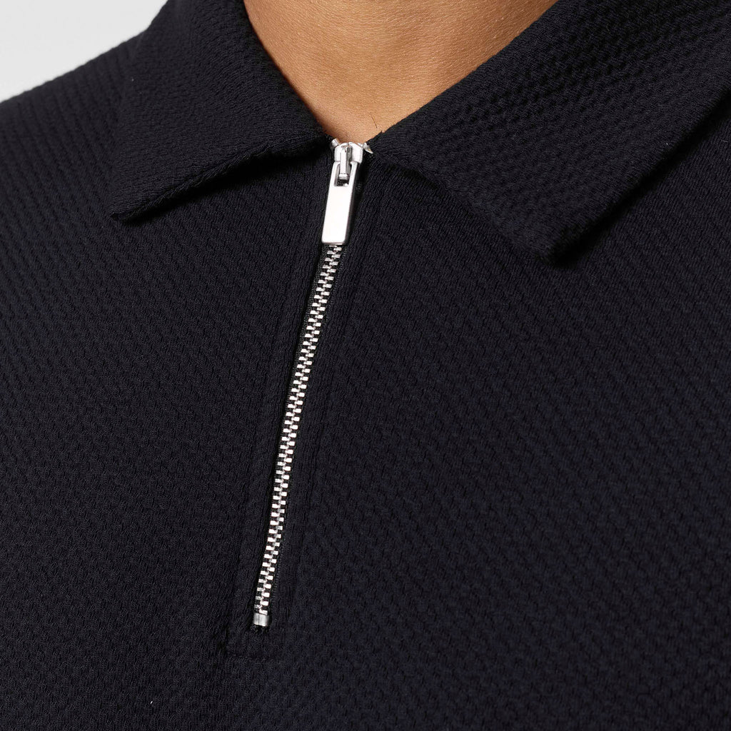 Elevate your smart-casual wardrobe with the men's black Long Sleeve Textured Polo. Crafted from a distinctive jacquard cotton fabric, this polo offers both sophisticated style and comfortable wear. It features a refined self-fabric collar and a modern 1/4 zip design with an exposed metal zip for a sleek finish. The self-turn hem and cuff provide a clean, contemporary silhouette. This versatile polo can be effortlessly styled with jeans or chinos for a polished everyday look. A subtle yet premium touch is added by the Closure metal branded clip at the hem, perfecting this versatile long-sleeved polo.