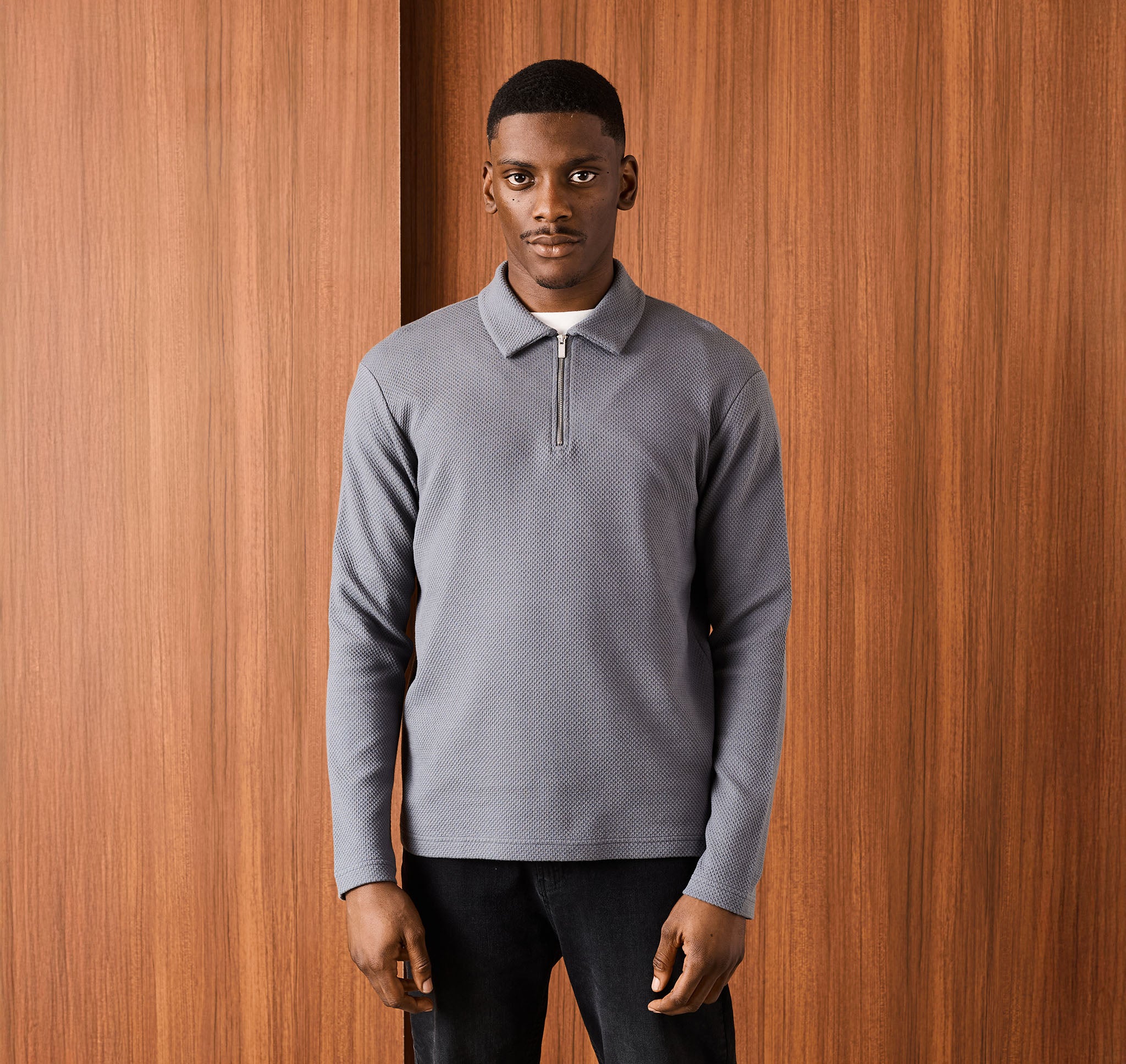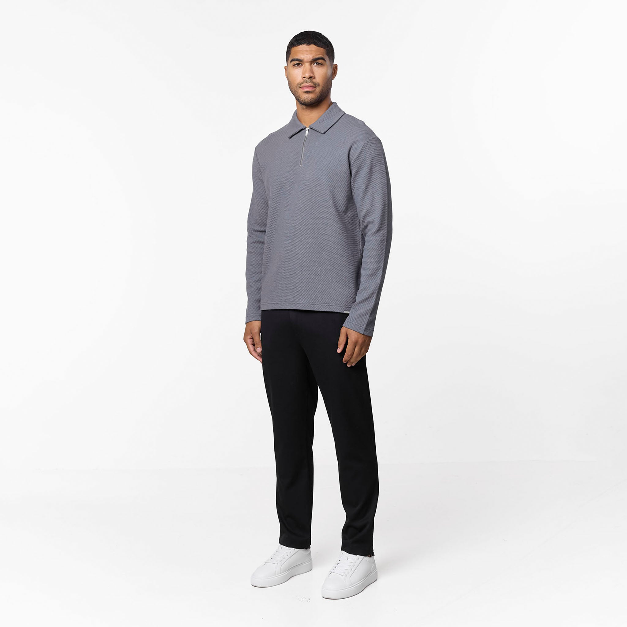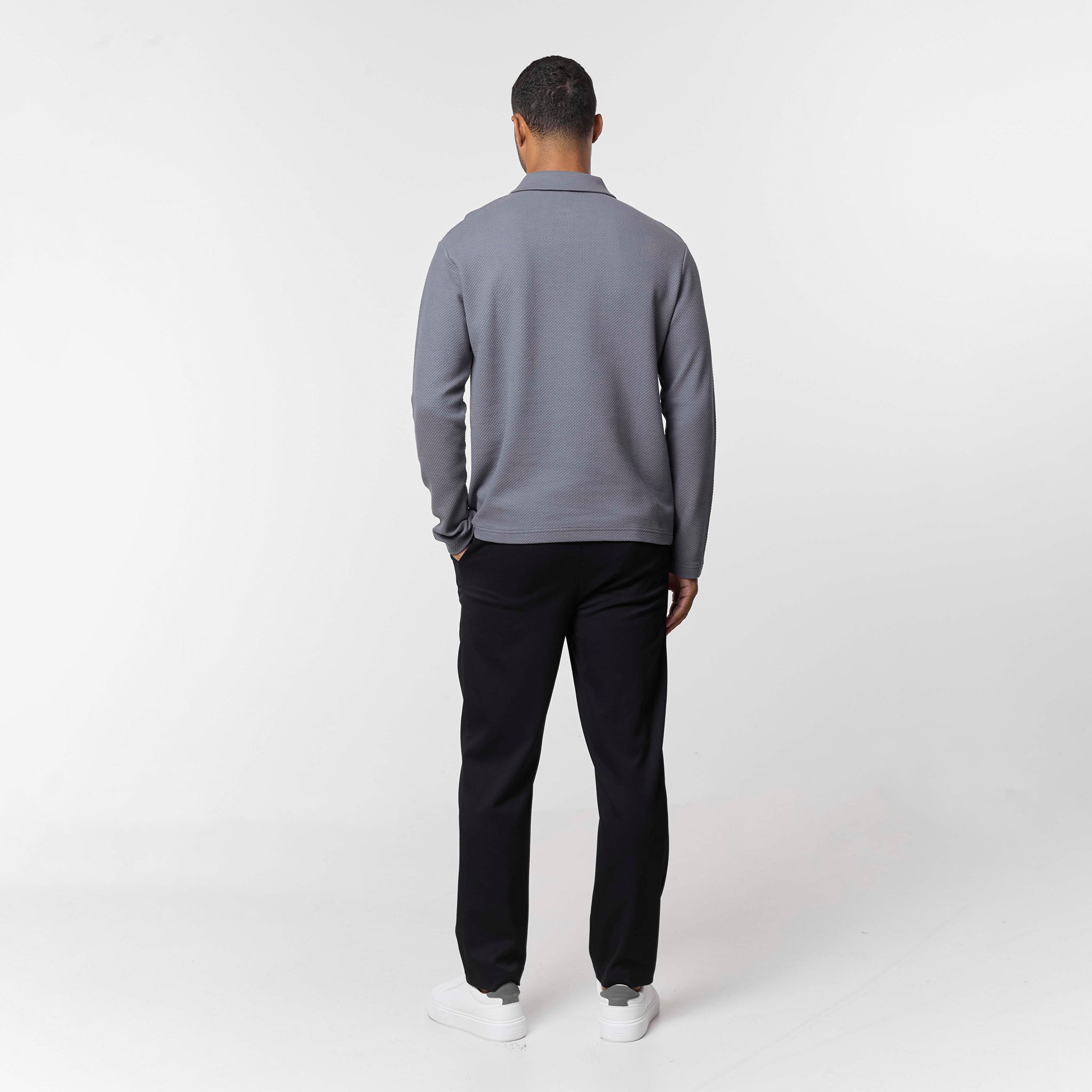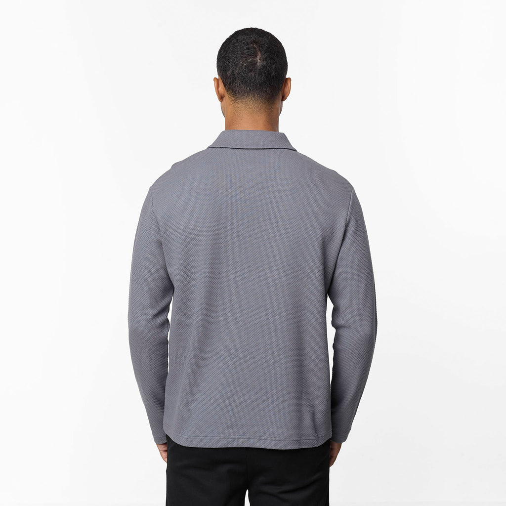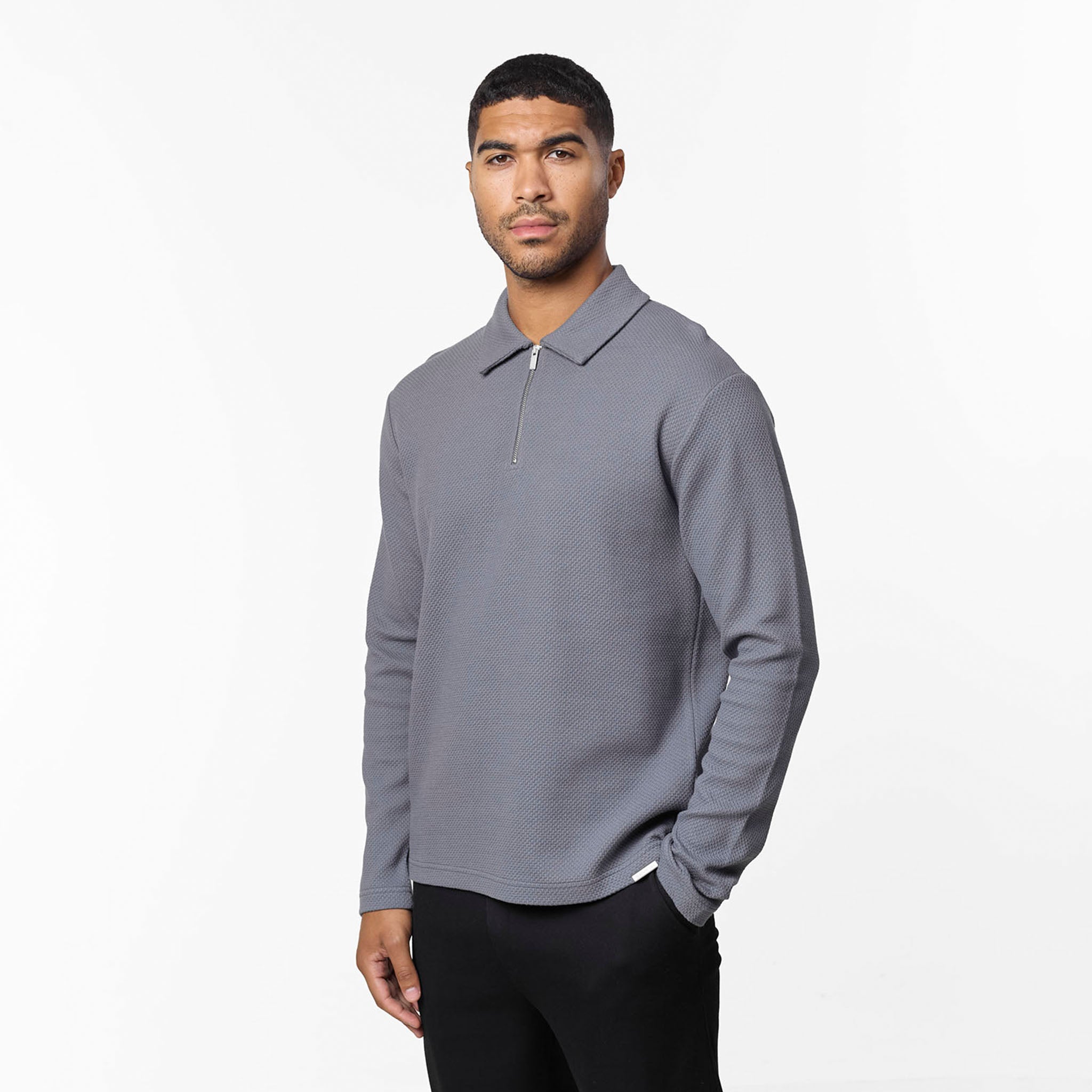 Elevate your smart-casual wardrobe with the Long Sleeve Textured Polo in a sleek mid grey shade. Crafted from a distinctive jacquard cotton fabric, this polo offers both sophisticated style and comfortable wear. It features a refined self-fabric collar and a modern 1/4 zip design with an exposed metal zip for a sleek finish. The self-turn hem and cuff provide a clean, contemporary silhouette. This versatile polo can be effortlessly styled with jeans or chinos for a polished everyday look. A subtle yet premium touch is added by the Closure metal branded clip at the hem, perfecting this versatile long-sleeved polo.