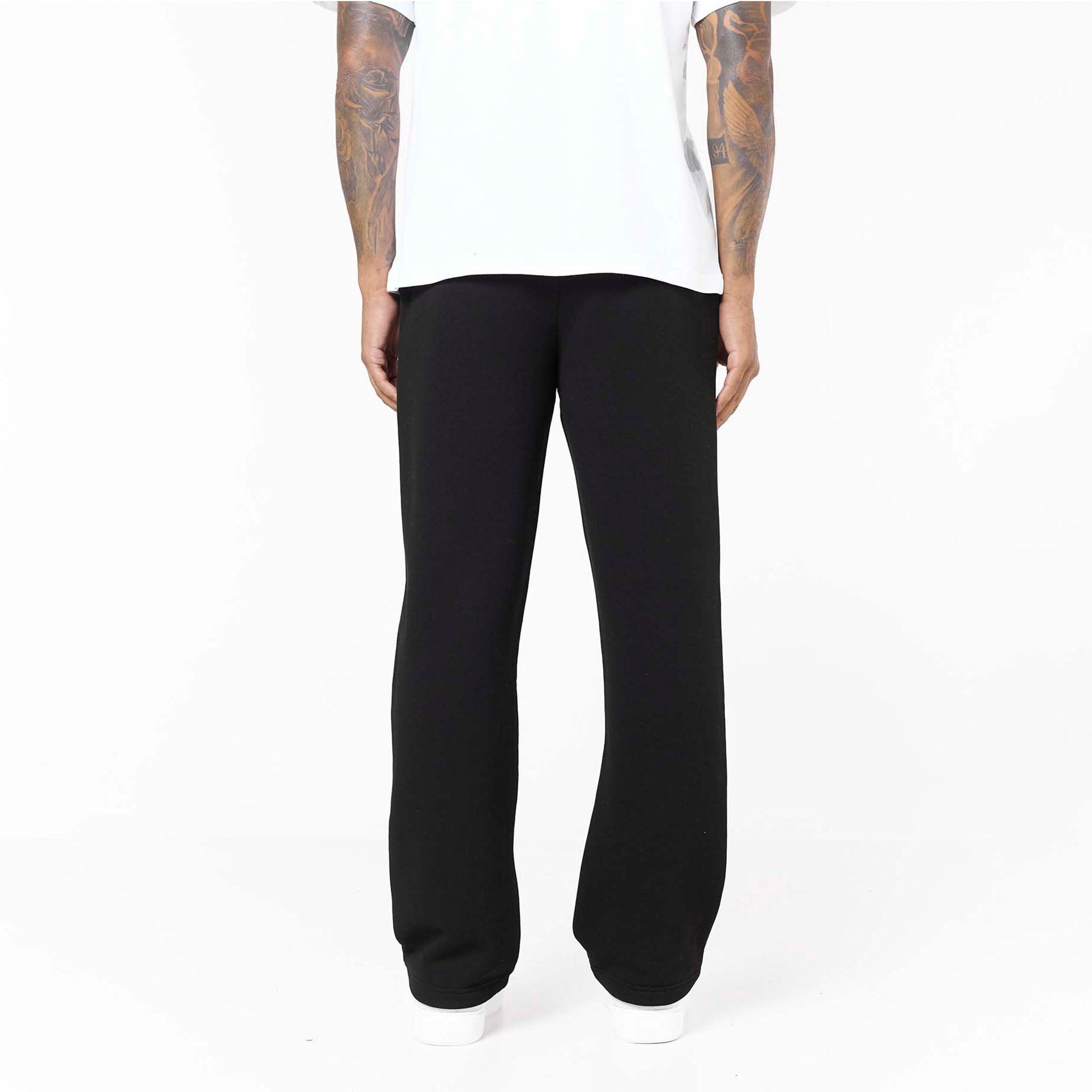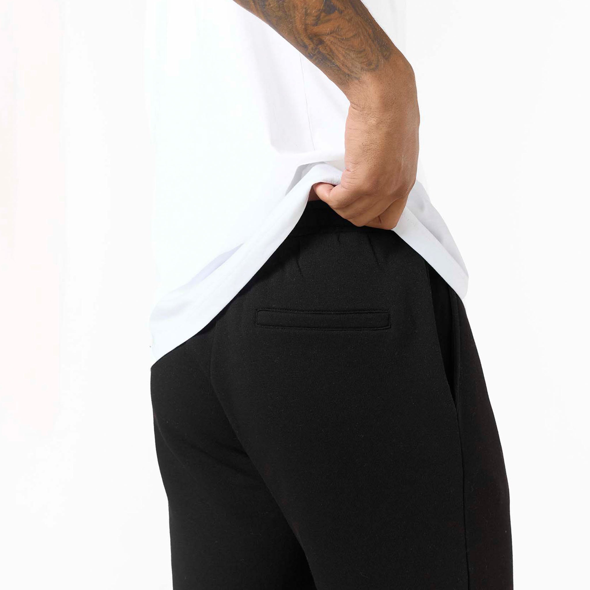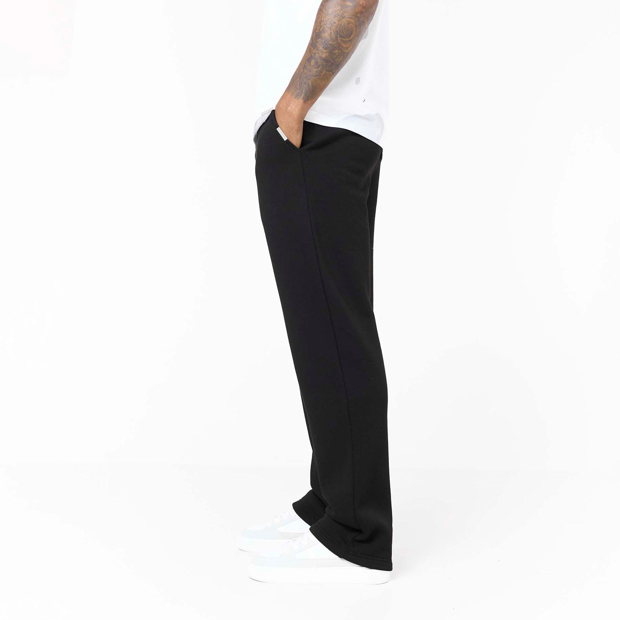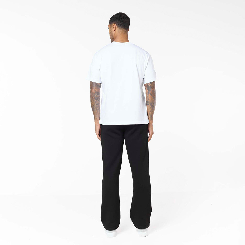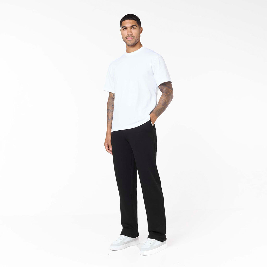 Experience versatile comfort with our Loose Fit Open Hem Joggers in sleek black. These men's joggers are designed to be a cornerstone of your wardrobe, effortlessly bridging the gap between casual ease and subtle style. They boast a contemporary open hem for a relaxed silhouette, alongside a comfortable ribbed waistband and flat internal drawcordsfor a custom fit. Functional slant pockets, accented with a discreet branded metal tab. With their clean self-turn cuffs, these black joggers offer a refined, streamlined look that pairs perfectly with laid-back tees or teamed with an essential full zip or box fit hoodie.
