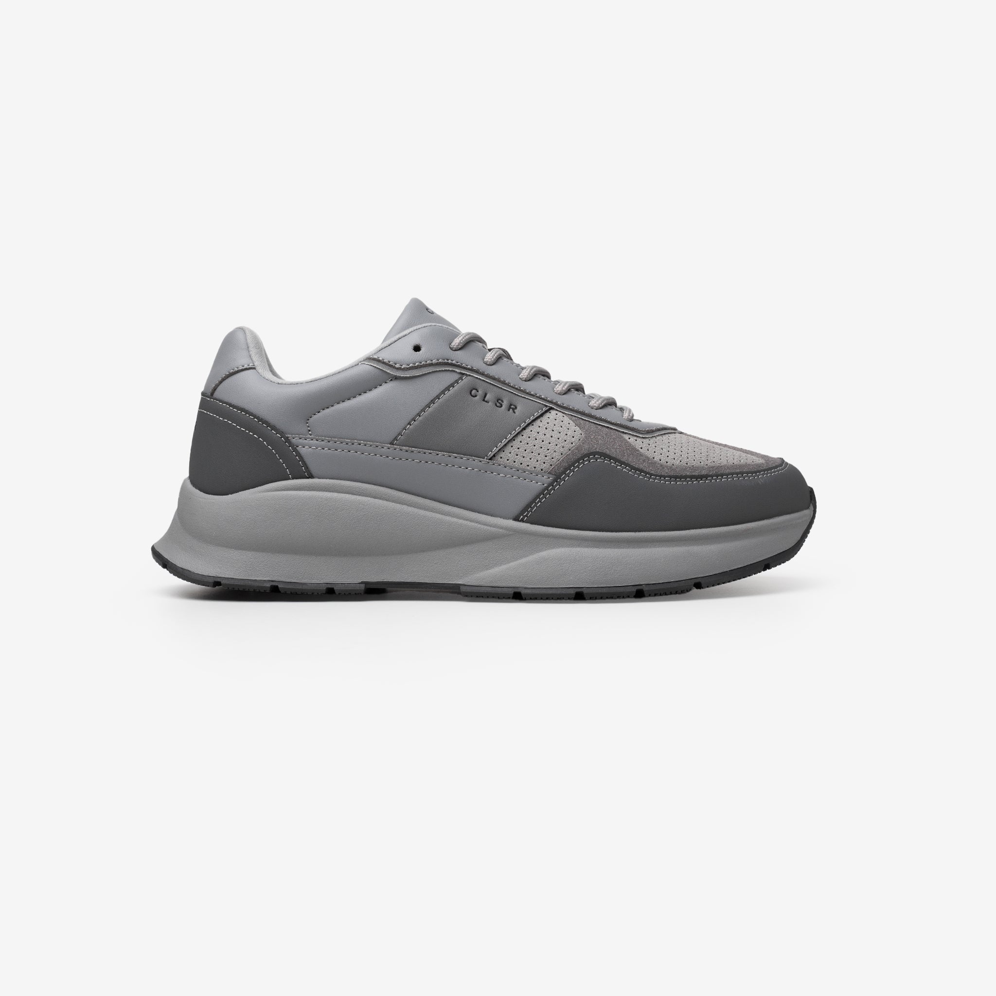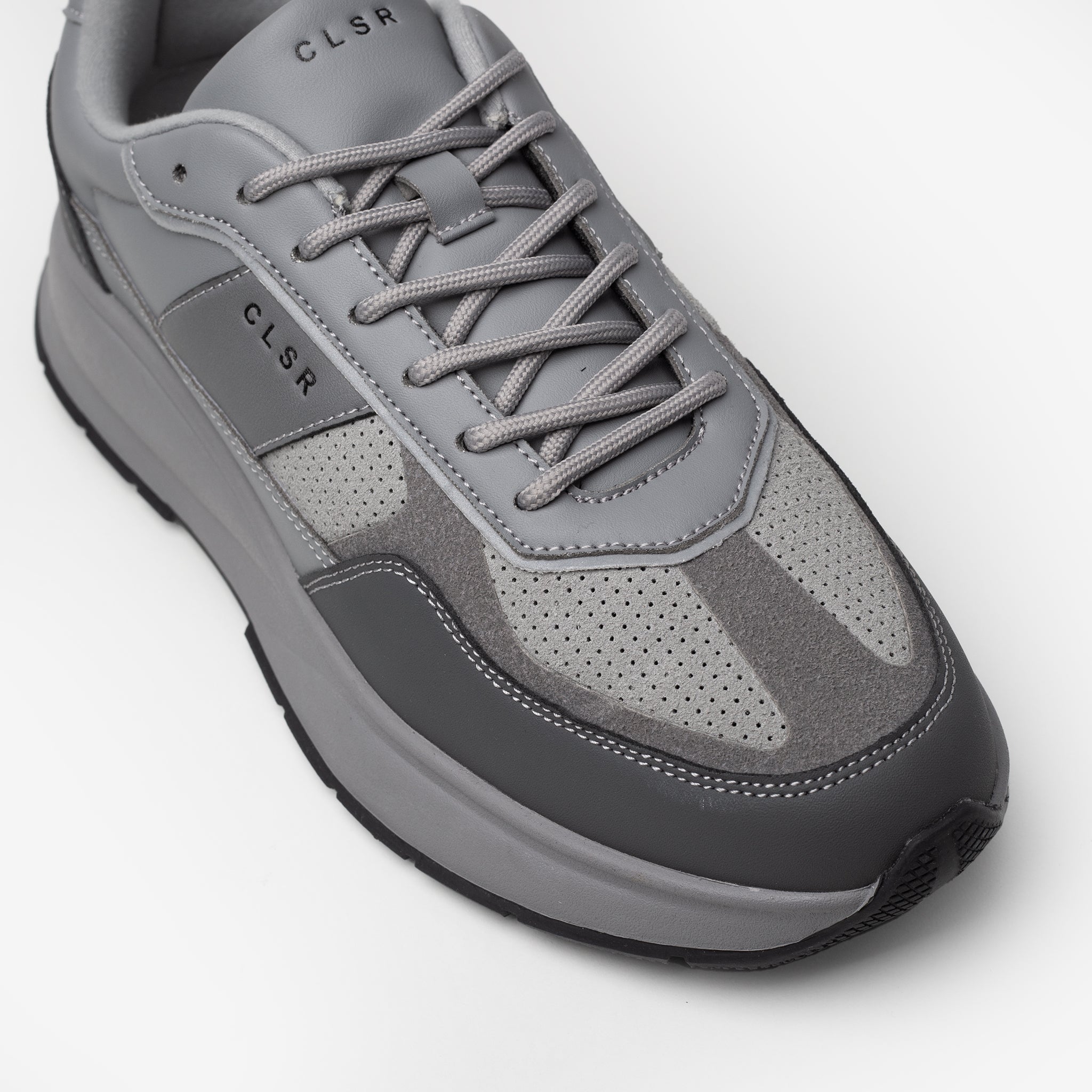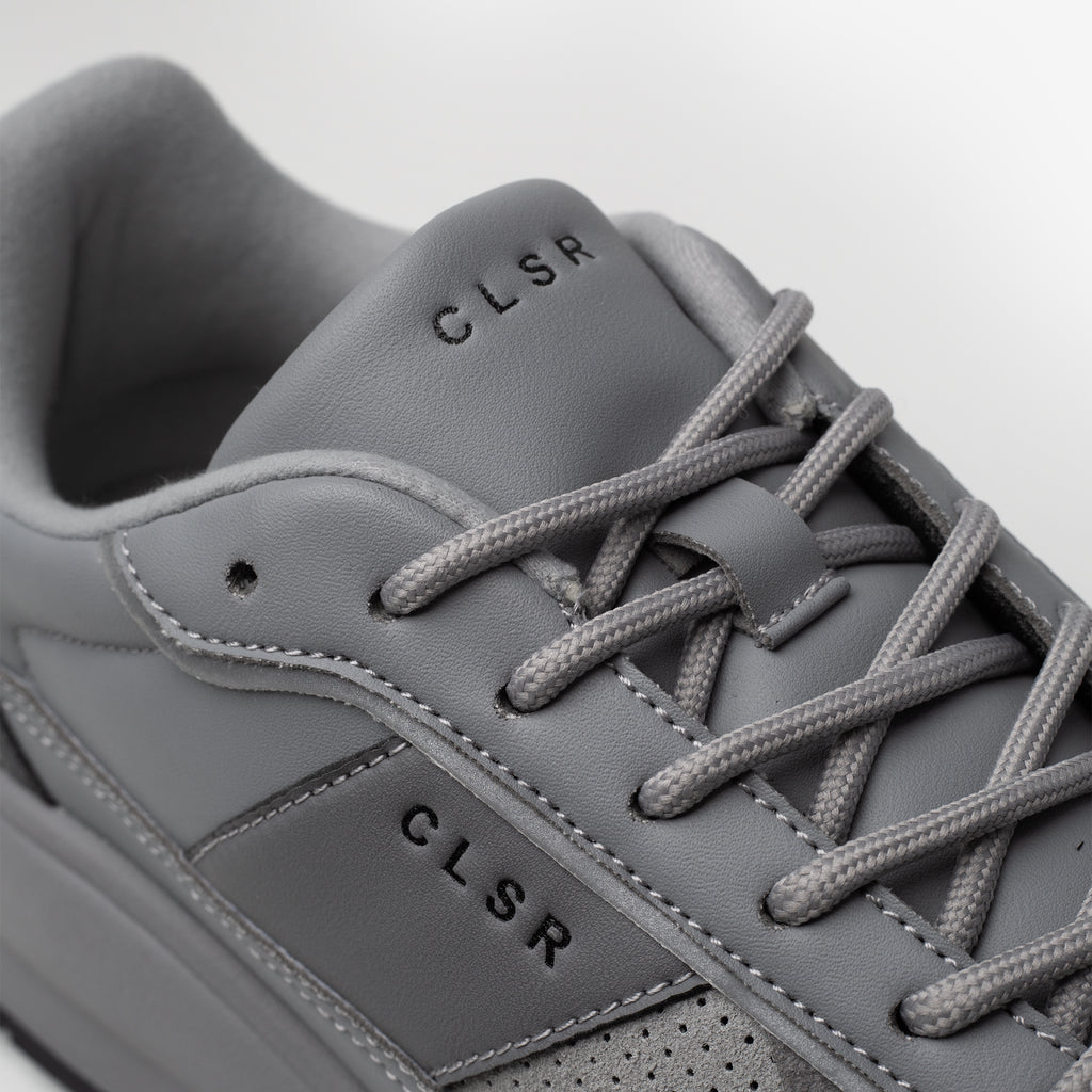 Discover the Premium Runner in grey, where timeless aesthetics meet cutting-edge design for your daily life. Engineered with advanced technical construction and premium materials, this unique trainer delivers unparalleled comfort. Details like perforated suede, technical CLSR tongue taping, and a debossed signature Closure logo set it apart. Finished with Closure LDN insole branding and a custom premium rubber sole, it's the ultimate blend of form and function. Dress it up with cargo pants or keep it casual with a fleece tracksuit ; the Premium Runner adapts to your every move, offering a sporty yet sophisticated edge.