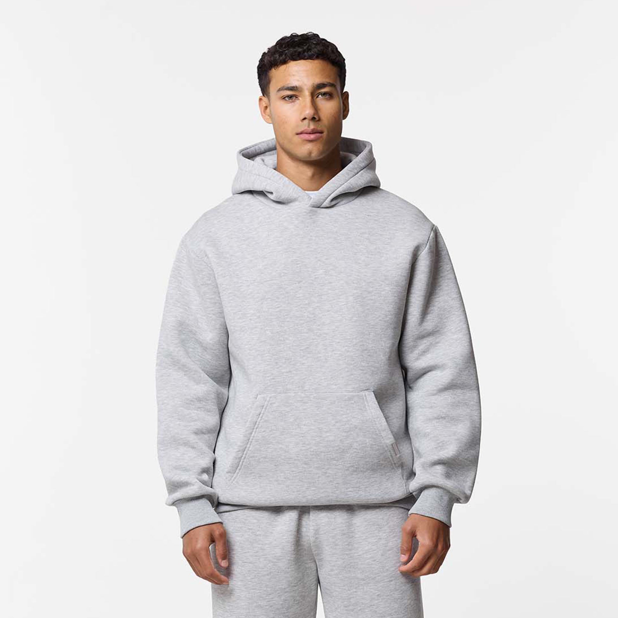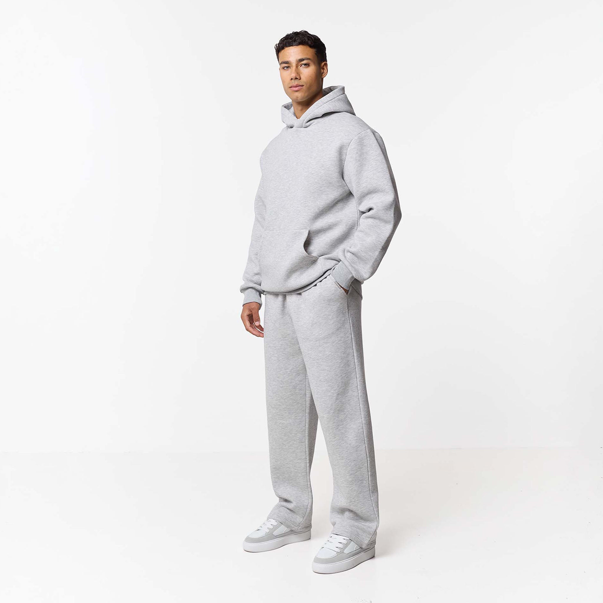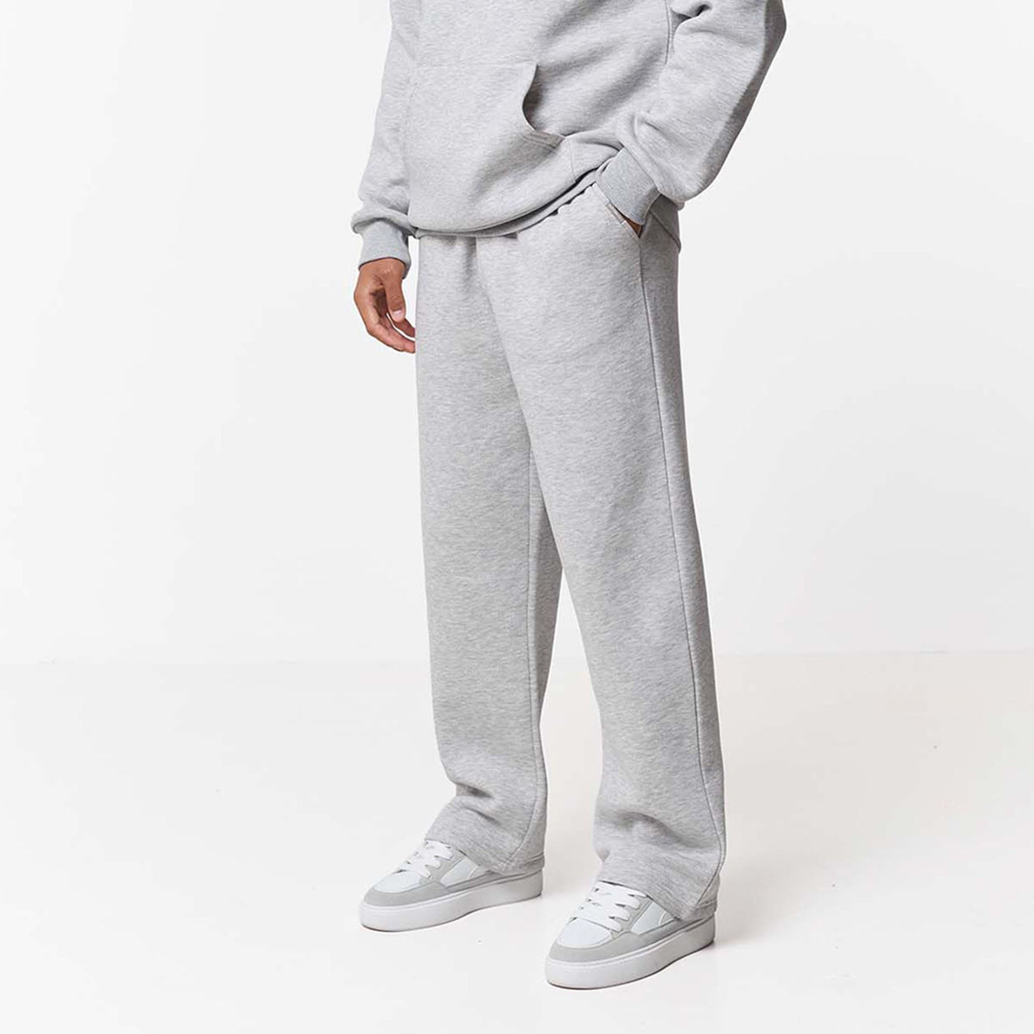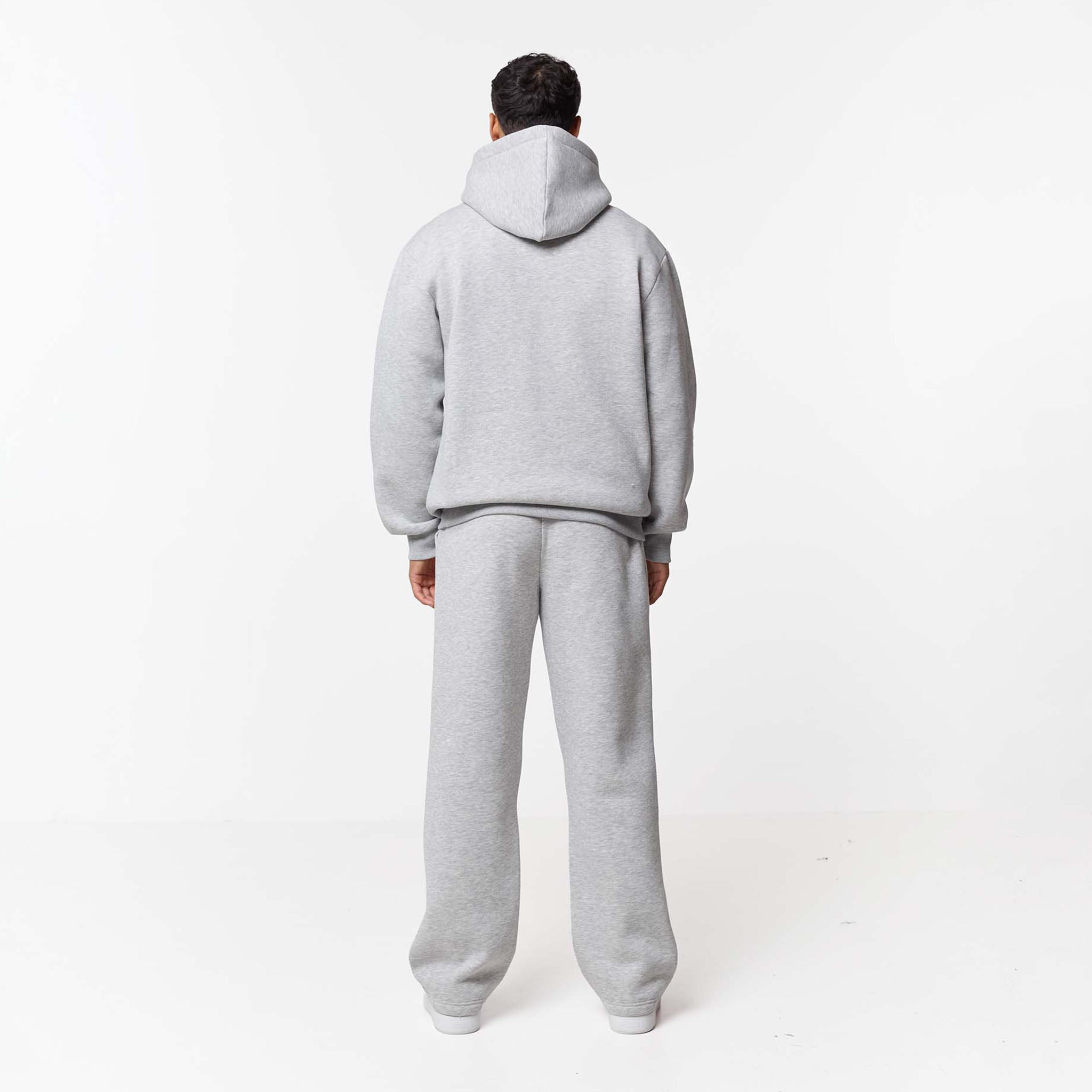 Introducing the Relaxed Fit Loose Open Hem Tracksuit in grey marl, this style blends a streetwear silhouette with sophisticated lounging aesthetic. The hoodie features a classic kangaroo pocket elevated by a signature branded metal clasp, while ribbed trims maintain a structured finish. Paired with coordinating loose-fit joggers, the set offers a clean aesthetic through self-turn cuffs and flat internal drawcords, finished with refined rear welt pockets and branded metal tabs for a cohesive, premium look.