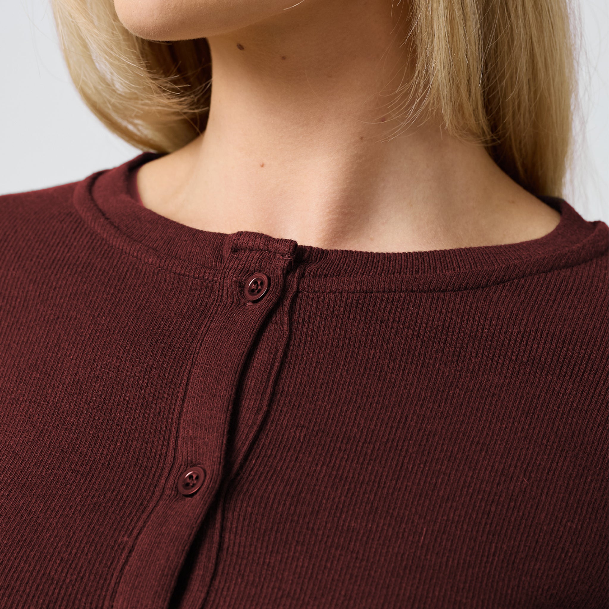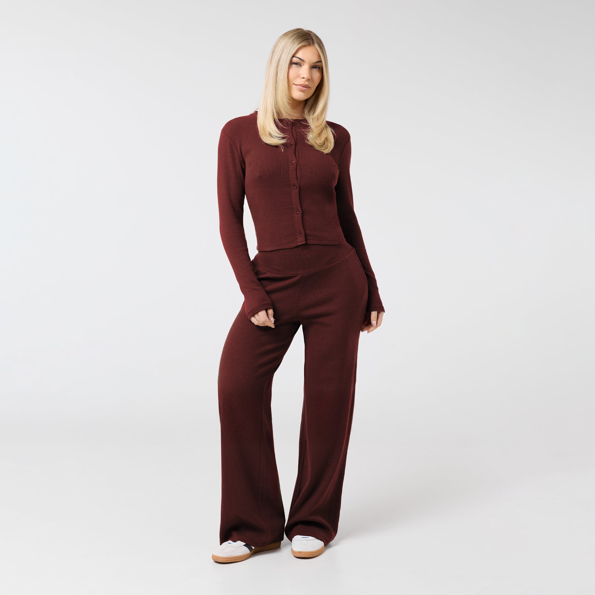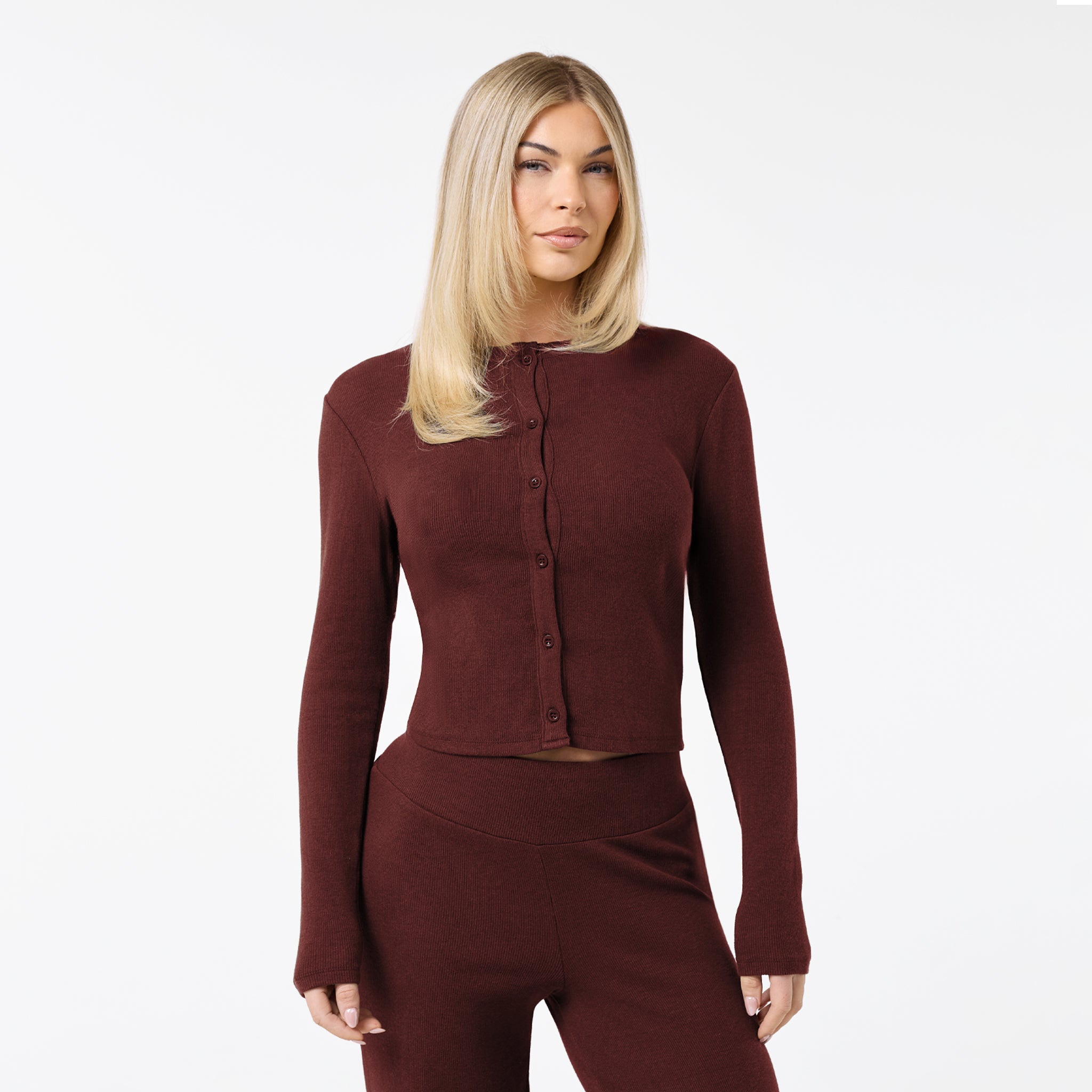 Introducing the new season Ribbed Button Up Top in an on-trend burgundy shade. Designed to combine modern style with incredible comfort, it features a classic crew neck, long sleeves, and a secure button-front closure. Expertly crafted from a soft, stretchy fabric blend, this top is finished with durable twin-needle stitching for lasting wear. The deep burgundy tone provides a refined and contemporary alternative to traditional neutrals, ensuring a polished look that teams perfectly with the matching trousers.