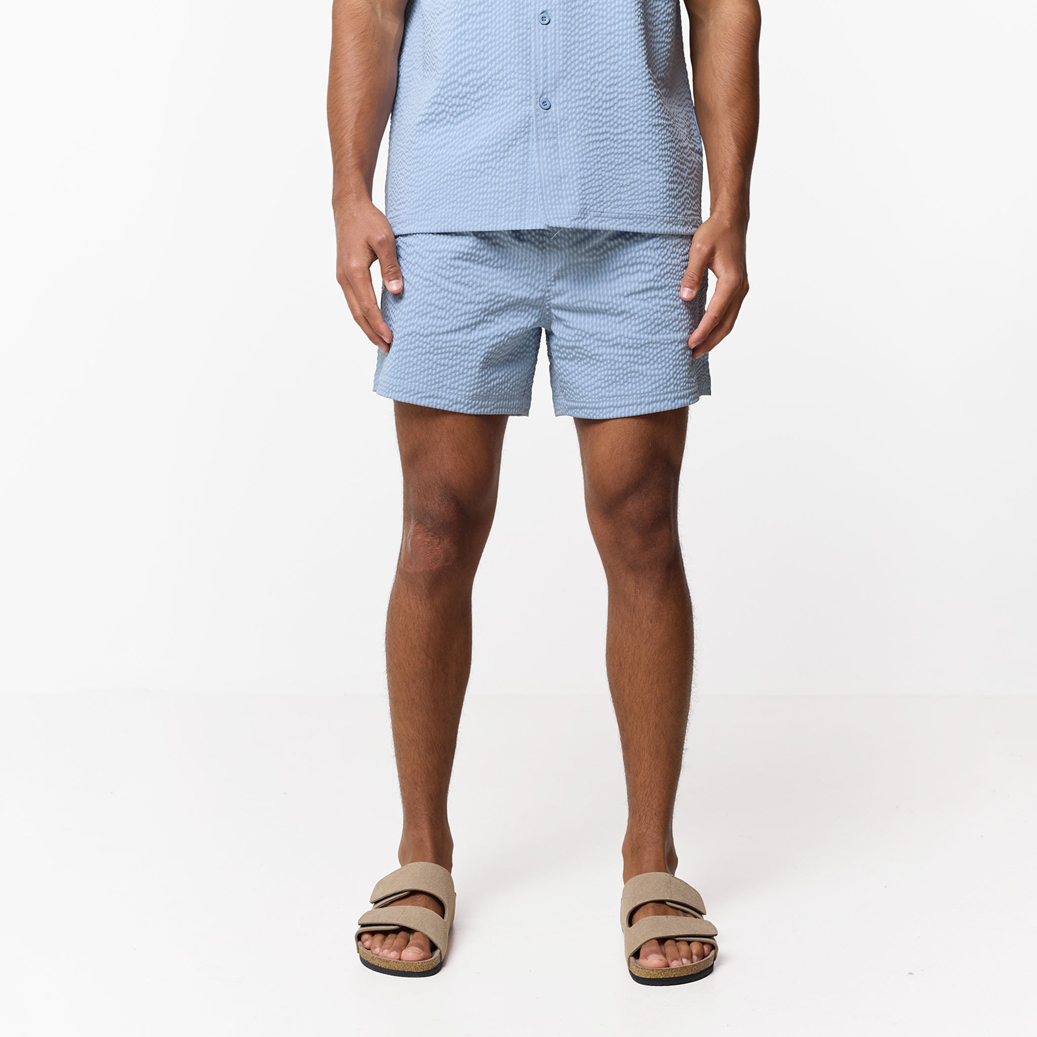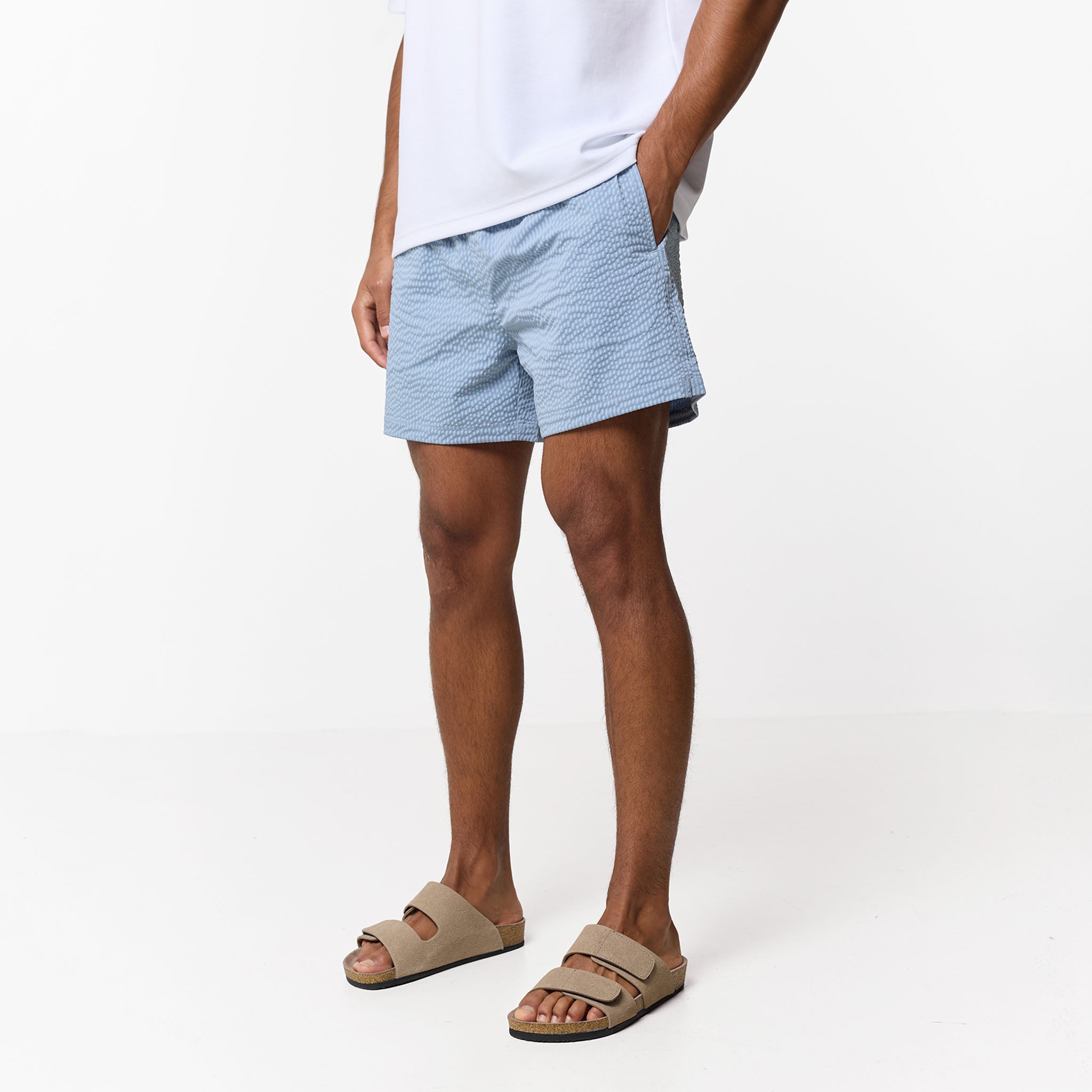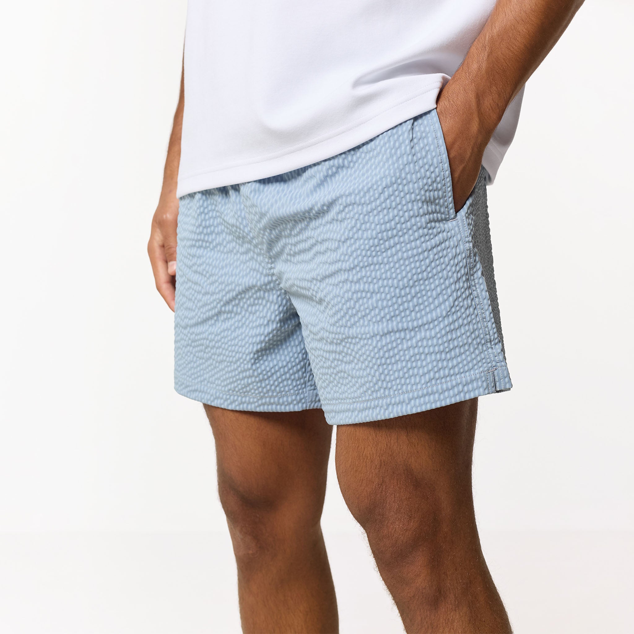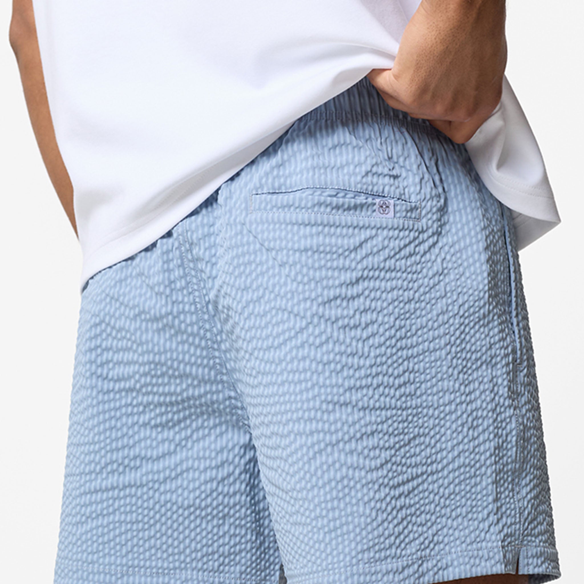 Experience effortless resort style with the signature Light Blue Seersucker swim shorts, a summer essential designed to coordinate effortlessly with the matching resort shirt for a polished, head-to-toe ensemble. These shorts prioritise both comfort and longevity, featuring a breathable internal mesh lining and a sleek, integrated waistband secured by embroidered eyelets and a rugged, rubber-tipped tubular drawcord. Smartly integrated slanted side pockets and a classic rear patch pocket detailed with our iconic woven branding offer convenient storage for your essential. From coastal dips to alfresco dinners, these sky-blue are a must-have for refined summer style.